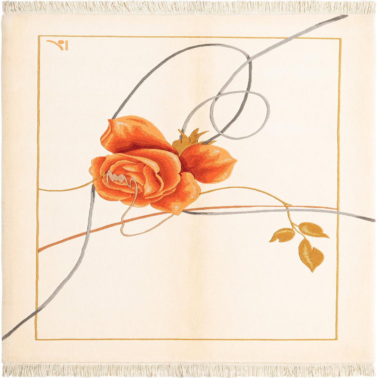 A 4x6 rectangular Darya rug with an ivory background, featuring a large orange floral design with brown leaves and abstract gray lines, framed by a thin brown border.