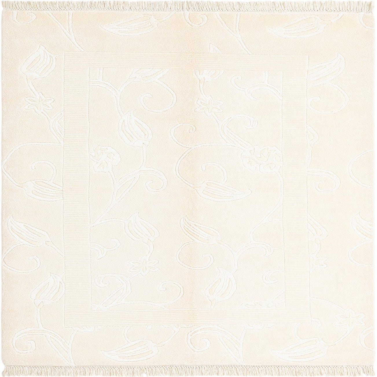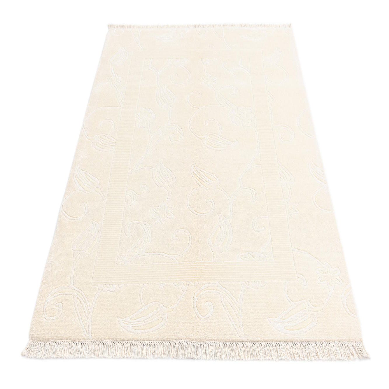 A 4x6 rectangular Darya rug in cream and ivory, featuring a subtle Persian floral pattern with a border and fringe.
