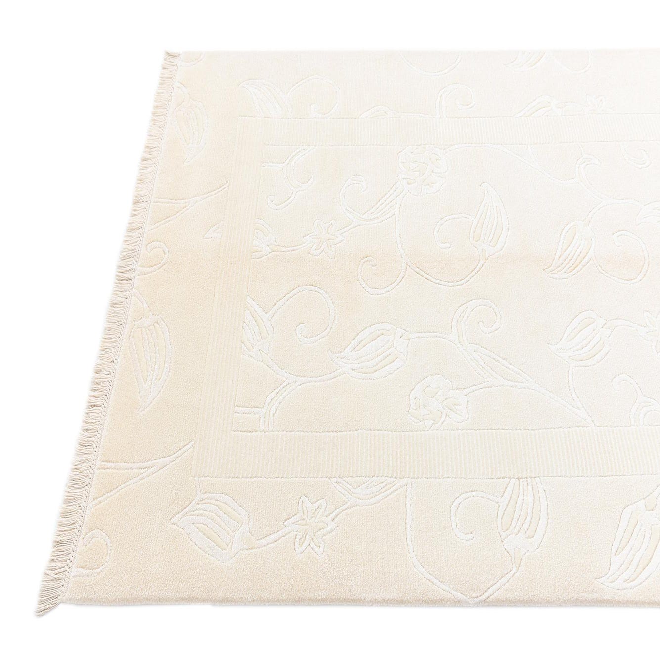The Darya collection presents a sophisticated 4x6 hand-made rug crafted from a blend of wool and cotton. This piece showcases a refined beige background, complemented by soft ivory accents forming an elegant botanical pattern. The texture is inviting, woven to create a tangible sense of comfort and luxury underfoot.