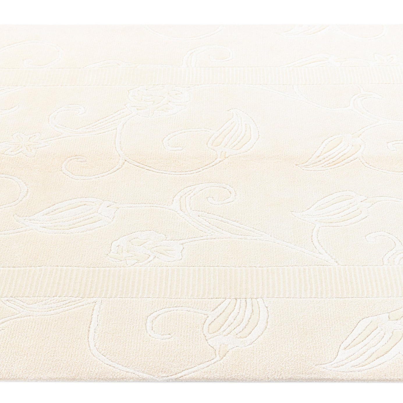The design features a graceful floral and vine motif, framed by a simple yet distinguished border. The neutral palette ensures versatility, making this rug a well-suited addition to a variety of interior design scenarios. Its subdued tones and delicate pattern enable it to complement spaces with minimalist, Scandinavian, or even transitional decor effortlessly. This rug provides a serene foundation for living areas, bedrooms, or home offices seeking a touch of understated elegance.