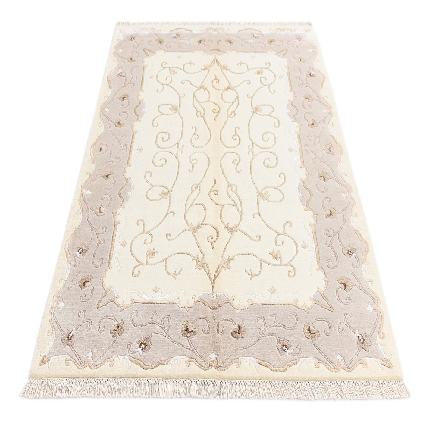A 4x6 rectangular Darya rug in ivory and tan, featuring a modern Persian floral pattern with a high pile.