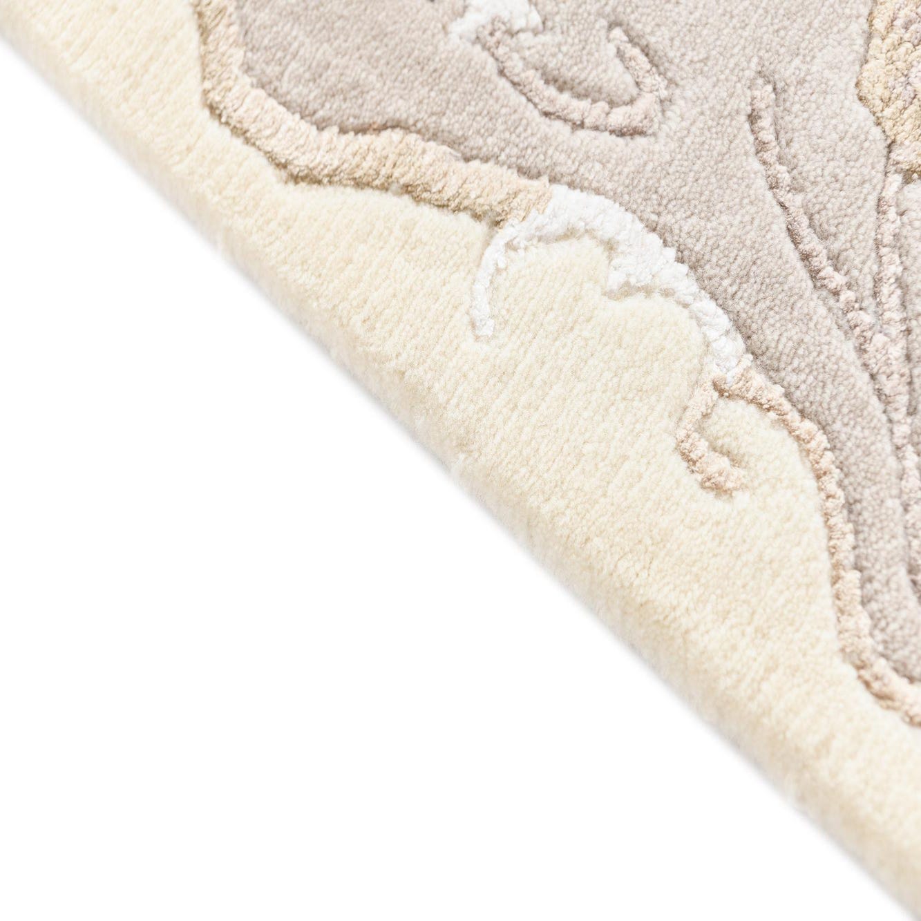 The raised texture of the design elements offers a tactile dimension and visual contrast against the flat-weave background, enhancing the intricate detailing. The soft wool contributes to a comfortable underfoot experience, while the cotton ensures durability, making this rug suitable for moderate-traffic areas.