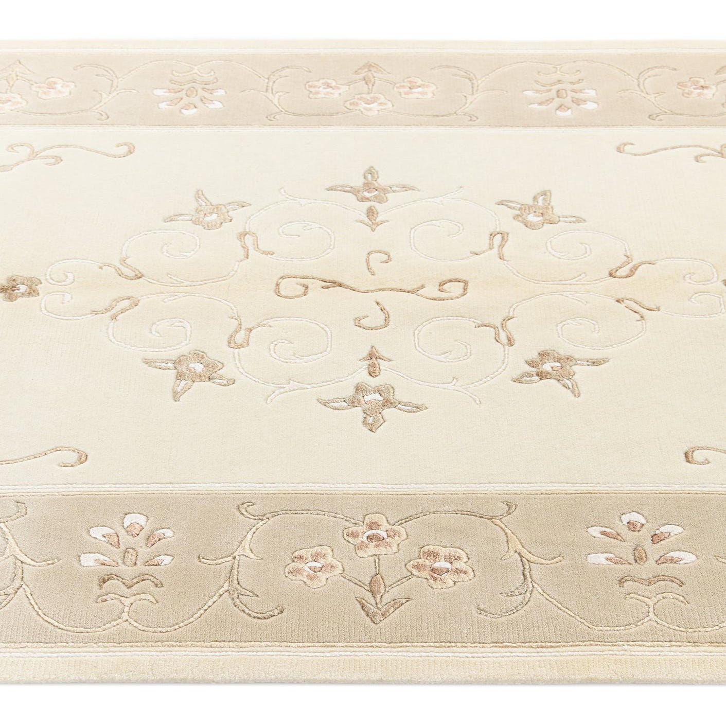 A 4x6 rectangular Darya rug with a cream center and tan border, featuring elegant floral and vine patterns.