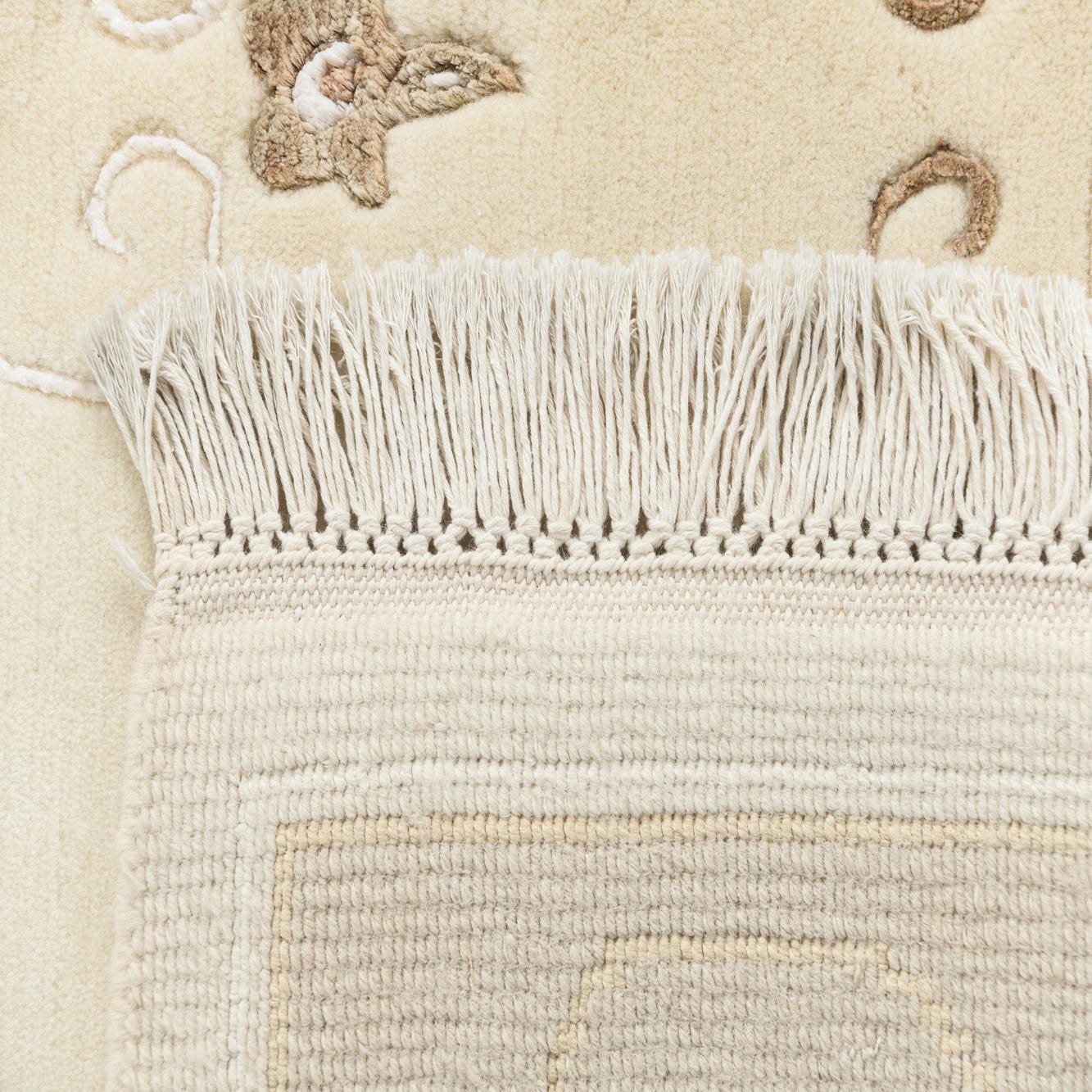 The texture of this rug brings an extra dimension of comfort, while its hand-made construction ensures each piece is unique. The incorporation of both wool and cotton contributes to the rug's longevity and tactile appeal, making it a practical and stylish addition to any design scheme.