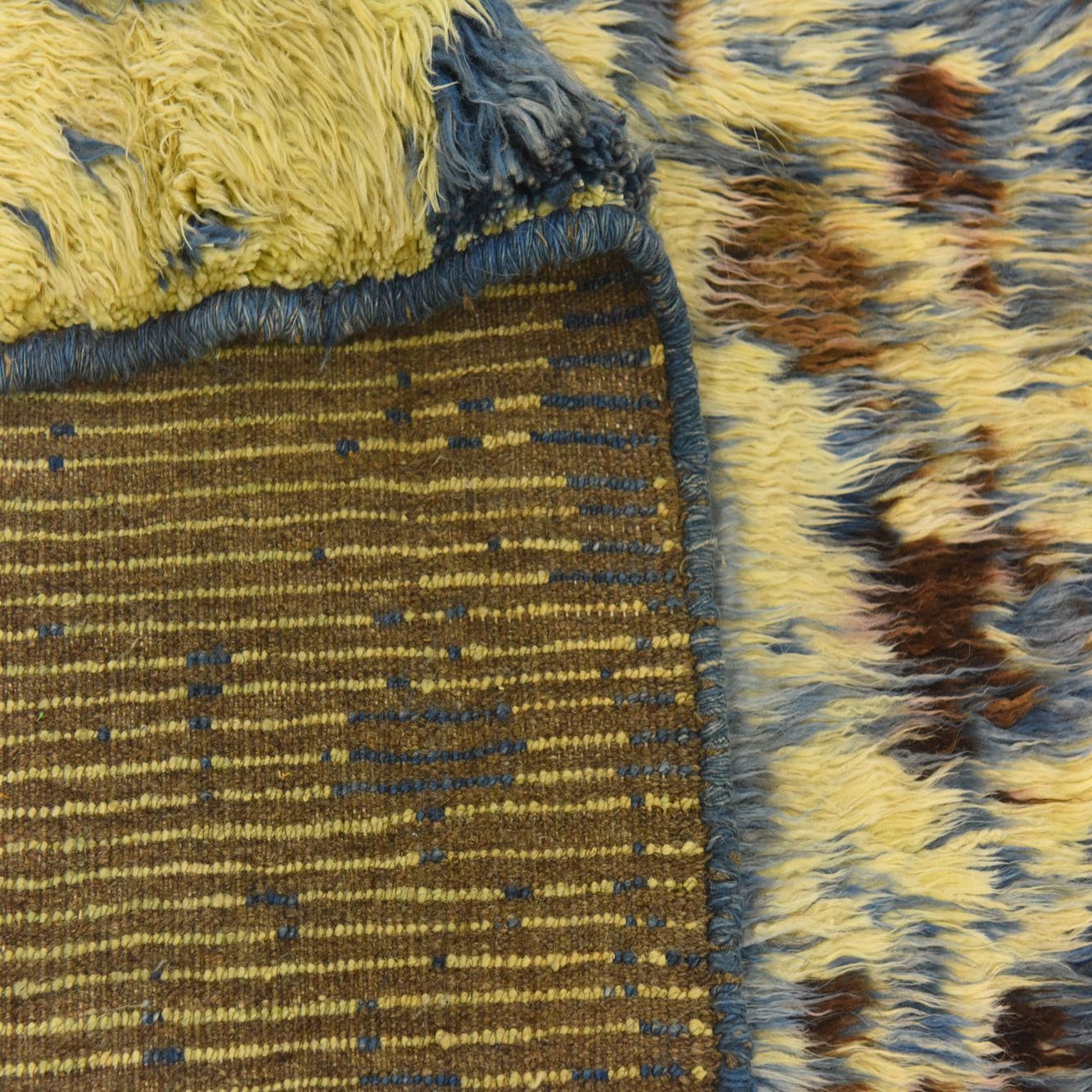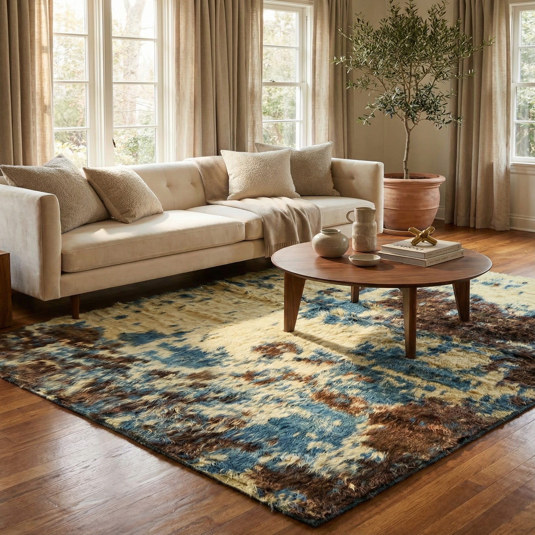 This piece works well in a range of interiors — layer it in a living room to anchor a neutral linen sofa and warm wood furnishings, place it in a bedroom to add cozy texture against pale bedding, or use it in a relaxed study or bohemian lounge paired with leather seating and mixed-metal accents. The beige, brown and blue palette pairs naturally with natural materials, mid-century silhouettes, and coastal-inspired or rustic-modern schemes.
