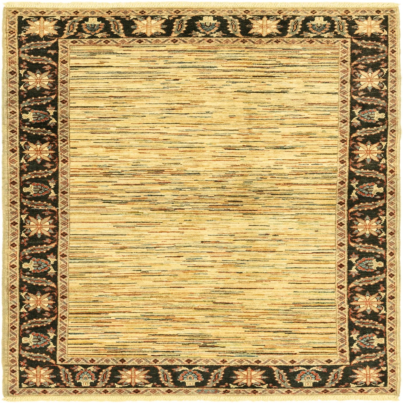 A 4x6 rectangular Darya rug with a tan and brown striped field, framed by a dark brown border with traditional floral and geometric patterns.