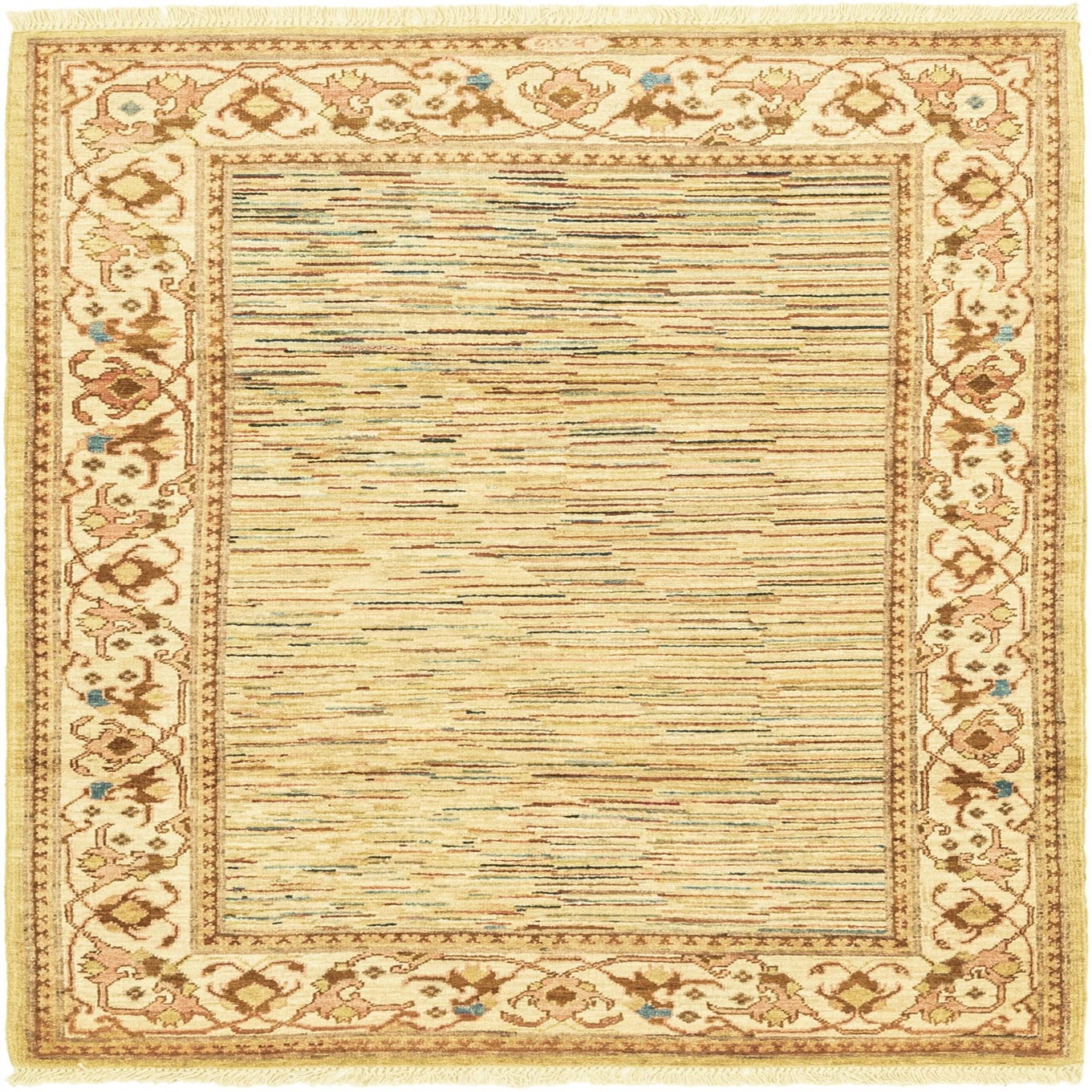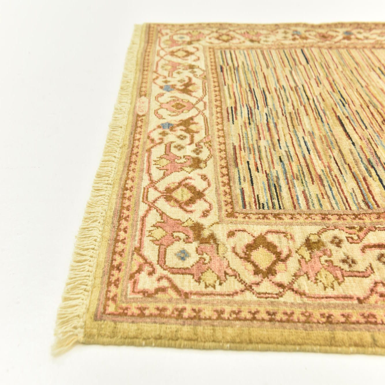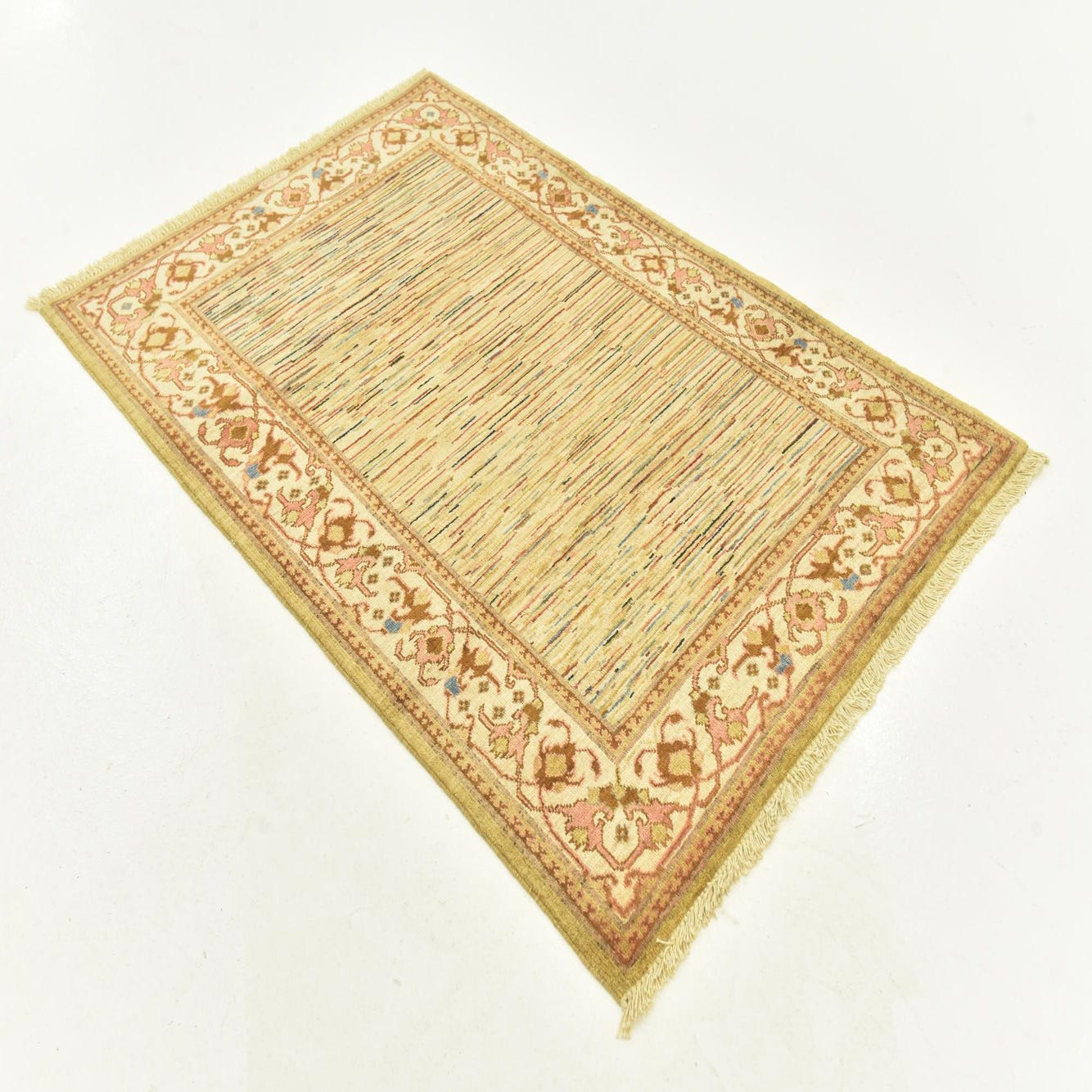 The Darya Collection presents a hand-knotted 4x6 area rug made from 100% hand-spun wool, offering a harmonious blend of durability and softness underfoot. This particular piece hosts a primarily beige background imbued with tastefully scattered hues of blue, brown, ivory, red, and peach, creating a subtle yet captivating visual appeal. Traditional motifs adorn the border, encapsulating an elegant array of linear striations that bring depth and texture to the field.