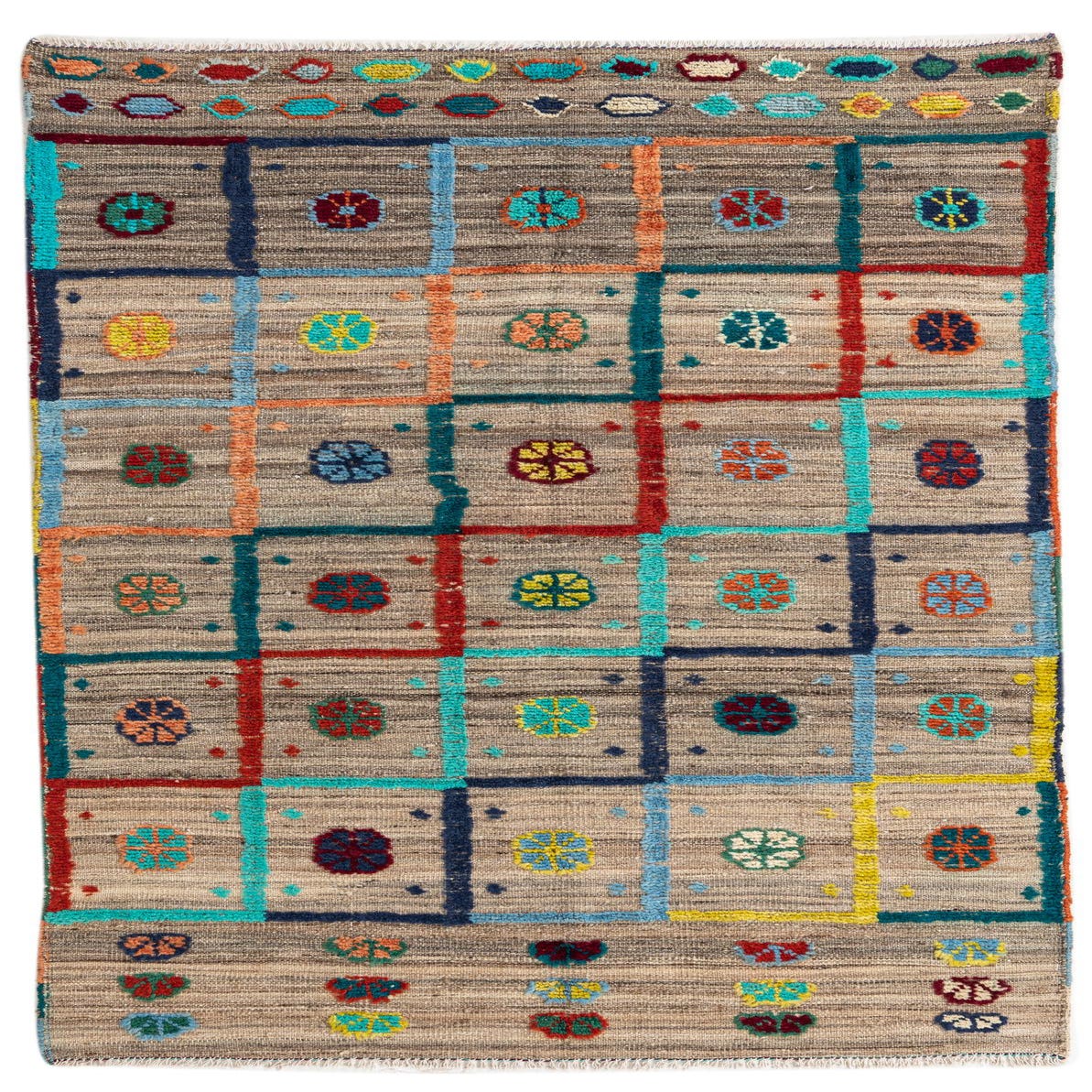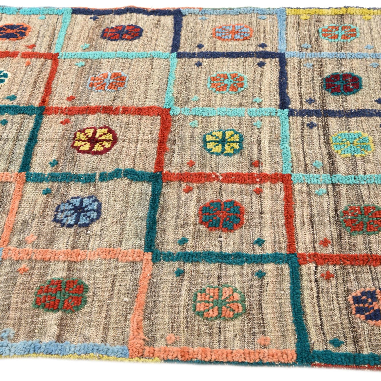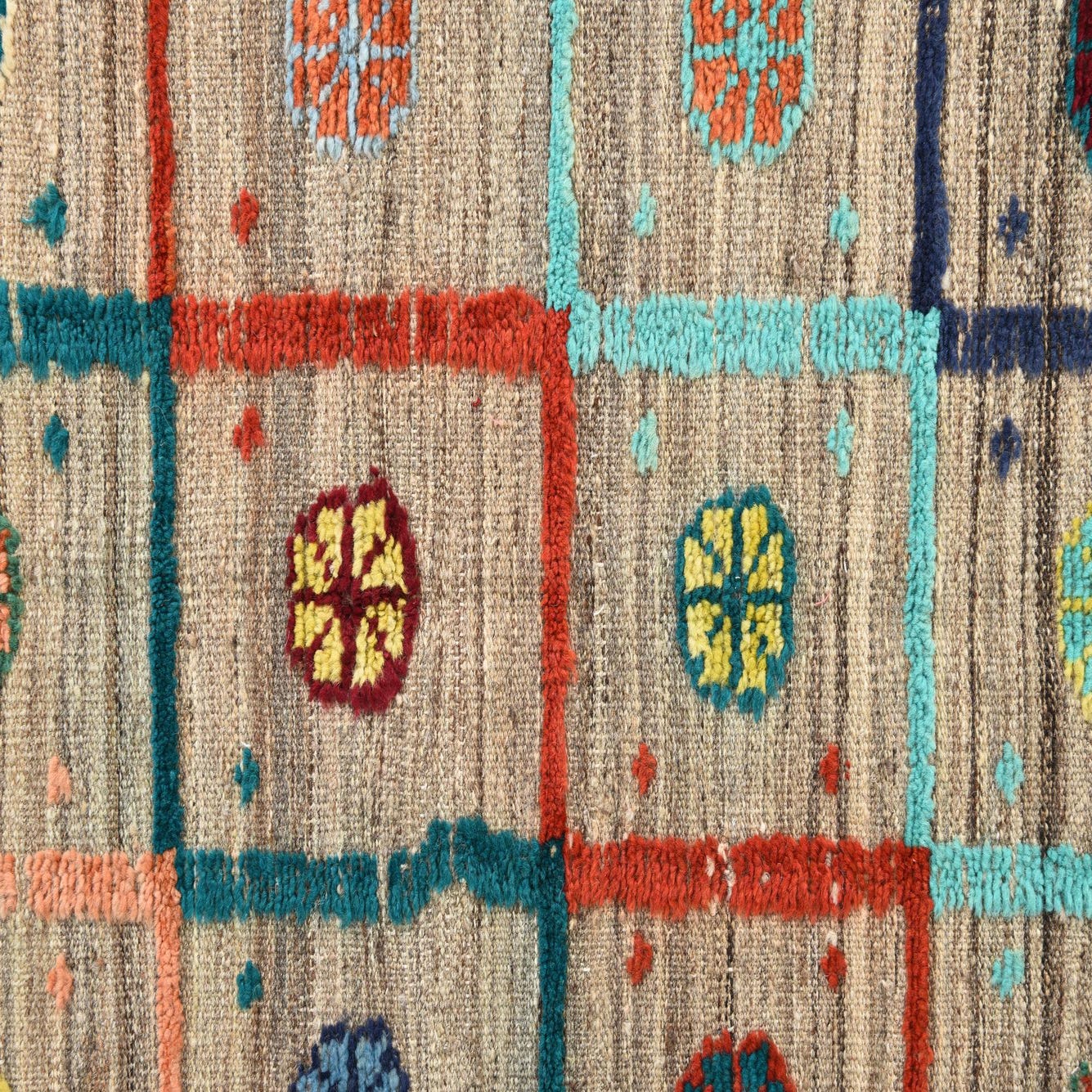 Primary color is Beige. Colors in this rug include: Beige, Blue, Brown, Burgundy, Light Blue, Light Brown, Light Green, Light Salmon, Yellow, Rust Red, Red, Olive, Orange.