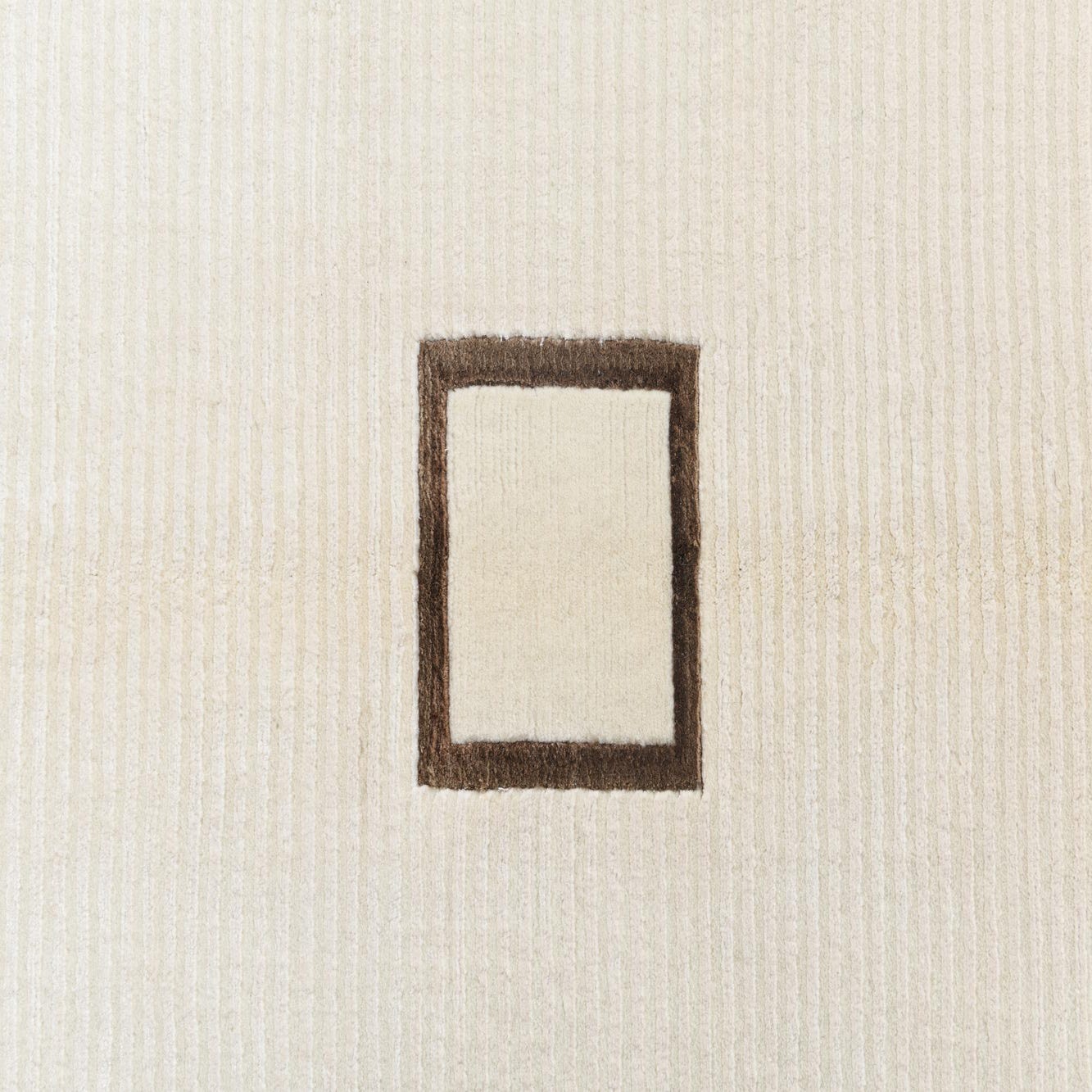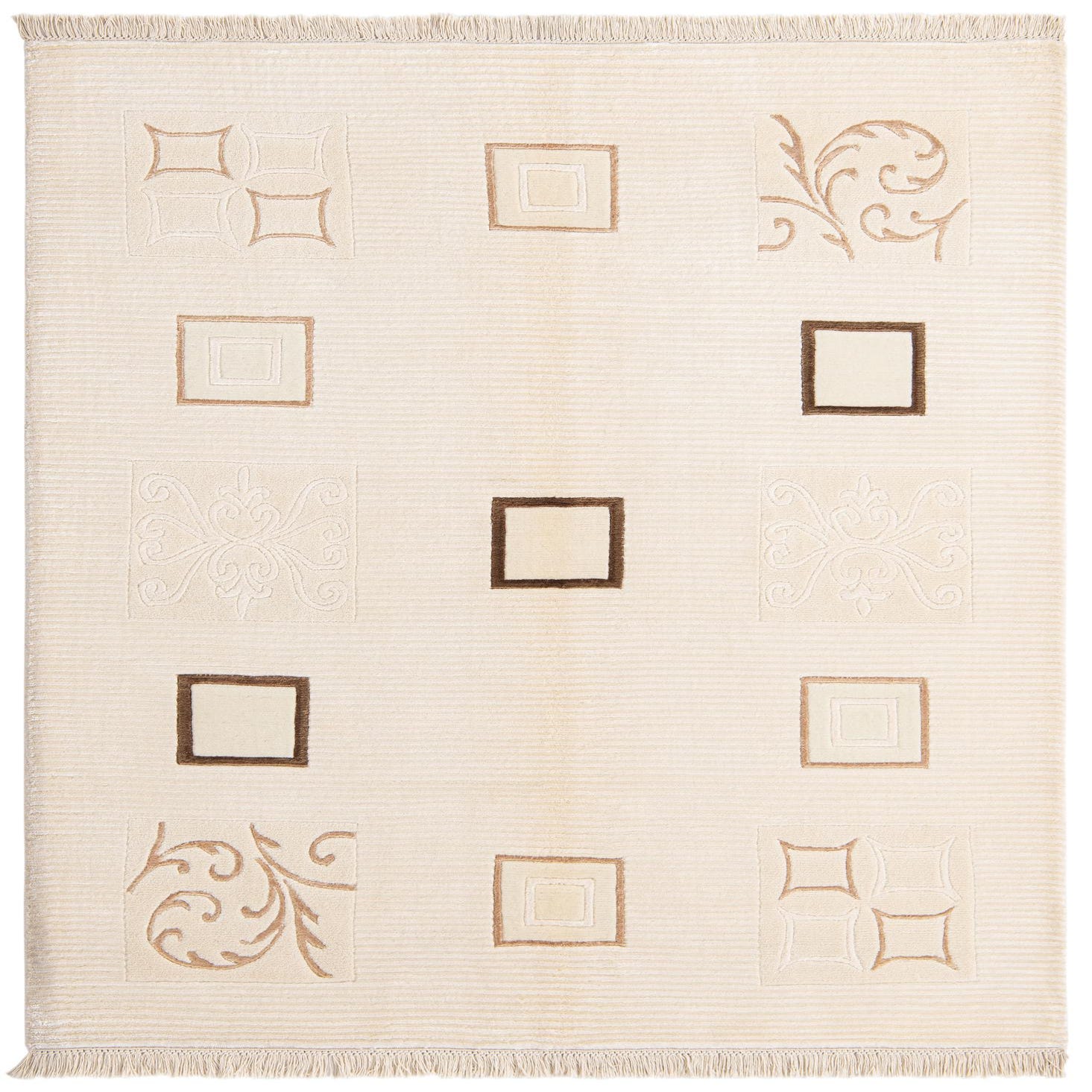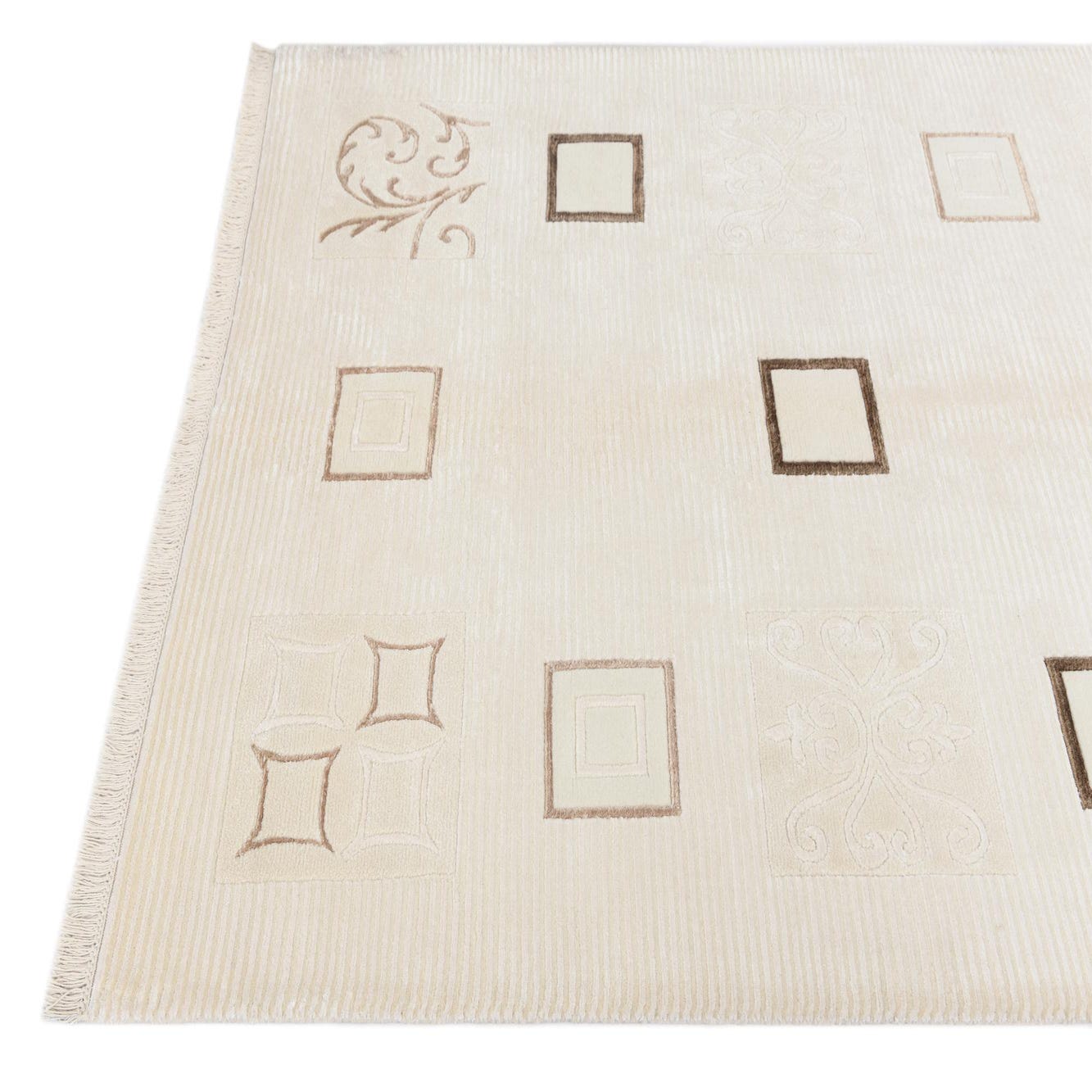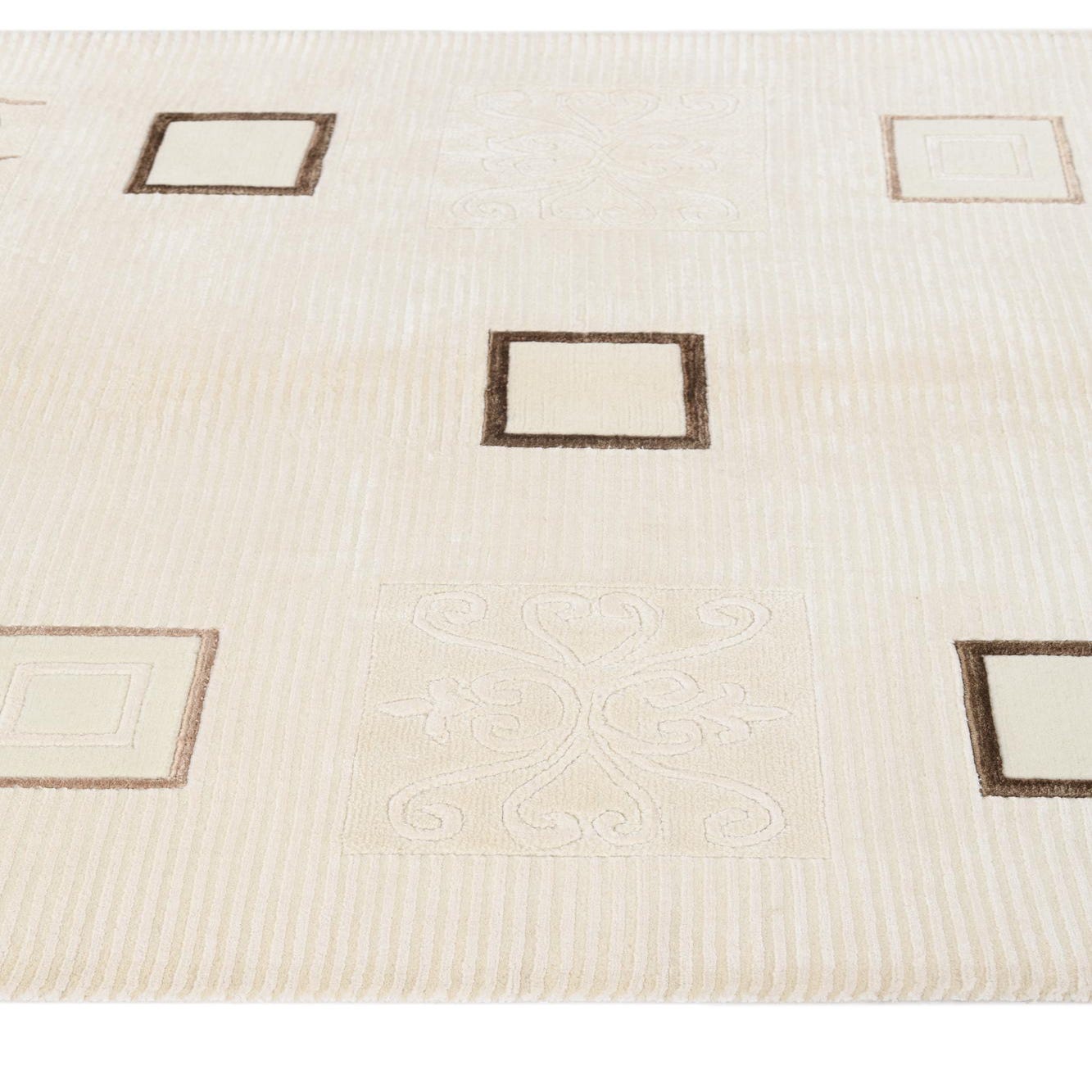 A 4x6 rectangular Darya rug in cream and brown wool, featuring a modern oriental pattern of alternating geometric squares and ornate floral motifs.
