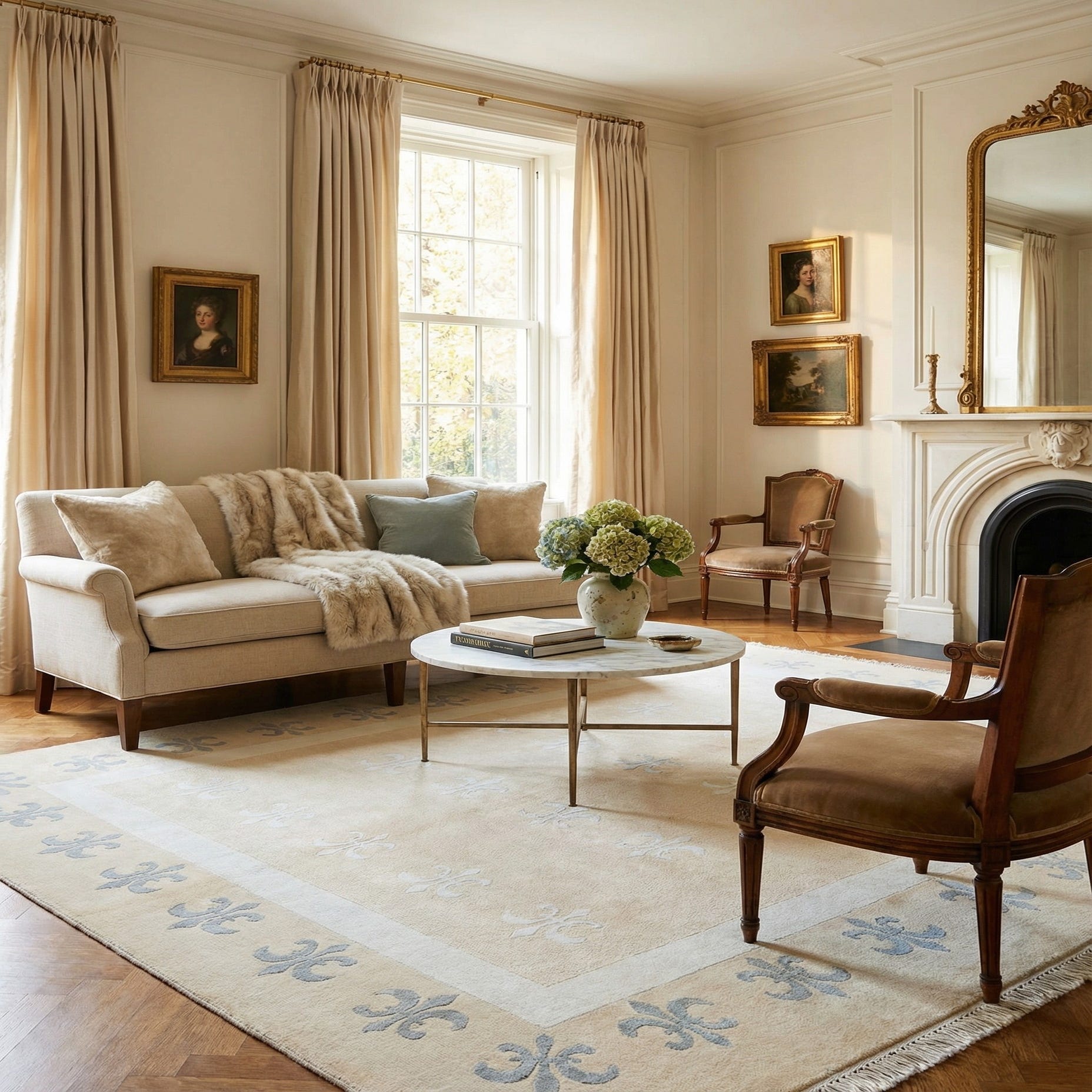 A 4x6 rectangular Darya rug with a cream center and light brown border, featuring a subtle fleur-de-lis pattern.