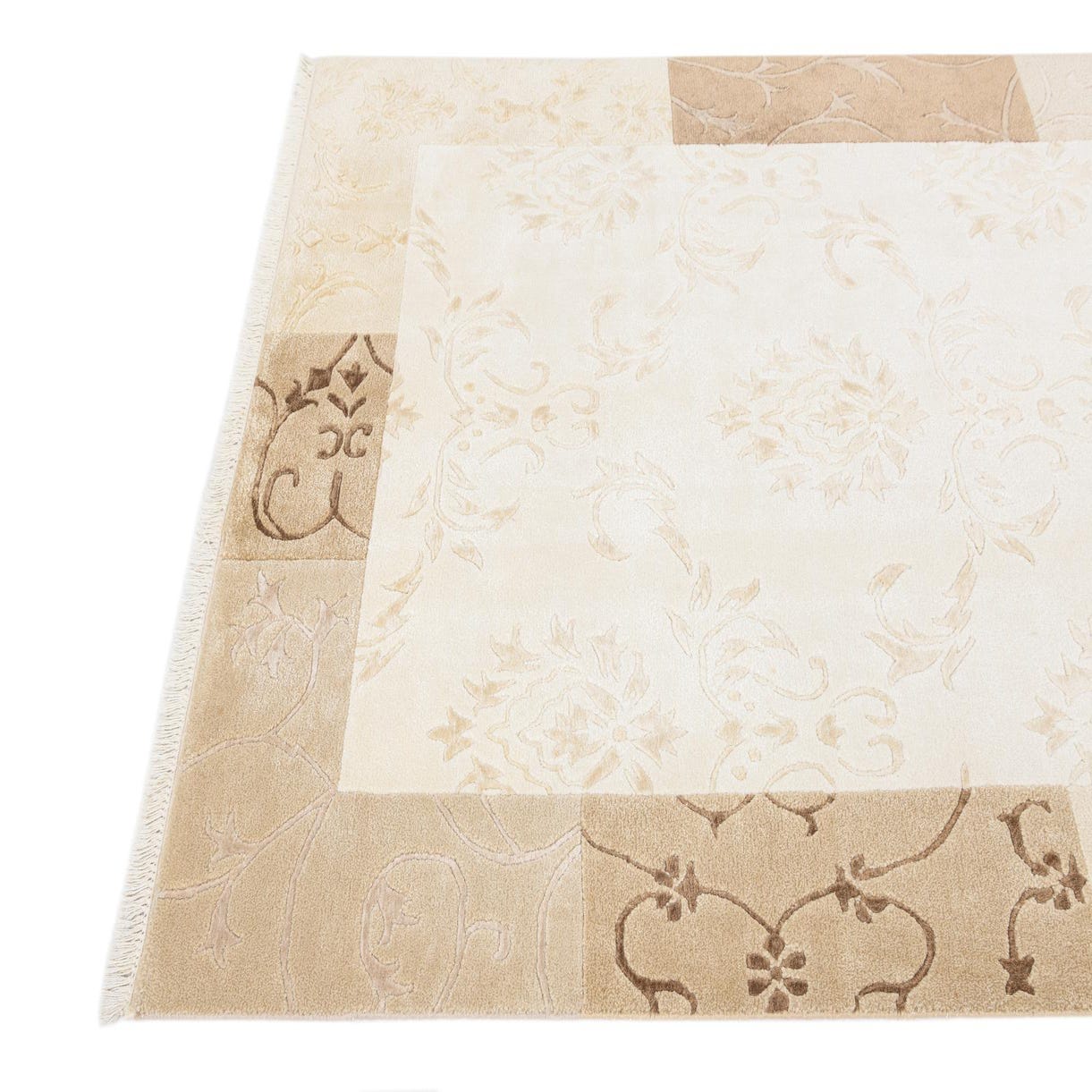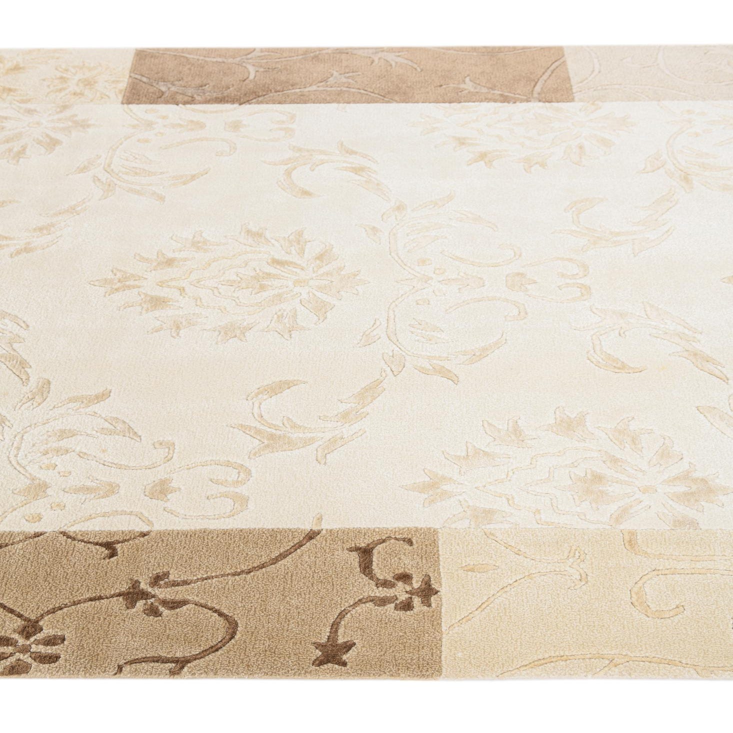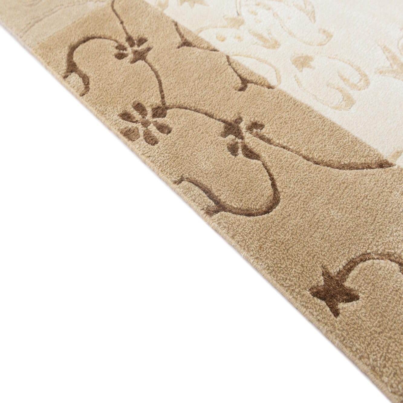 The Darya collection presents a 4x6 hand-knotted rug crafted from 100% wool, designed to deliver both comfort and durability. This particular rug showcases a symmetrical pattern with floral motifs, offering a timeless elegance suited to a range of home aesthetics. The color palette consists of warm neutral tones including beige, brown, light brown, and tan, with the background predominantly beige, providing a versatile base that complements various color schemes.