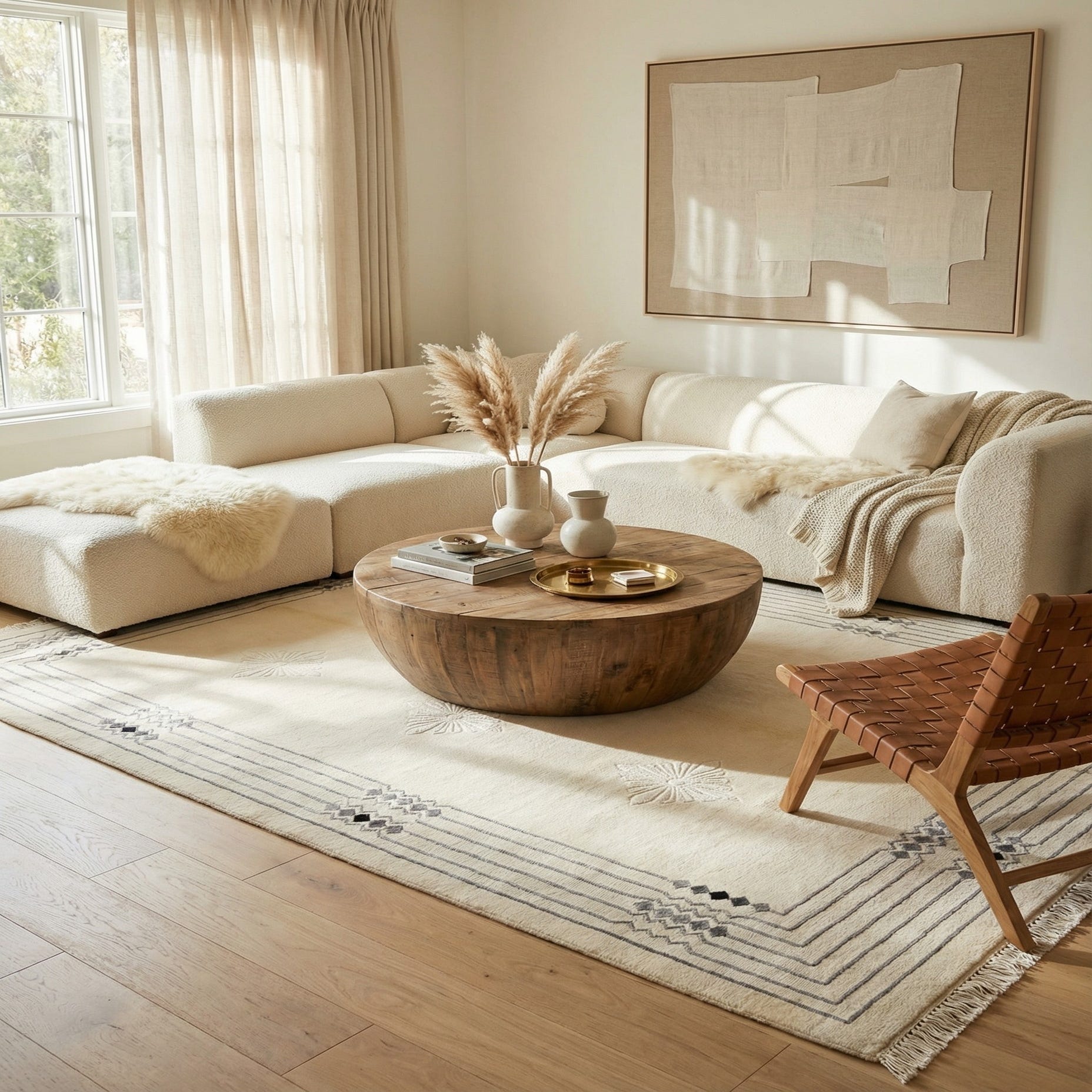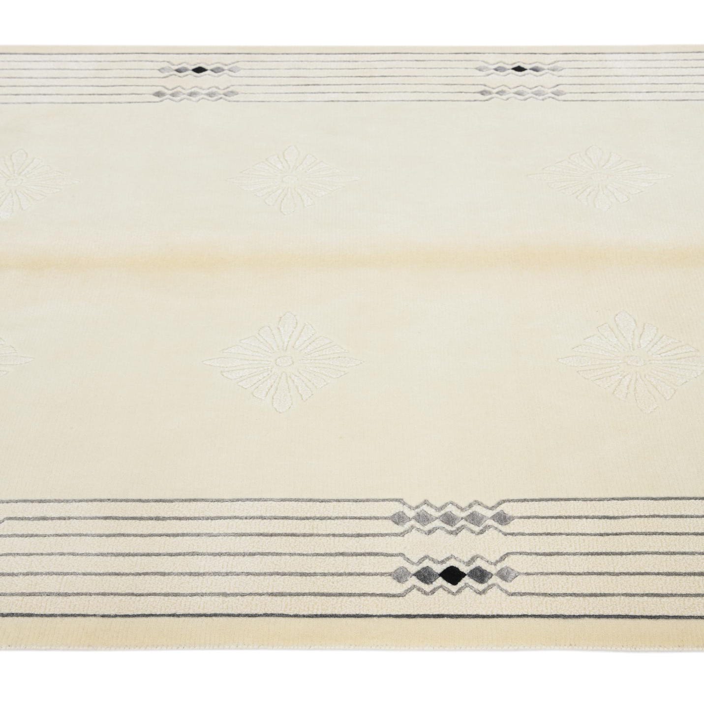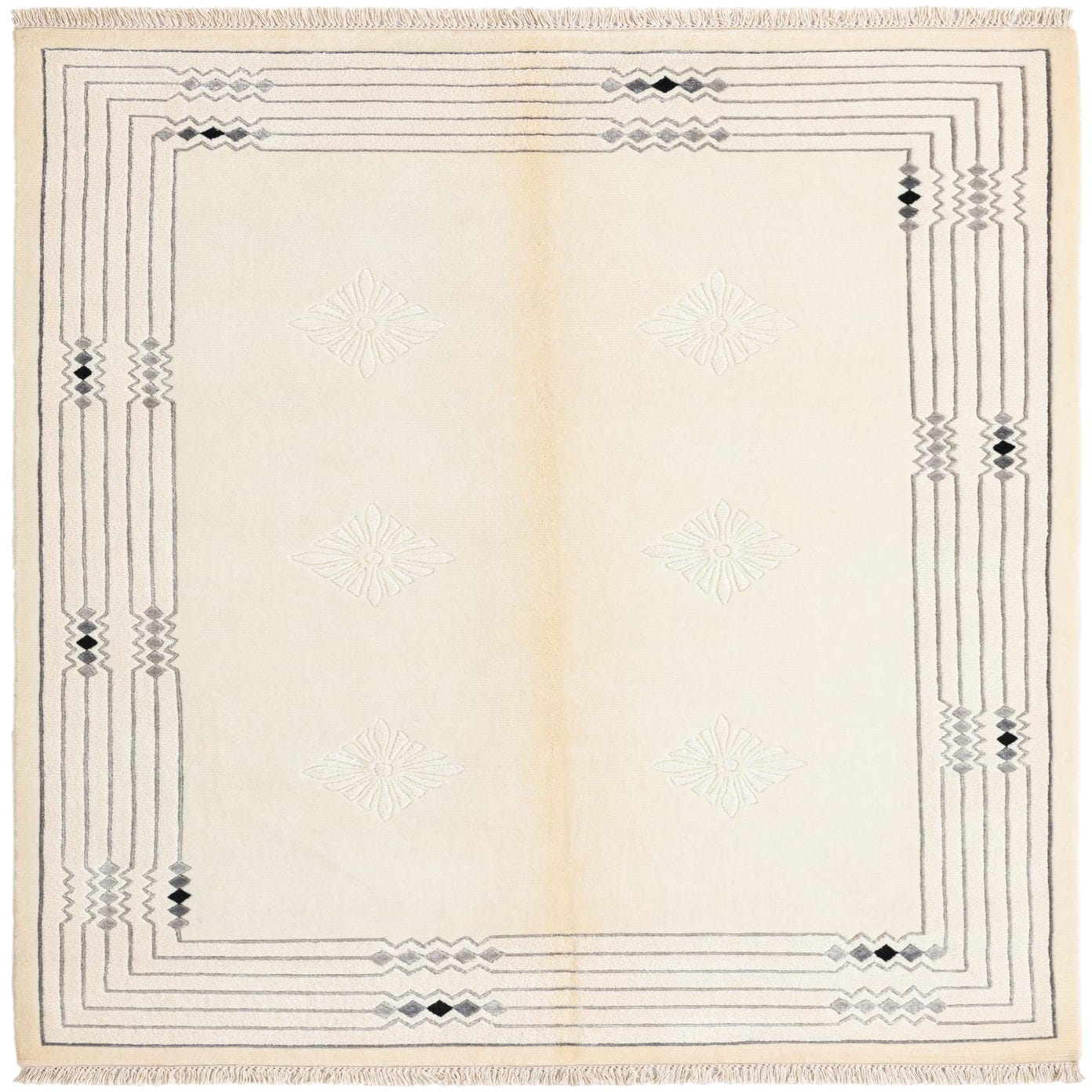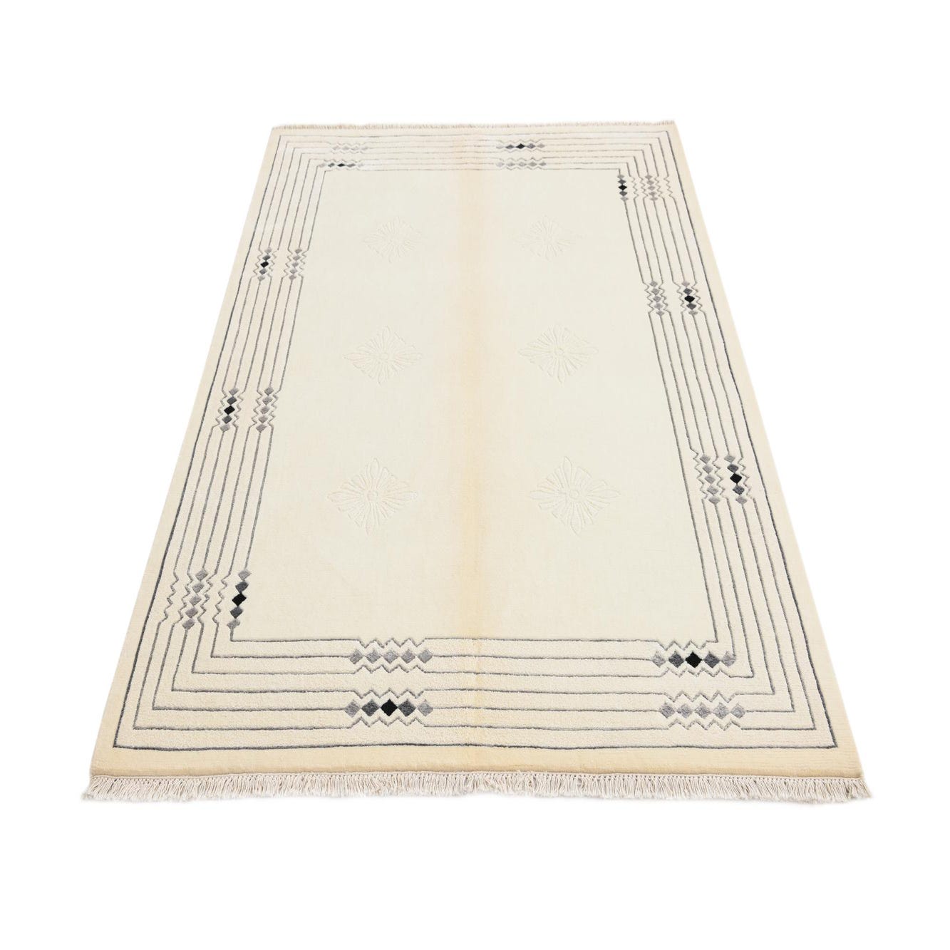 A 4x6 rectangular Darya rug in cream and brown wool, featuring a modern oriental border with geometric patterns and subtle floral motifs in the center.