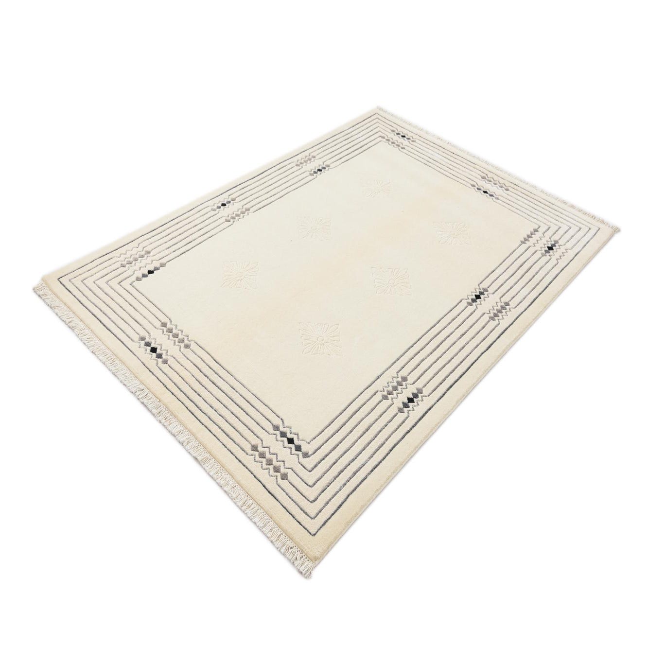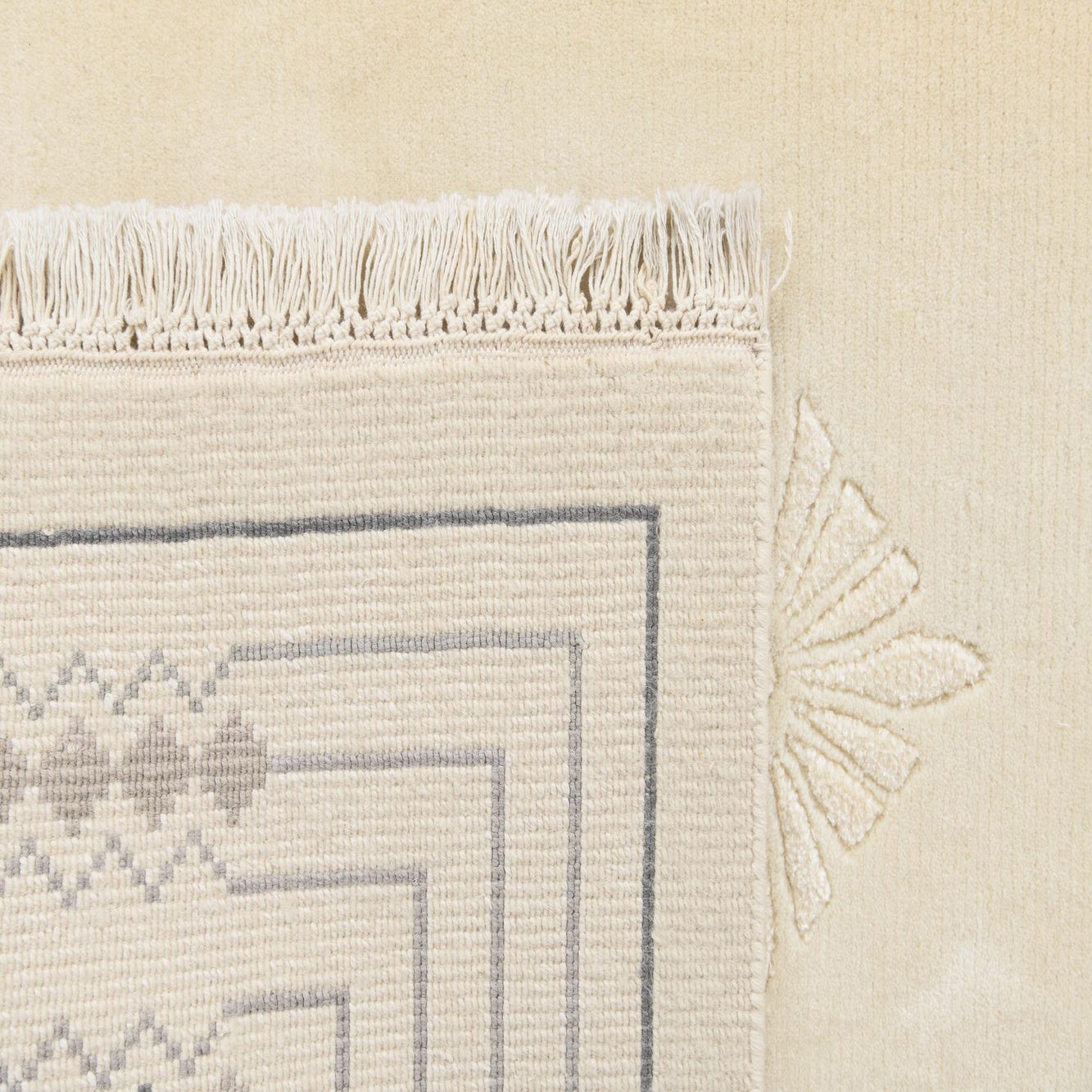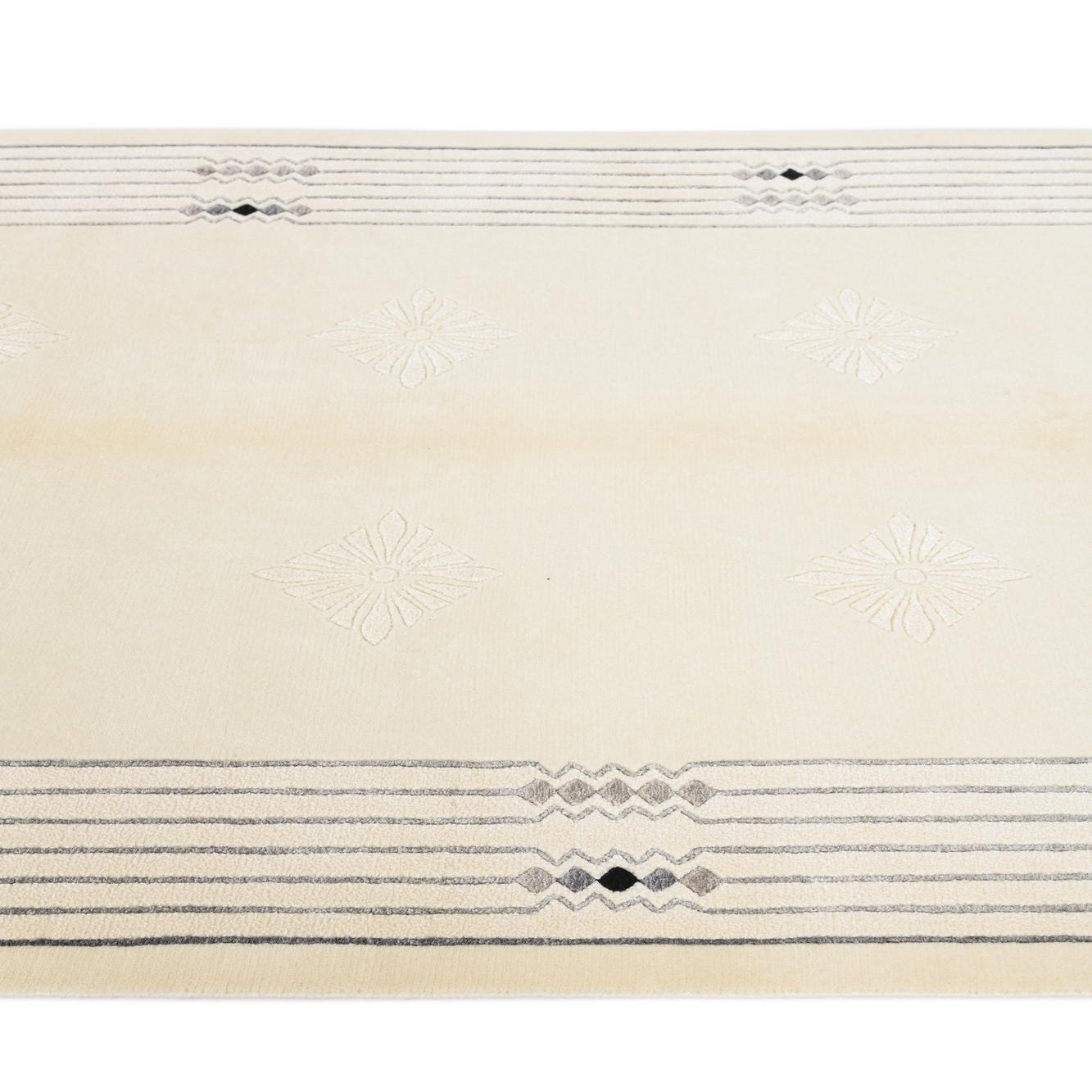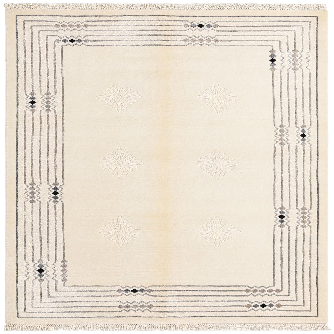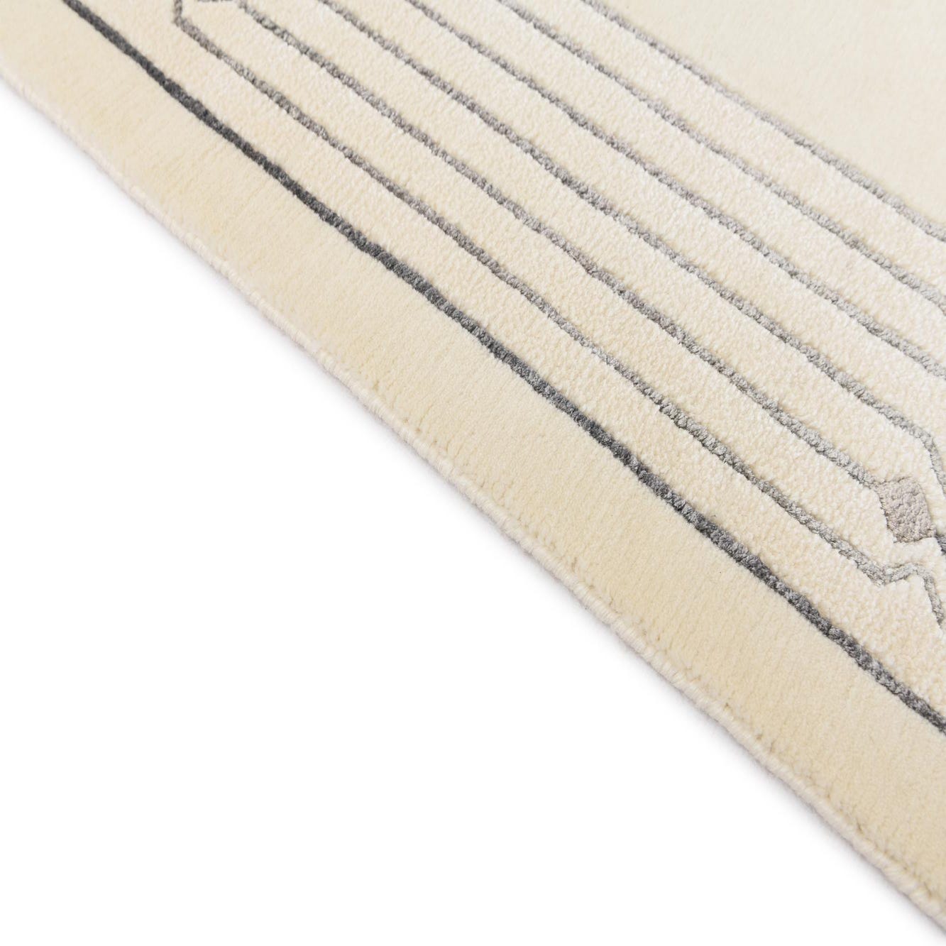 With its neutral palette and distinct design, this rug is well suited for a variety of decor styles. It would pair gracefully with minimalist and Scandinavian-inspired decors, where its clean lines and understated color scheme can blend seamlessly with natural materials and soft textures. It can also serve as a grounding element in more eclectic or industrial environments, where its pattern can complement metallic accents and exposed structural details without overpowering the space. The rug's hand-knotted wool composition ensures a soft touch underfoot, further enhancing the feeling of comfort in living rooms, home offices, or smaller dining areas.