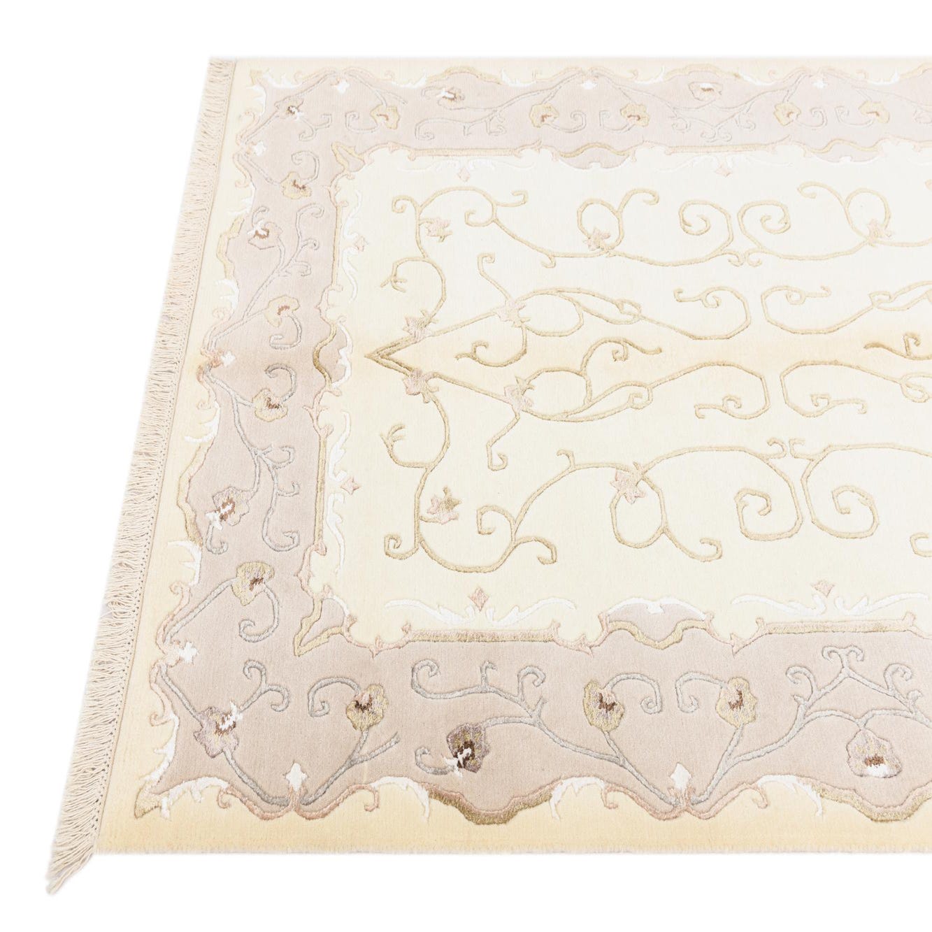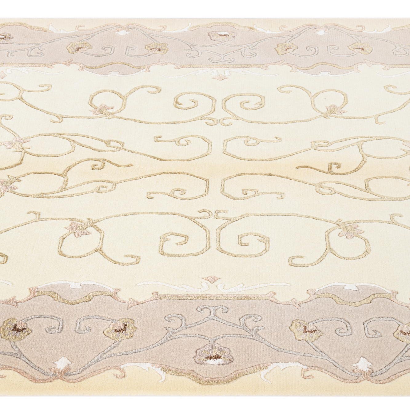 The rug features an elegant central pattern with curvilinear lines and filigree motifs, bordered by intricate detailing that provides a sense of depth and dimensionality. The decorative elements are balanced, creating a harmonious design that is both classic and contemporary in its appeal.