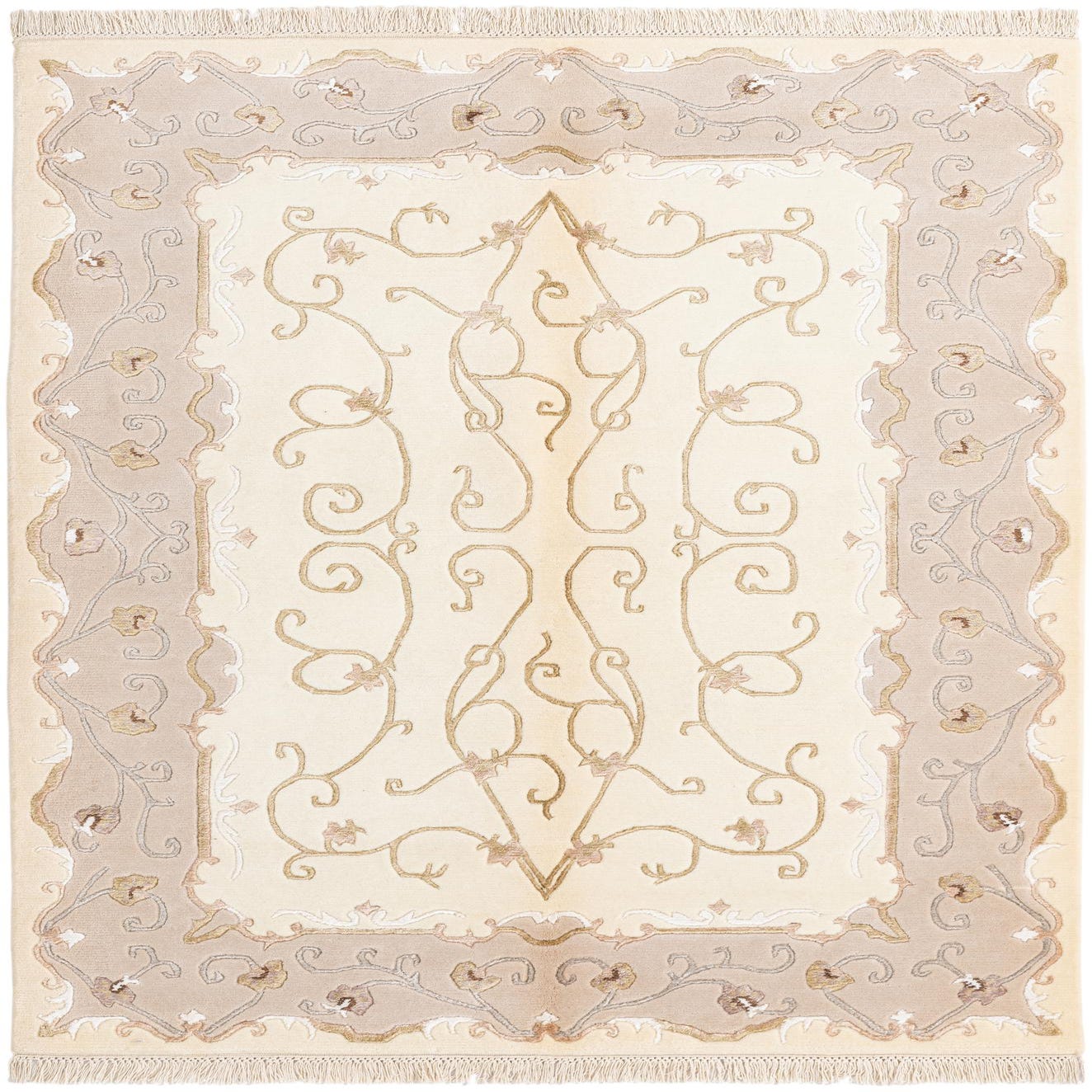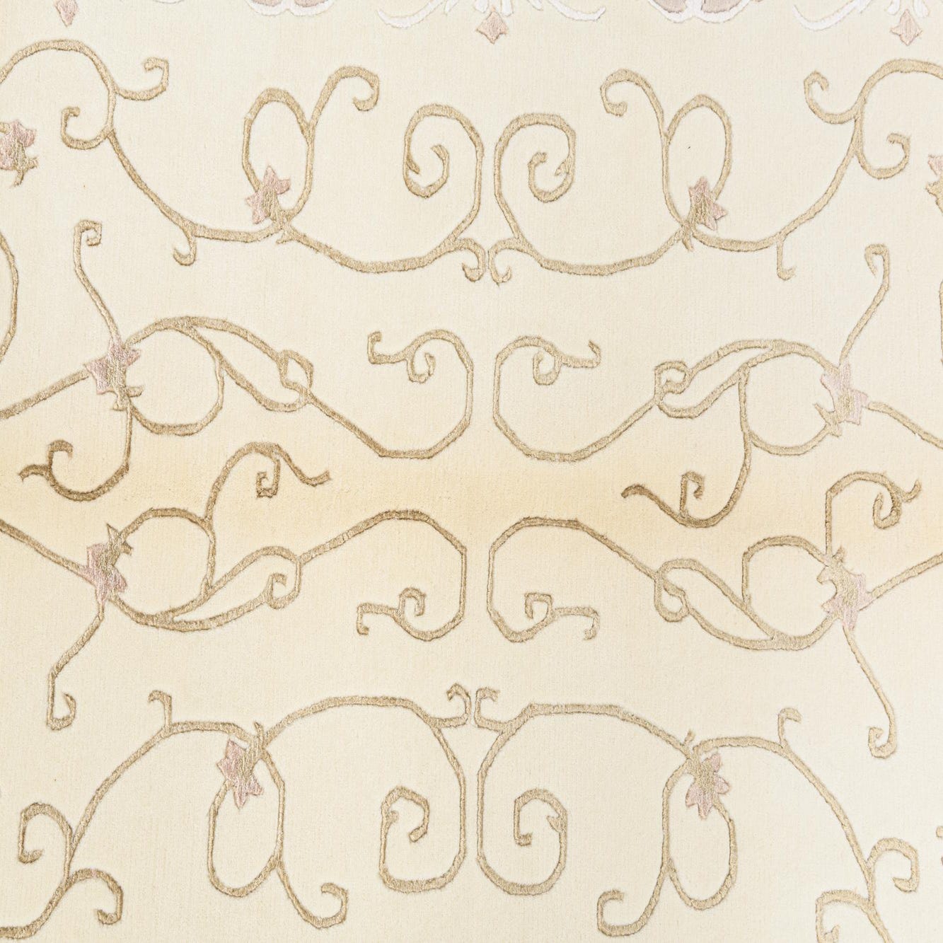 This rug would seamlessly integrate into various design scenarios. It would serve as a refined anchor in a traditional living room or add warmth to a minimalist space with its natural wool texture and gentle color palette. In a home office or smaller seating area, it could introduce an element of timeless grace without overwhelming the setting. Its neutral tones also make it an excellent choice for layering with other rugs or incorporating into an eclectic interior where it will blend while still standing out due to its artful design.