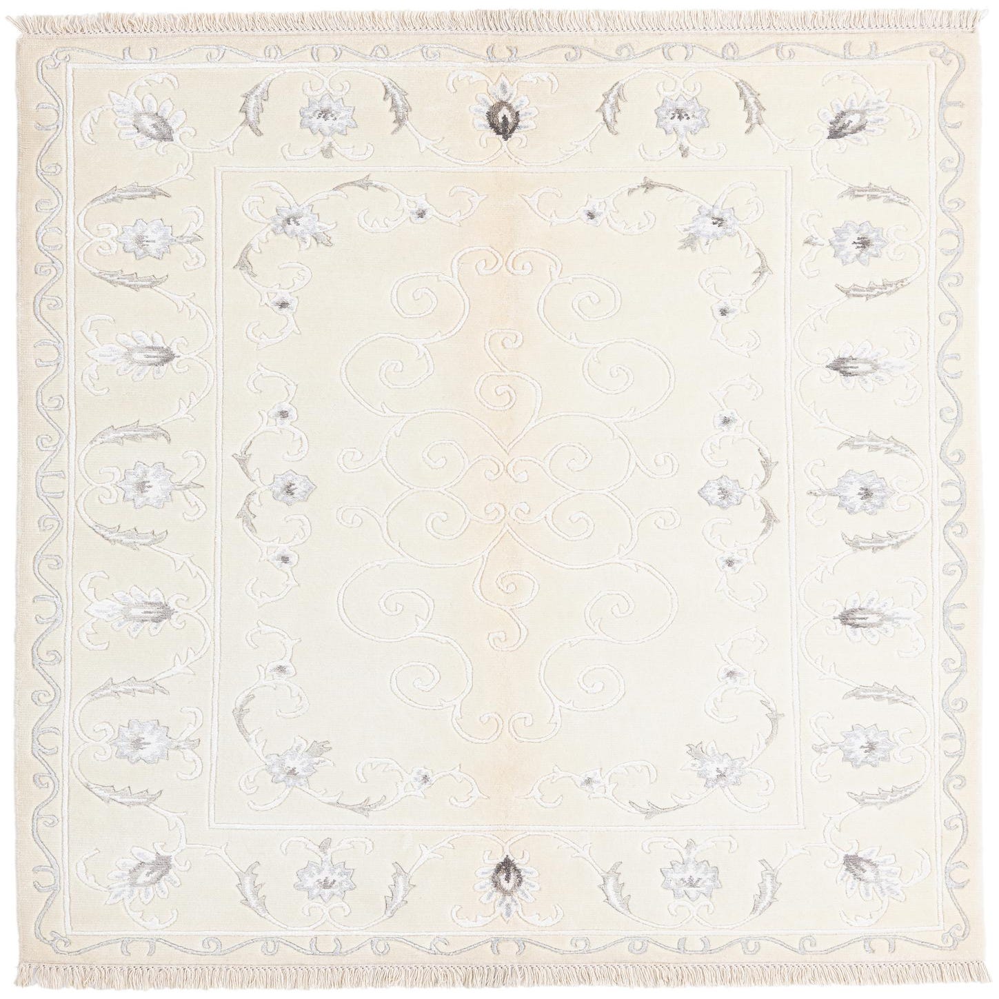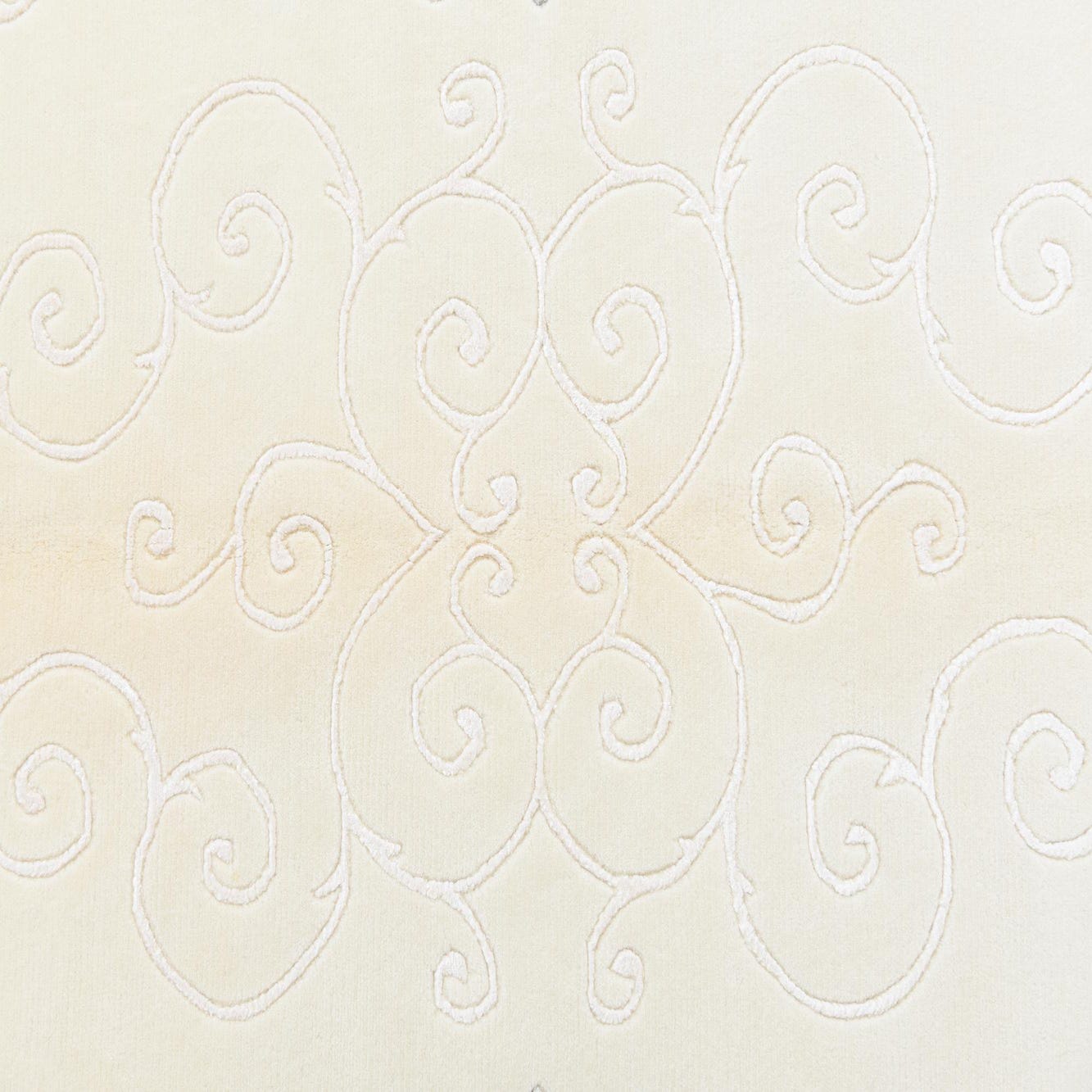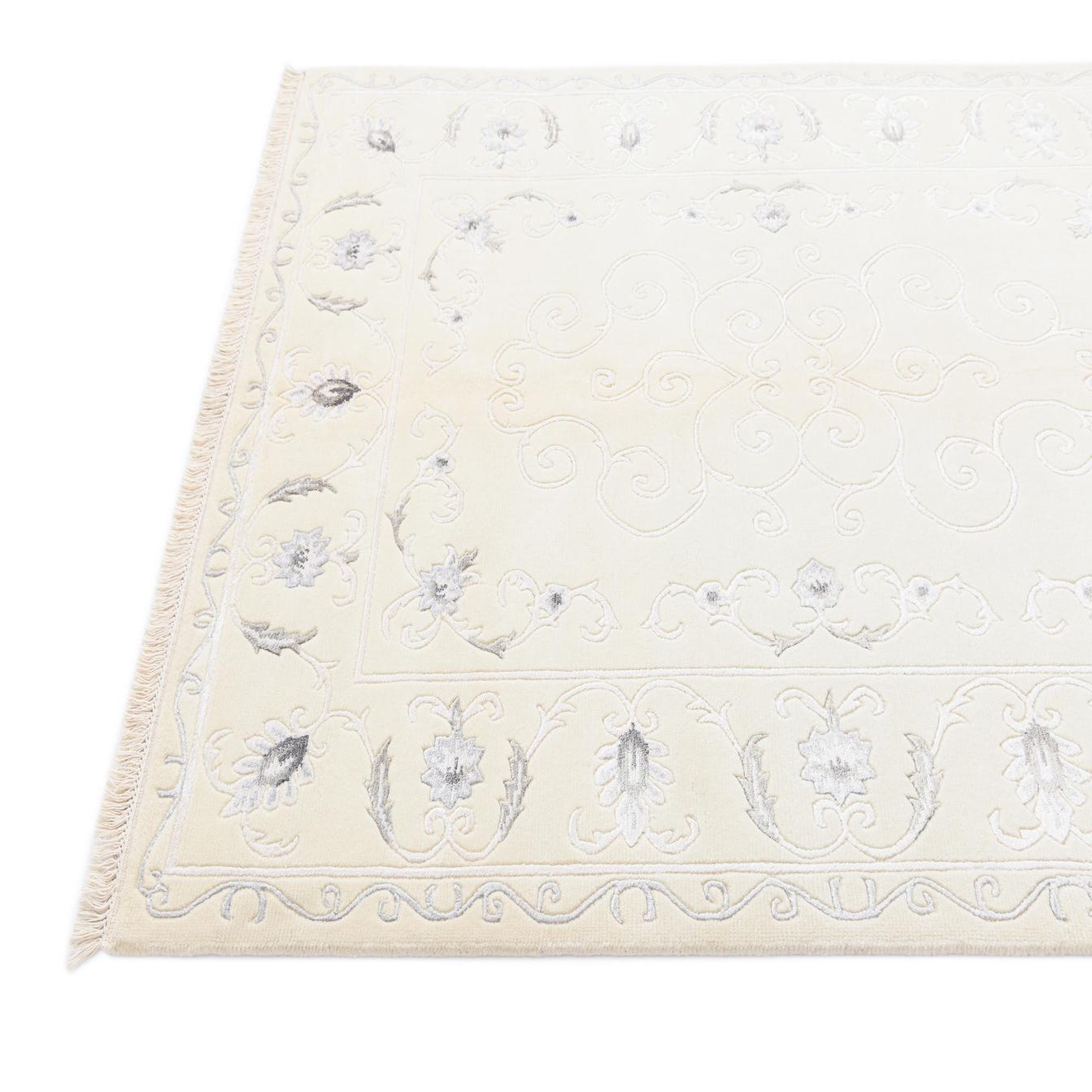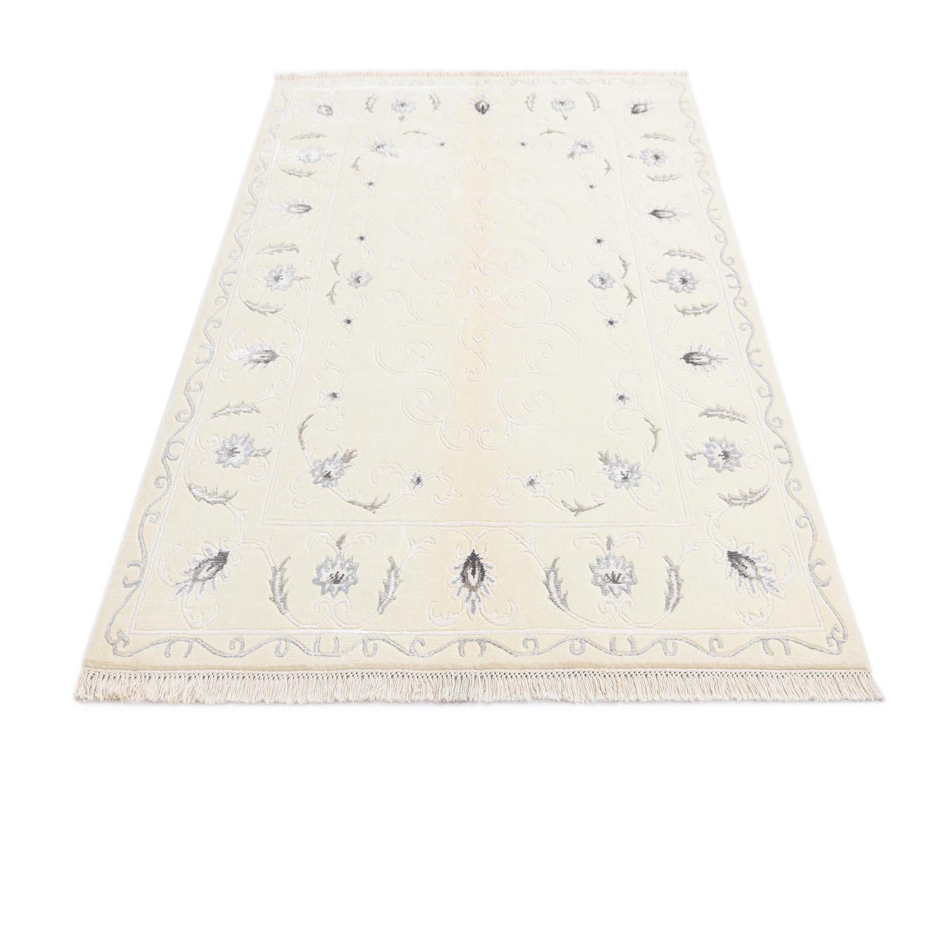 A 4x6 rectangular Darya rug with a modern floral pattern in cream, ivory, and subtle brown tones, featuring a high pile and fringe.