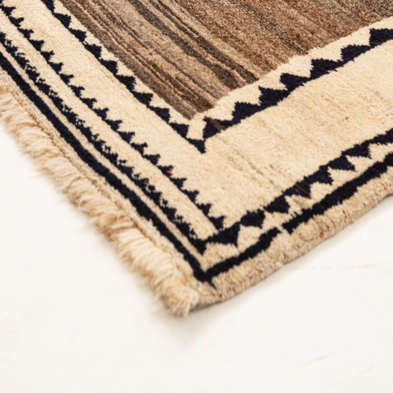 A 4x6 rectangular Gabbeh rug featuring a modern pattern with brown and tan stripes, ivory diamonds, and a fringed edge.