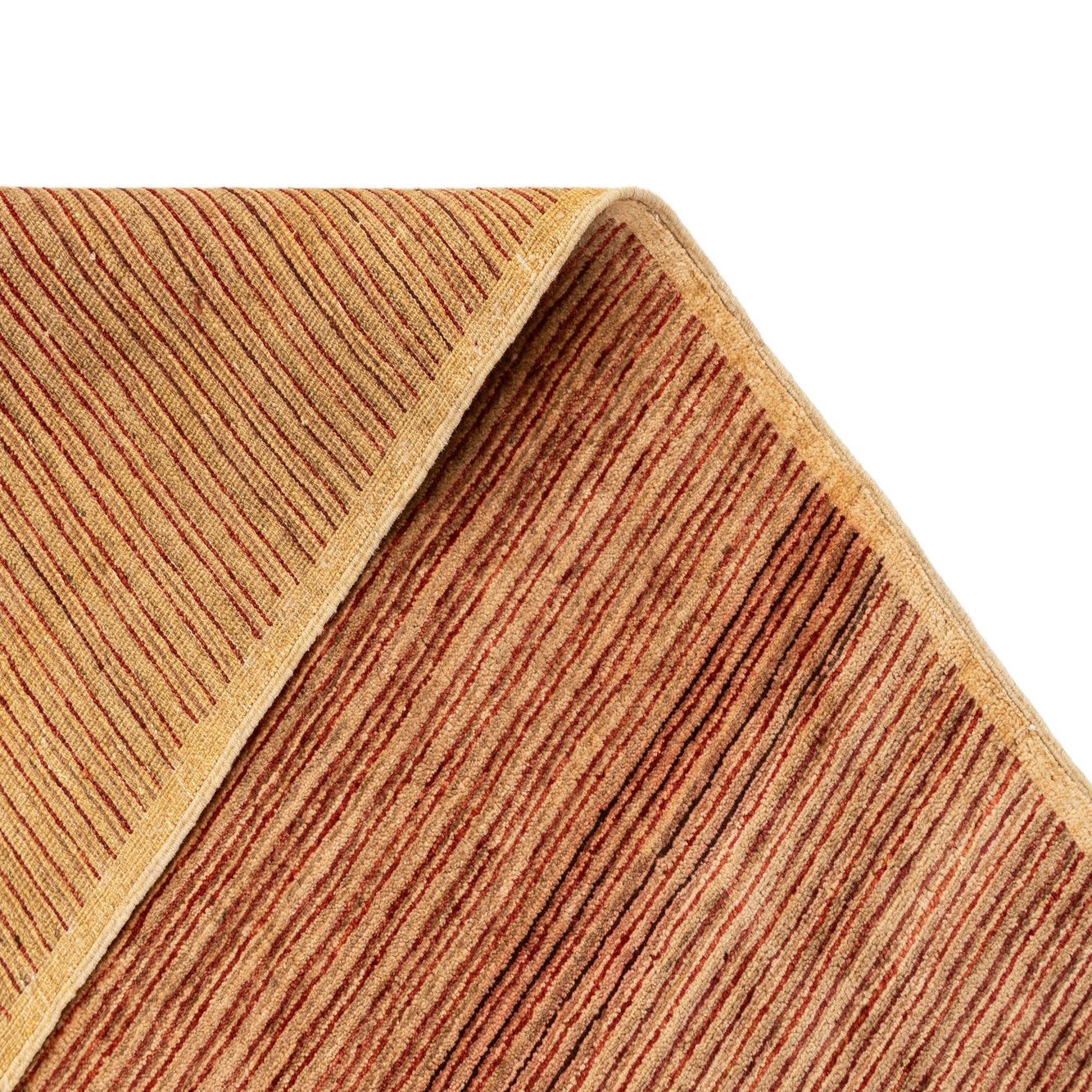 A 4x6 rectangular Gabbeh rug in shades of brown and tan, featuring a modern striped pattern, made from sheep virgin wool.