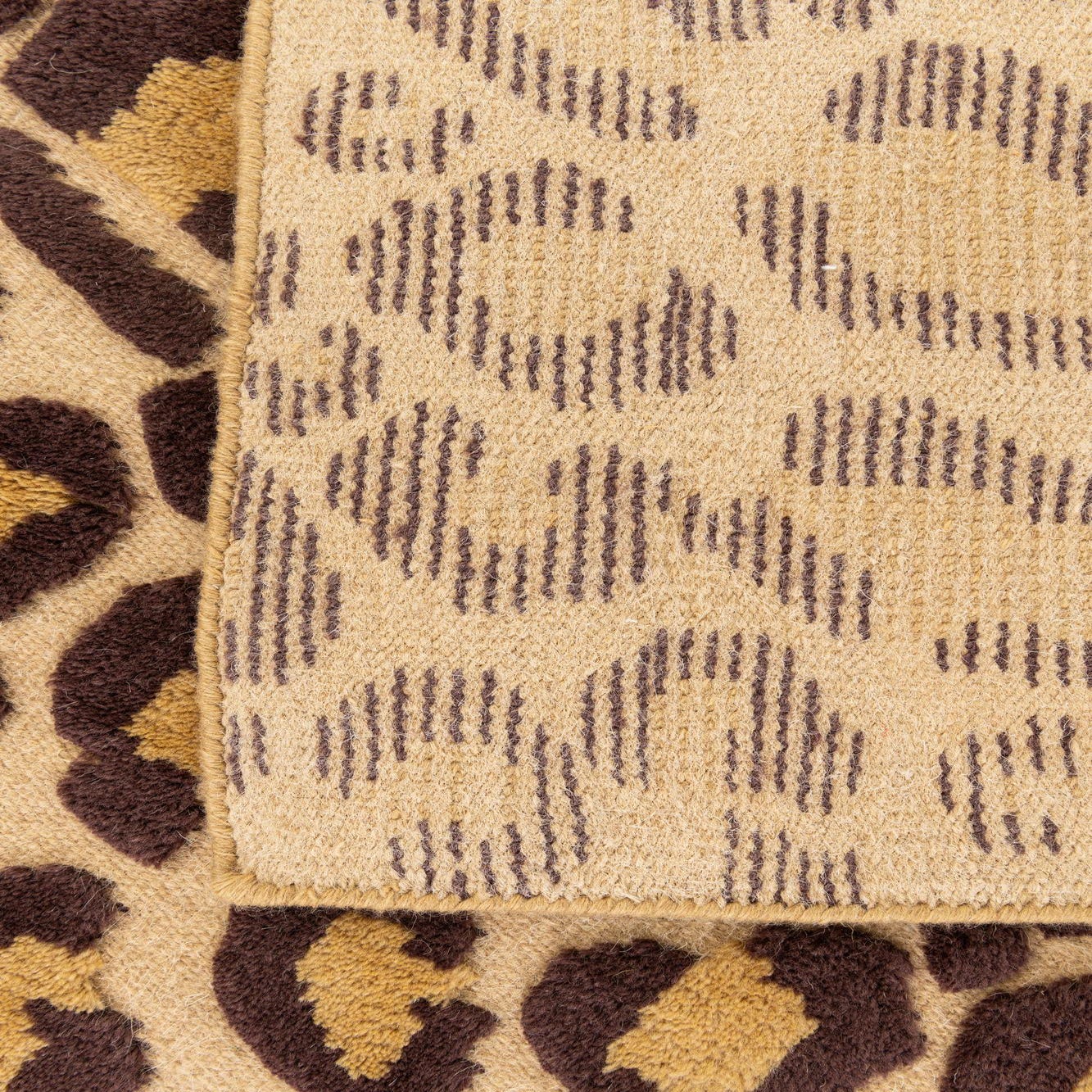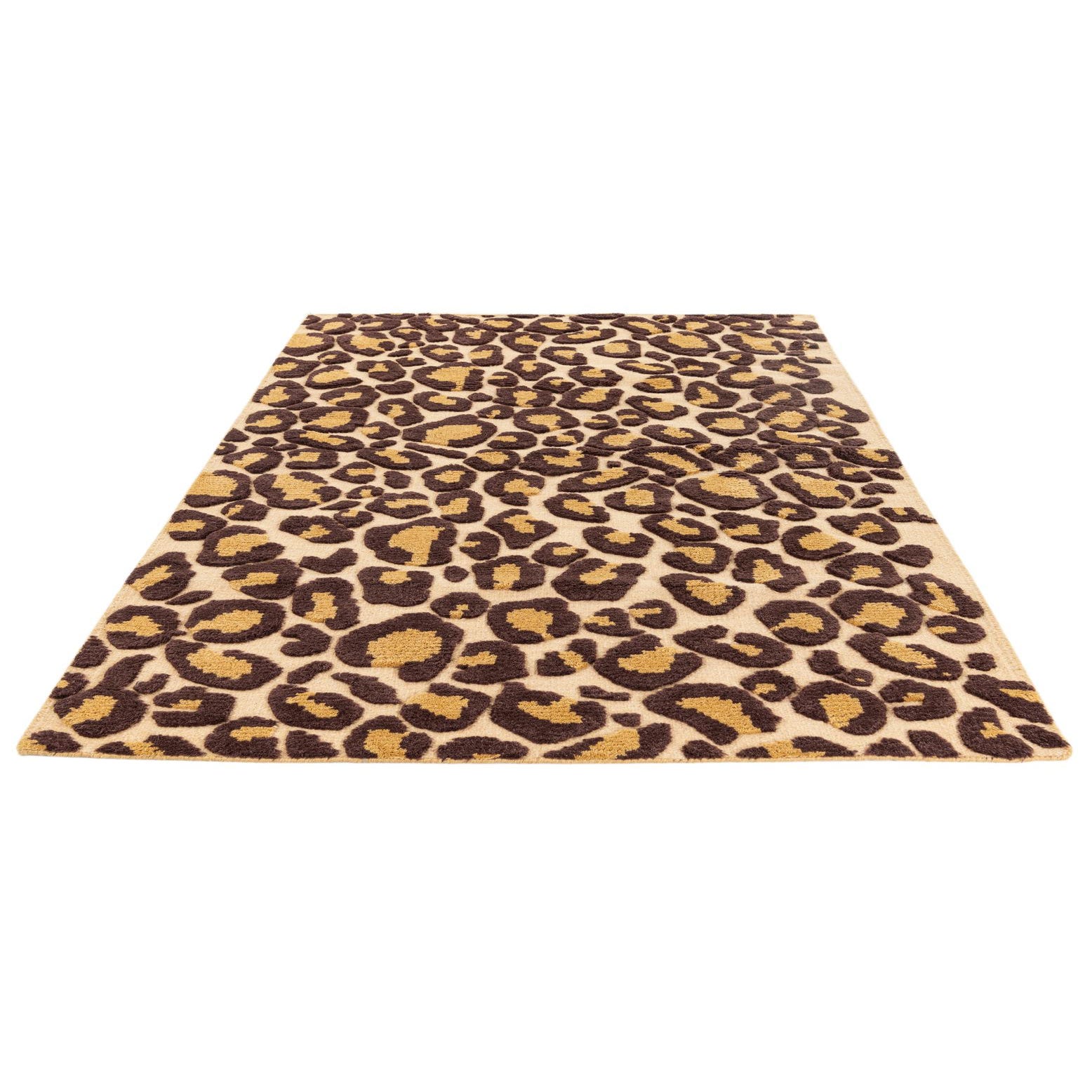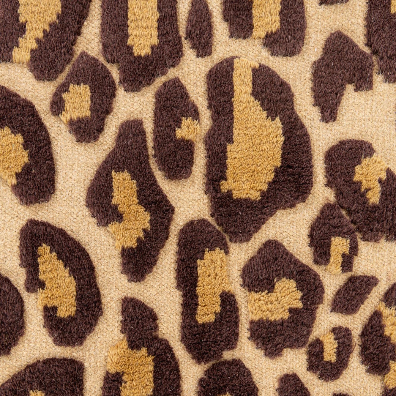 Hand-knotted of wool with a cotton foundation, this rug features a bold leopard-inspired allover pattern in burgundy set against a warm beige background. The irregular, organic spots create a lively, confident rhythm across the floor while the hand-knotting and natural wool pile give the surface a tactile presence with subtle variations in depth and texture you can feel underfoot.