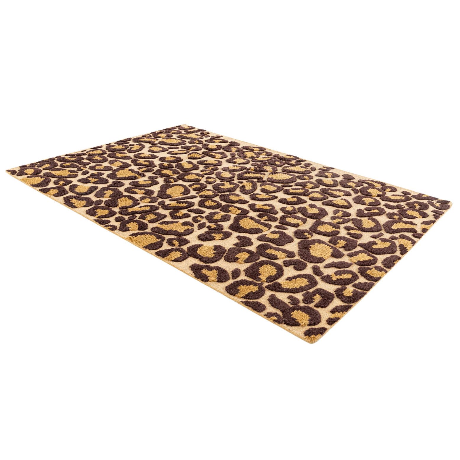 A 4x6 rectangular Gabbeh rug featuring a modern leopard print pattern in shades of brown, tan, and cream.