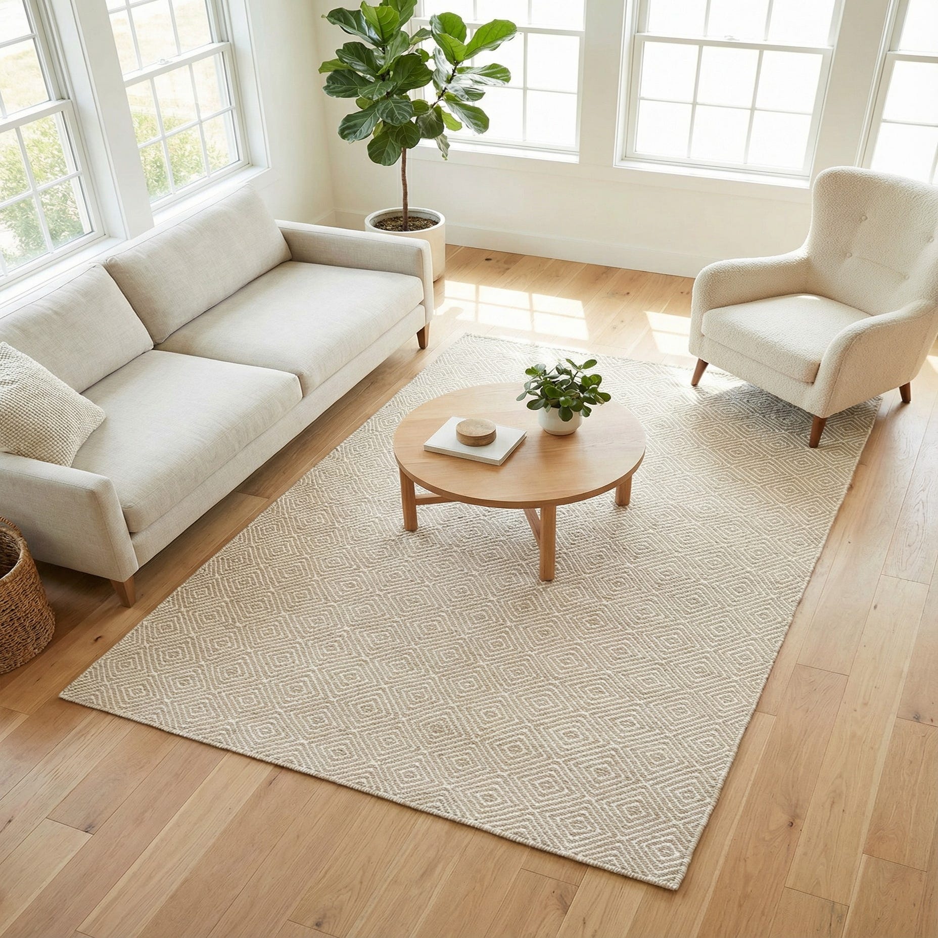 The neutral colorway and clean geometry suit a range of interiors from modern minimal and Scandinavian to casual coastal or transitional spaces. Works well in a small seating area or reading nook, placed under a round dining table, or layered over hardwood to introduce texture without overwhelming the room. Pair with light woods, linen upholstery, woven baskets, and soft metallic accents for a calm, collected look.