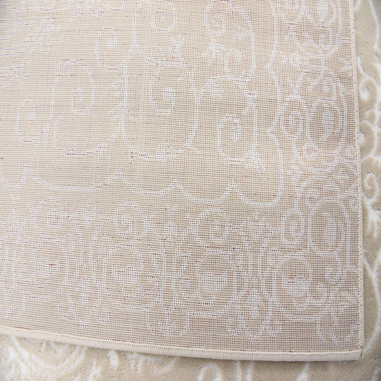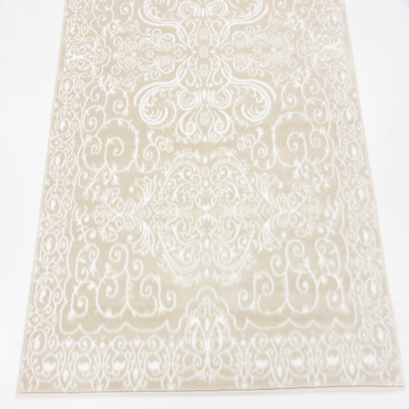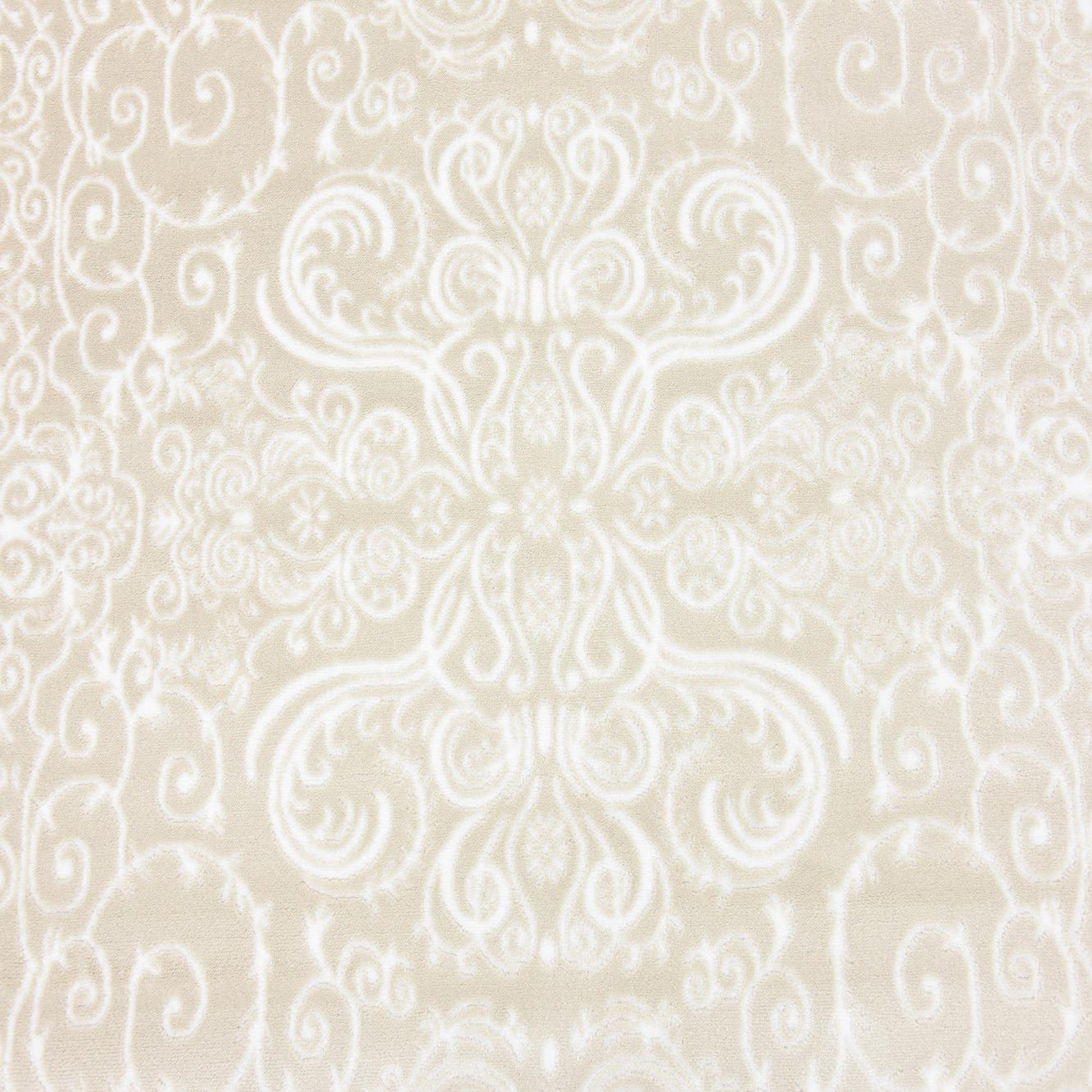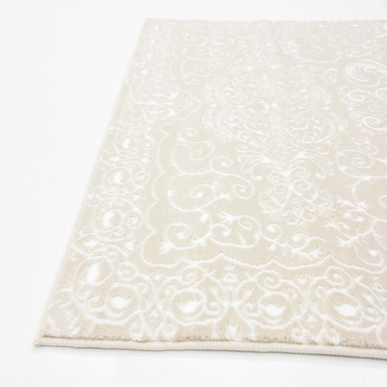 A soft, tone-on-tone rug with a classic medallion and scrolling arabesque motif rendered in ivory against a warm beige background. The pattern is gently raised, giving a subtle embossed effect you can feel underfoot; the low-profile pile has a soft hand and a slight sheen from the blend of fibers. Machine-made from 55% polypropylene and 45% polyester, the construction keeps the pattern clean and consistent across the surface.