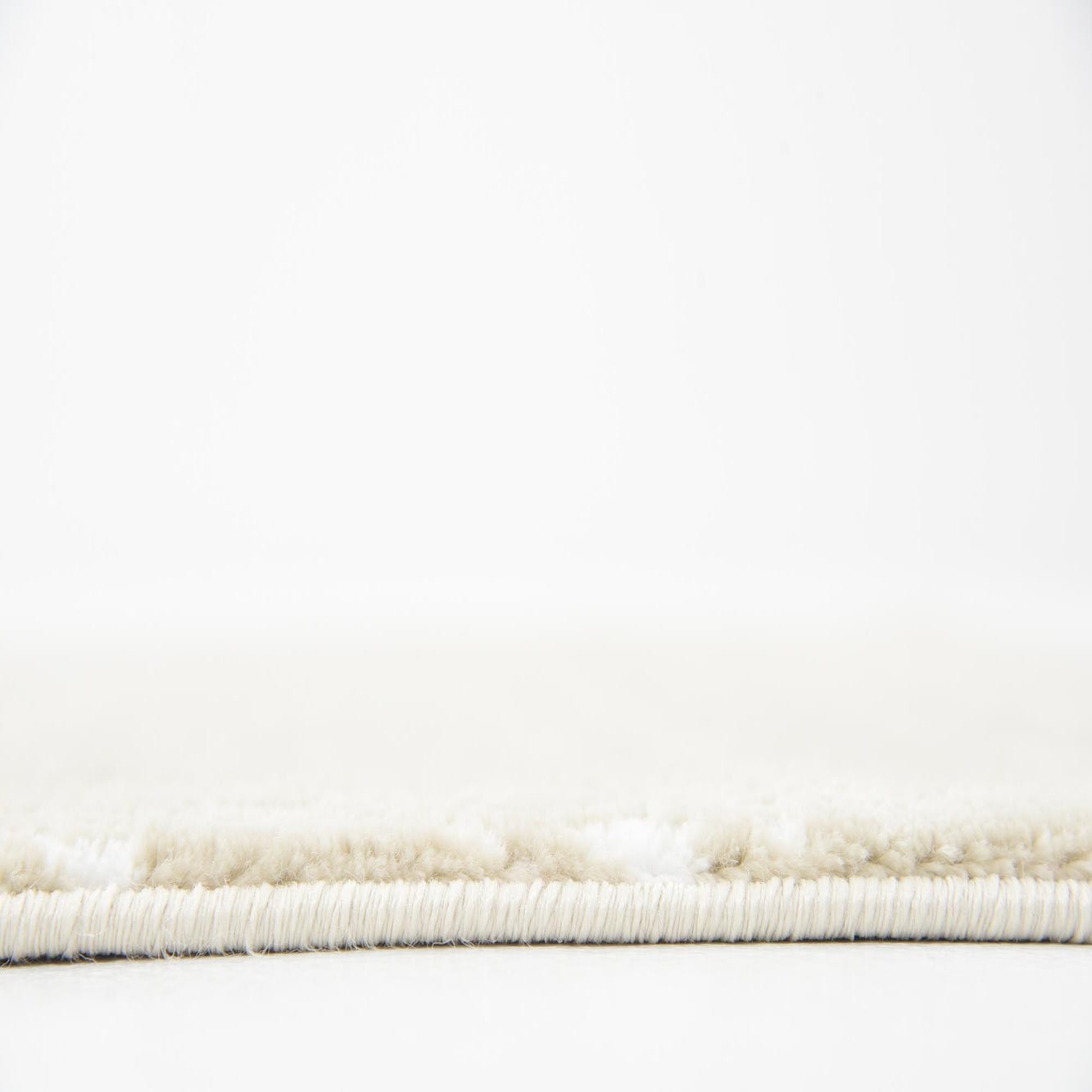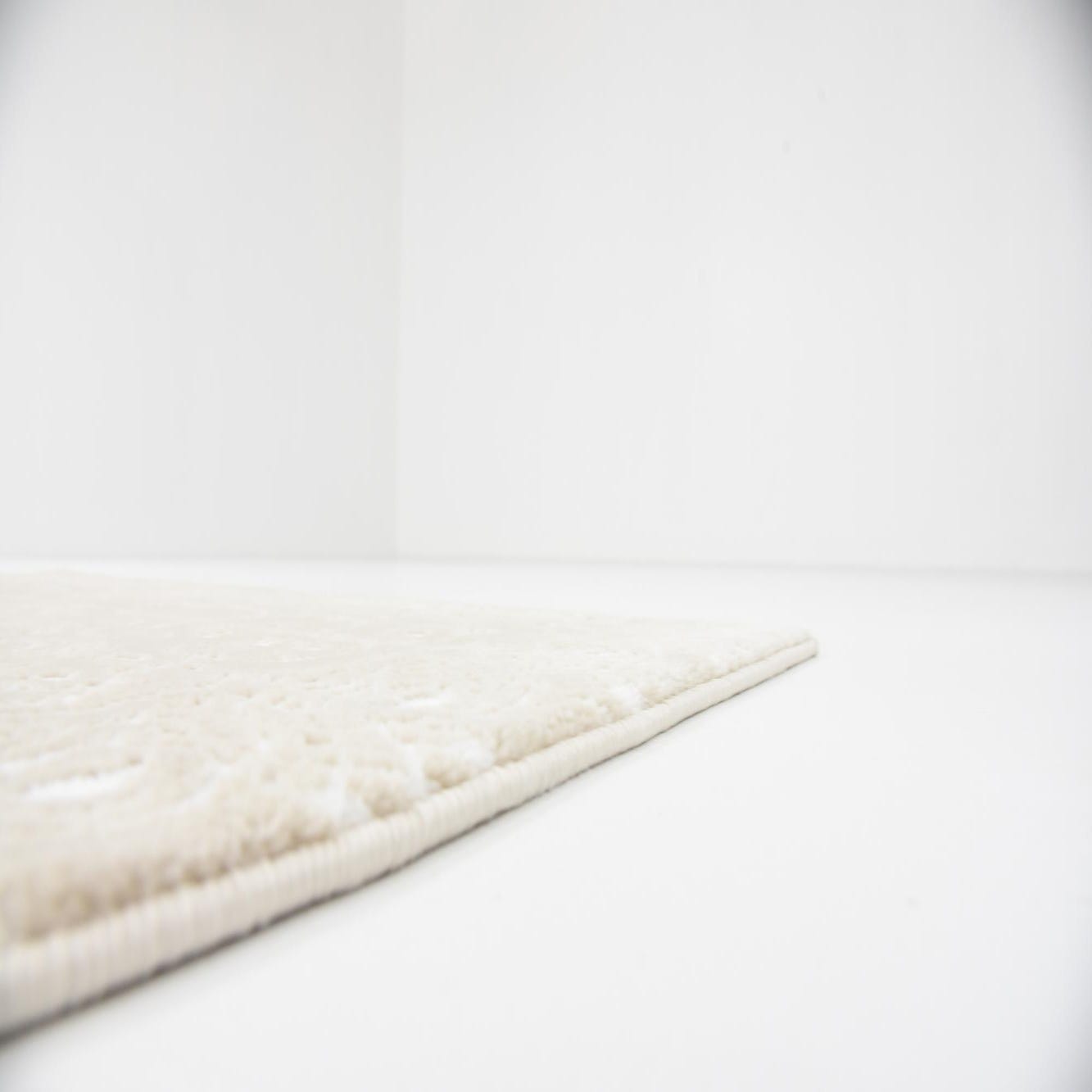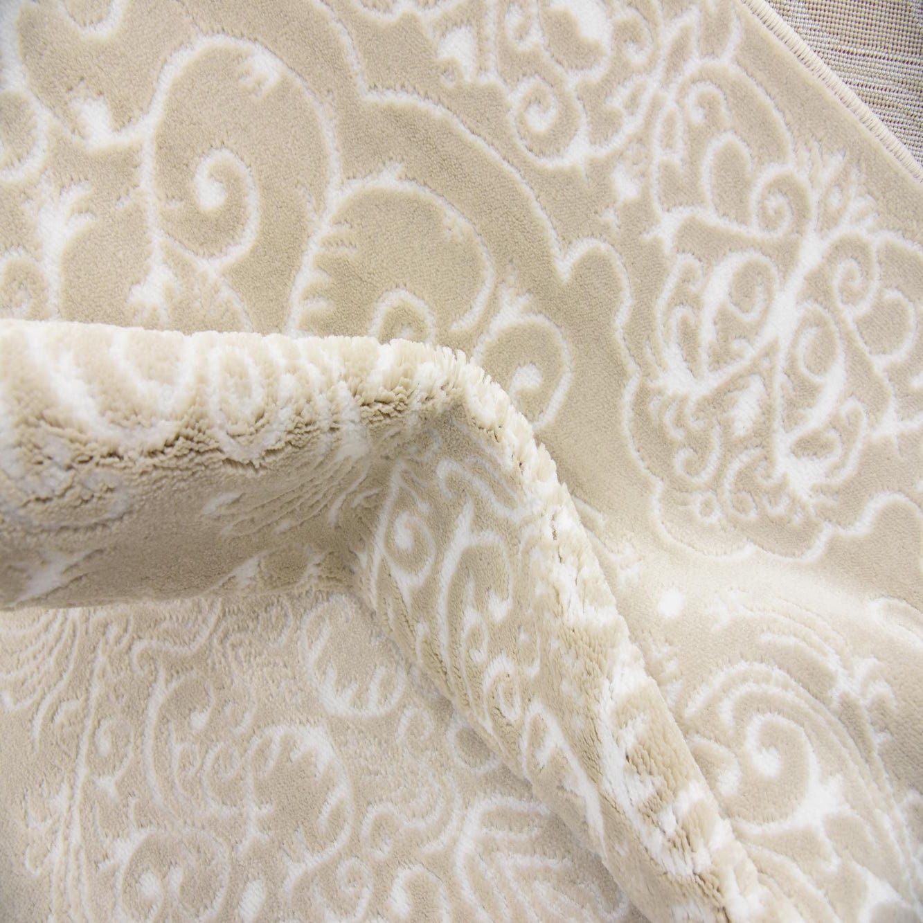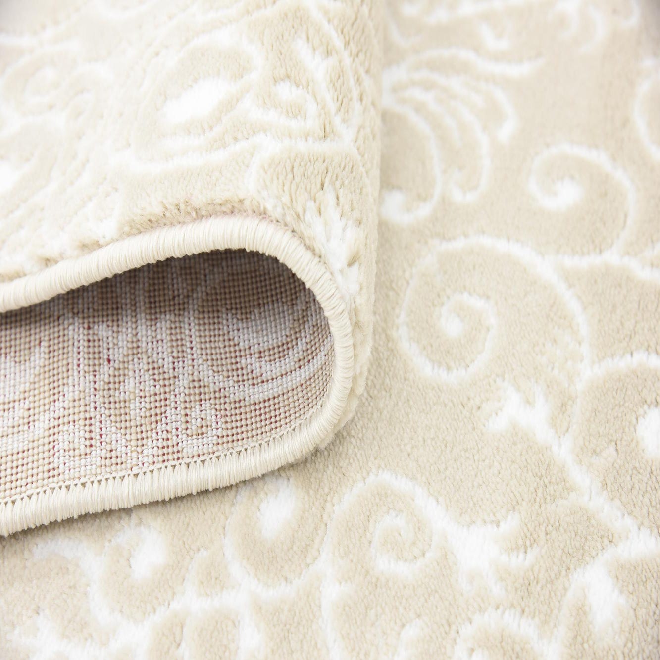 A soft, tone-on-tone rug with a classic medallion and scrolling arabesque motif rendered in ivory against a warm beige background. The pattern is gently raised, giving a subtle embossed effect you can feel underfoot; the low-profile pile has a soft hand and a slight sheen from the blend of fibers. Machine-made from 55% polypropylene and 45% polyester, the construction keeps the pattern clean and consistent across the surface.
