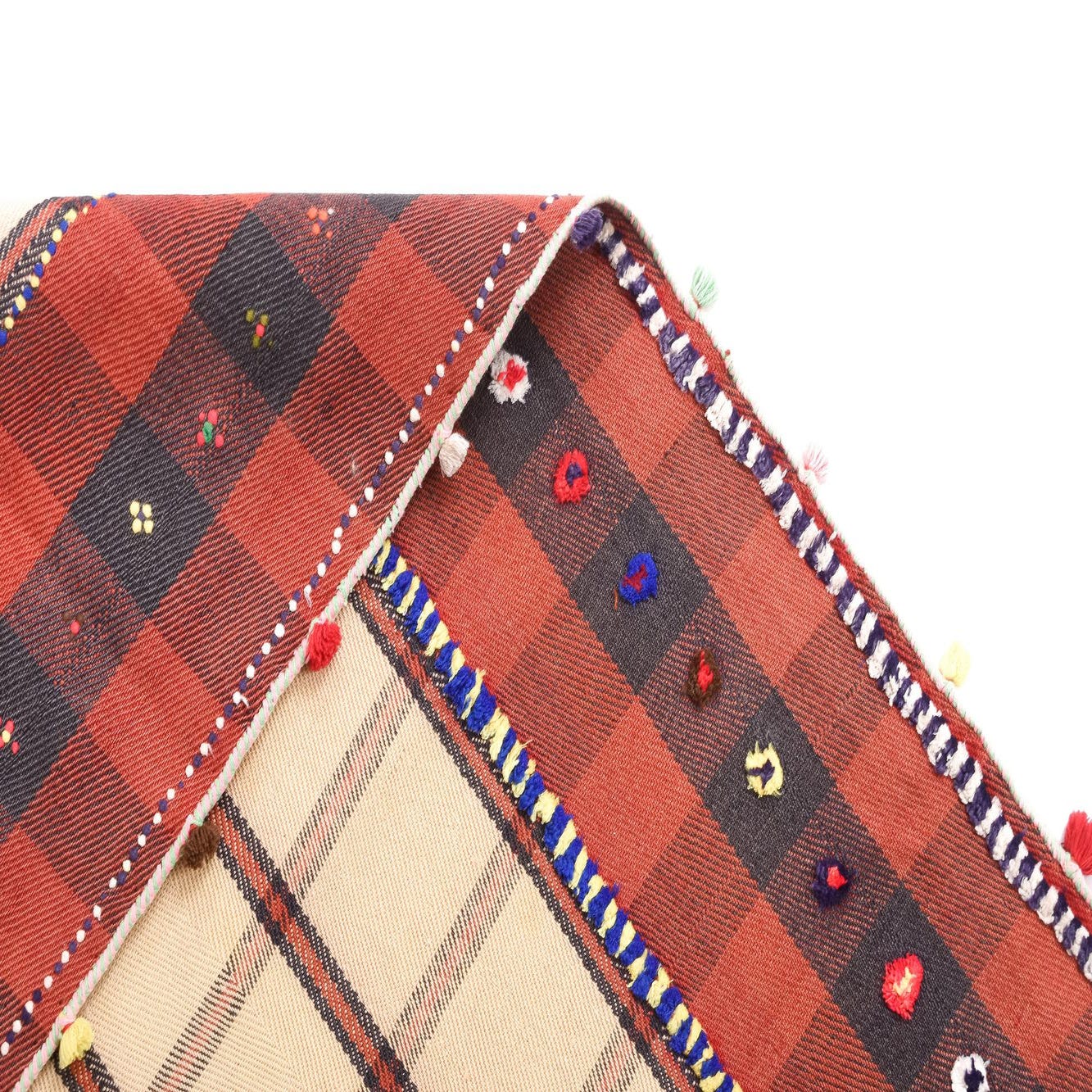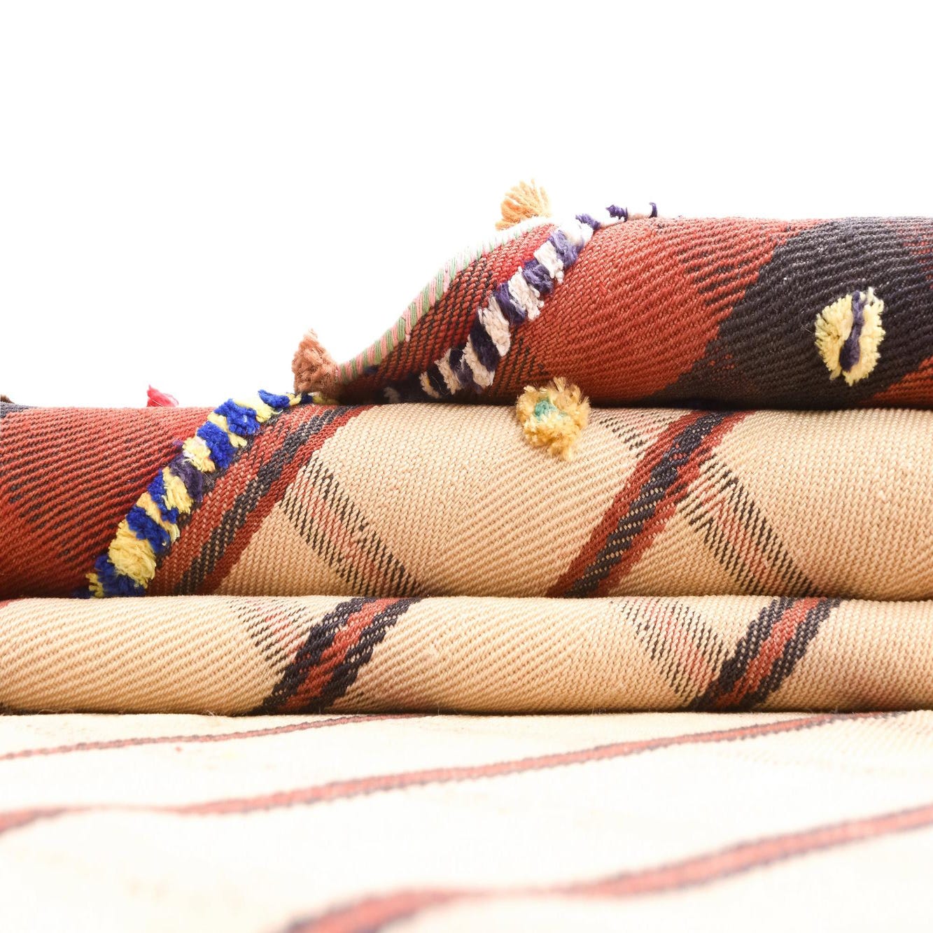A 4x6 rectangular Jajim wool rug featuring a cream center with thin brown plaid lines, bordered by a wider rust and brown striped pattern with colorful pom-pom accents.