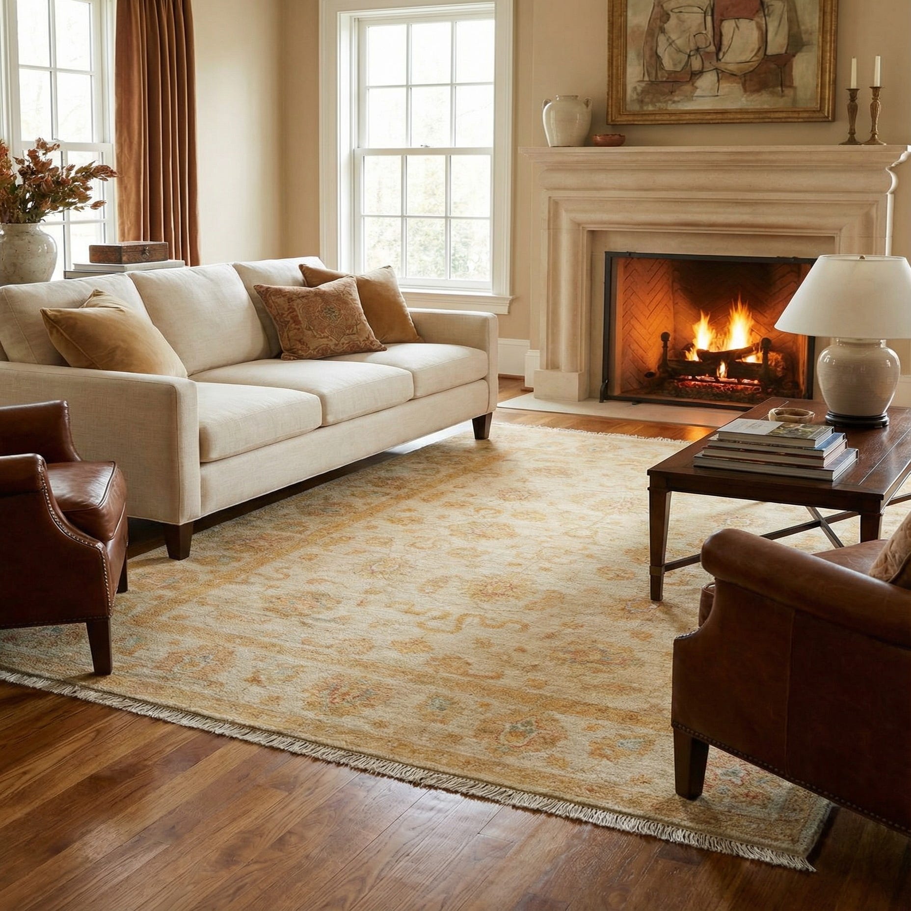 The balanced and neutral color palette makes this rug versatile for a variety of interior design scenarios. It is well-suited for living spaces that aim to evoke a sense of calm and elegance without overpowering the room's existing decor. It can easily integrate into spaces with a classic or transitional theme, where its timeless design can complement wooden furniture and natural textures.