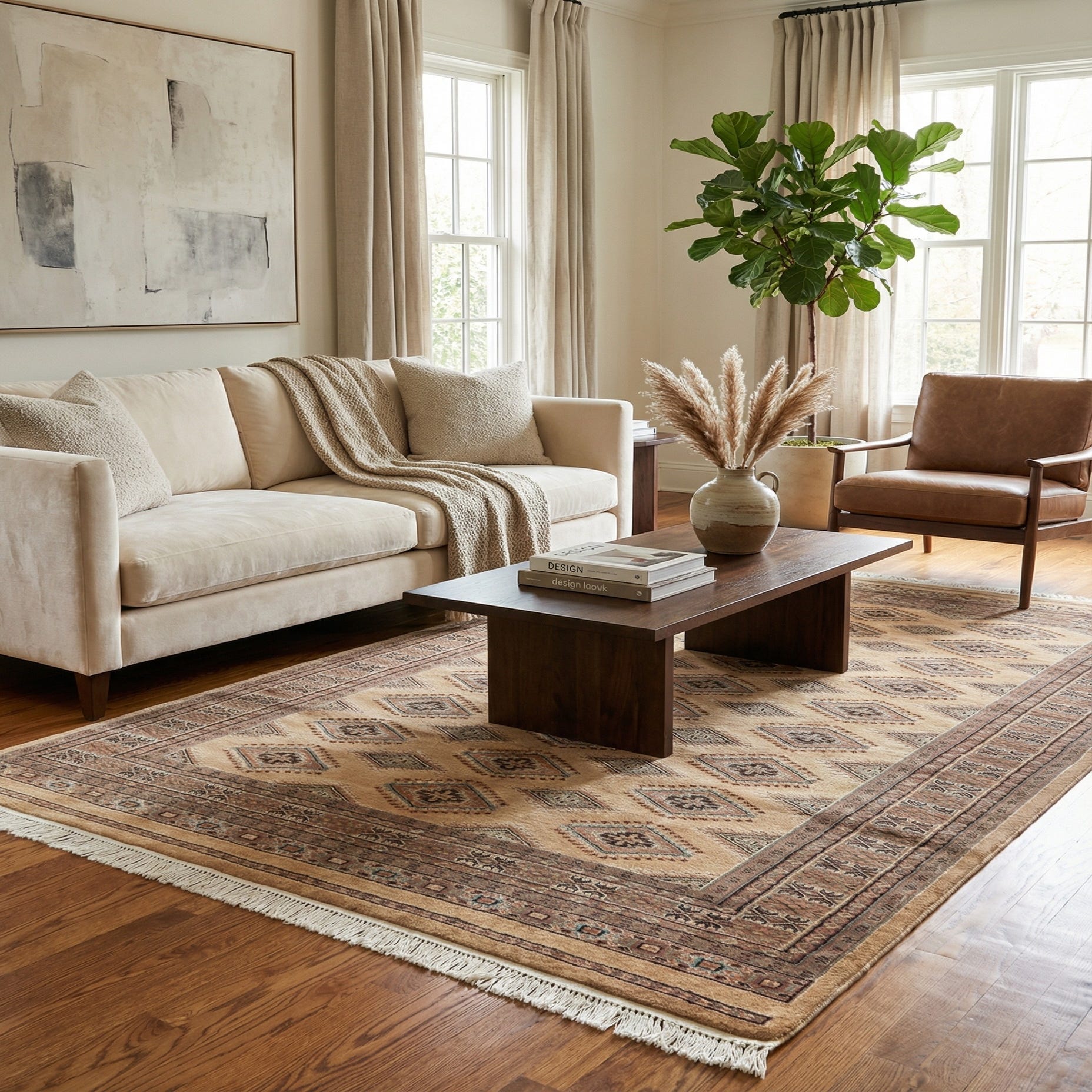 A 4x6 rectangular Karachi Royal rug in brown and tan with a diamond pattern and fringe.
