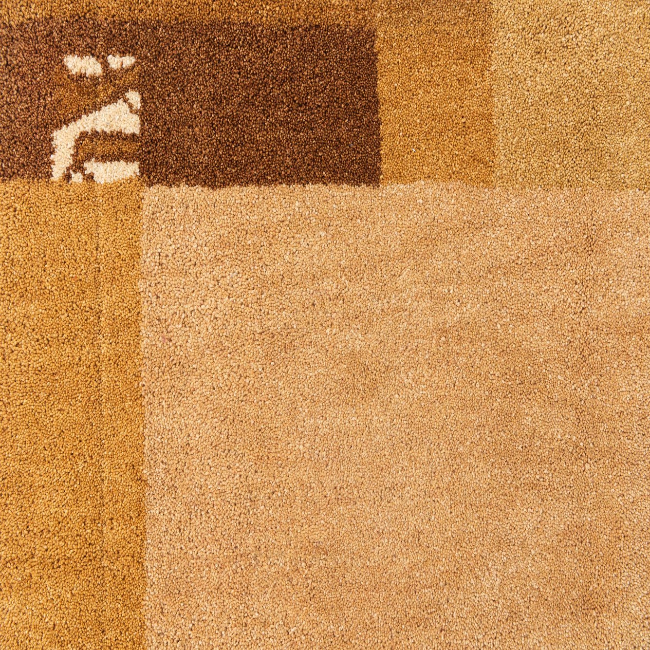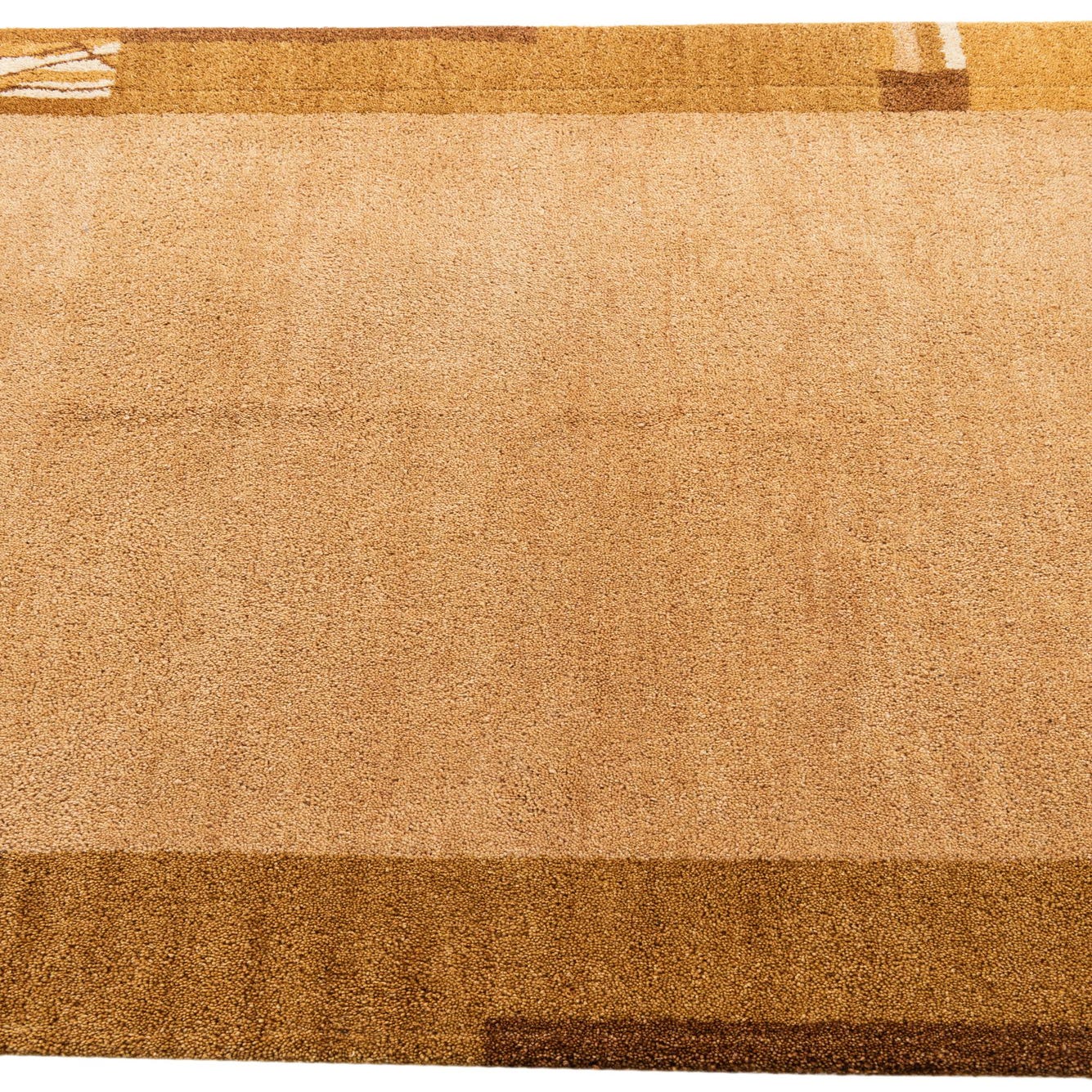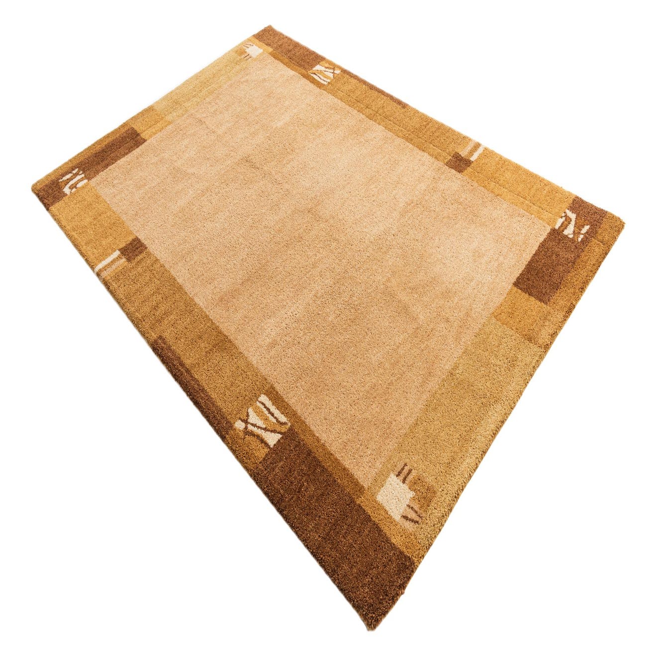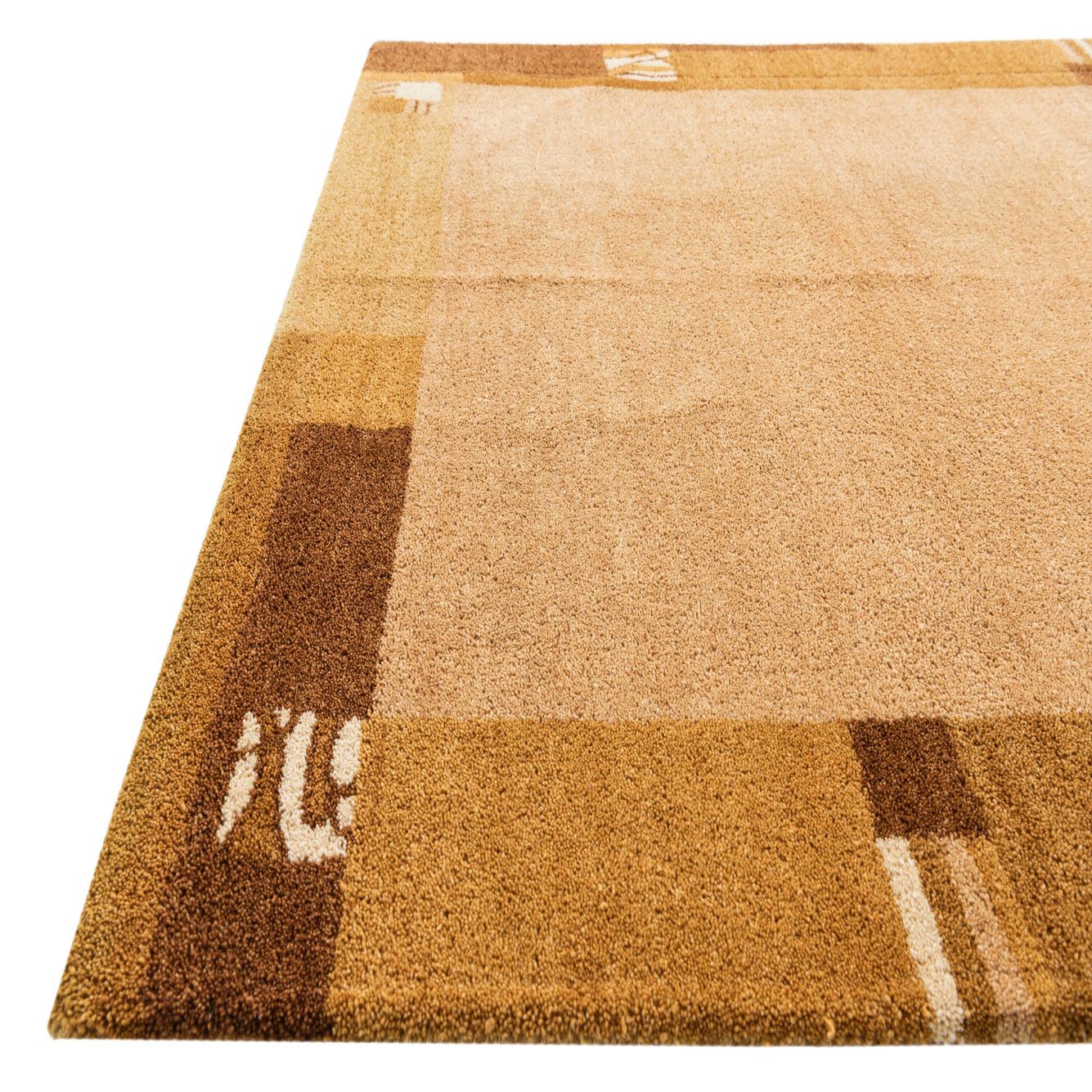 A 4x6 rectangular Kashkuli Gabbeh wool rug featuring a tan center with a modern abstract border in shades of brown, tan, and ivory.
