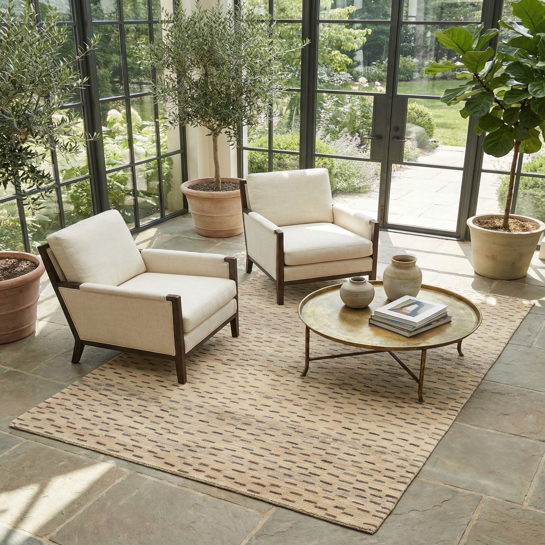 A 4x6 rectangular Kashkuli Persian wool rug in shades of brown and tan with a subtle dotted pattern.