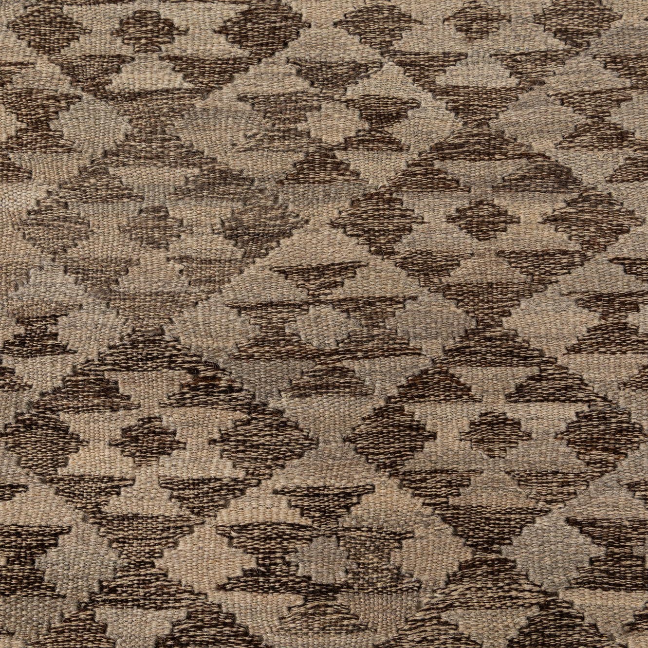 A 4x6 rectangular Kilim Maymana rug featuring a tribal geometric pattern in shades of brown, tan, and cream.