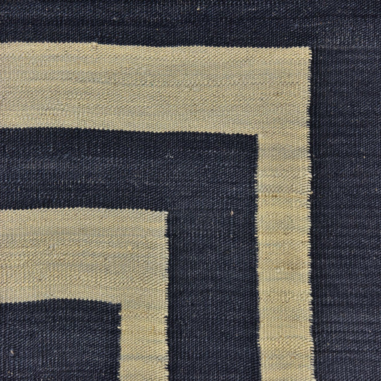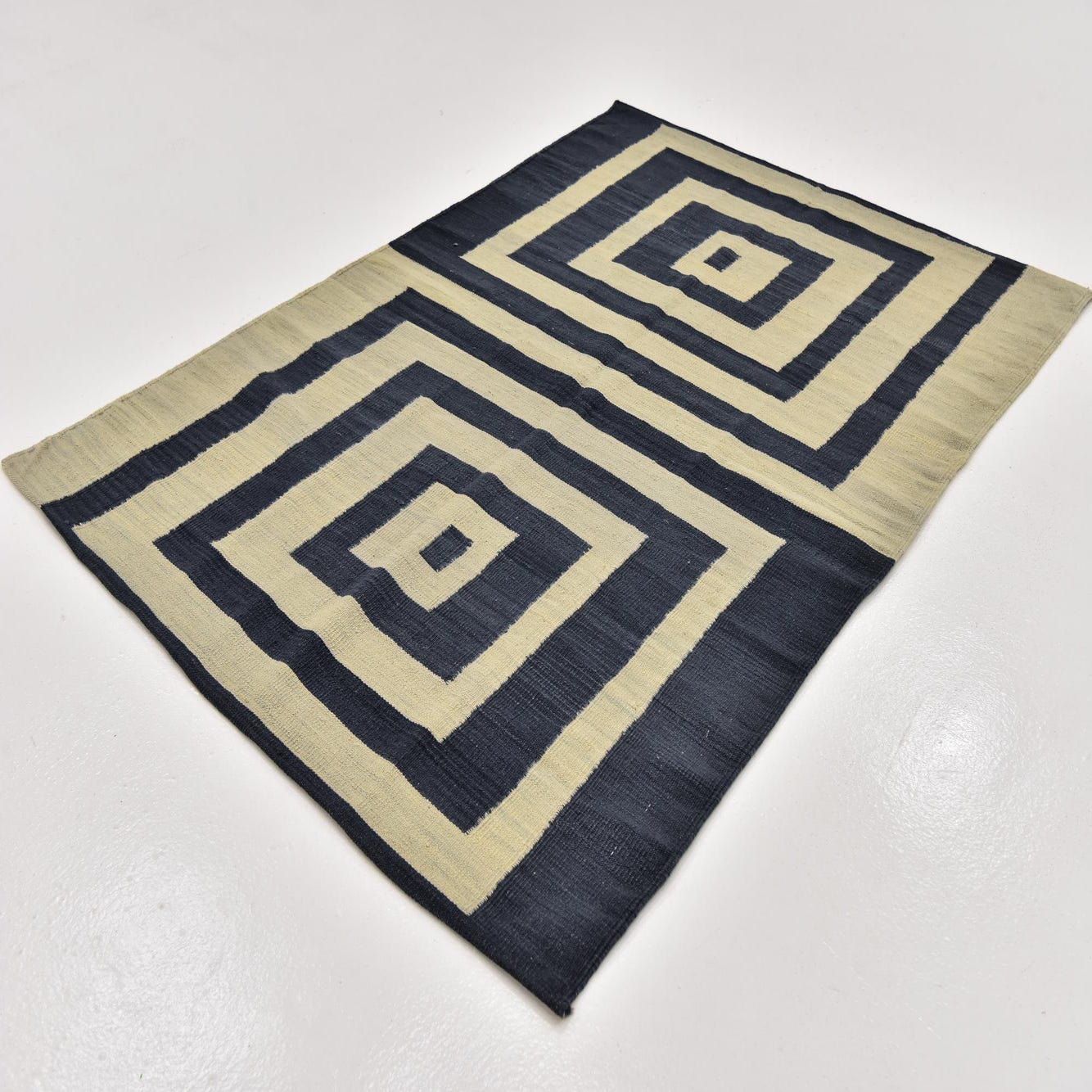 A 4x6 rectangular Kilim Modern wool rug featuring a bold geometric pattern of concentric squares in deep indigo and cream.