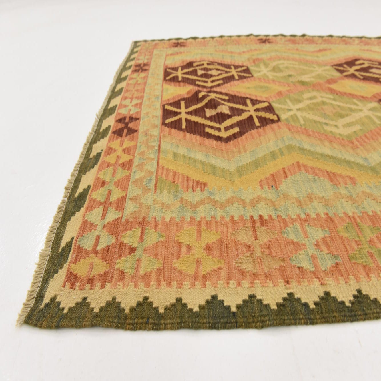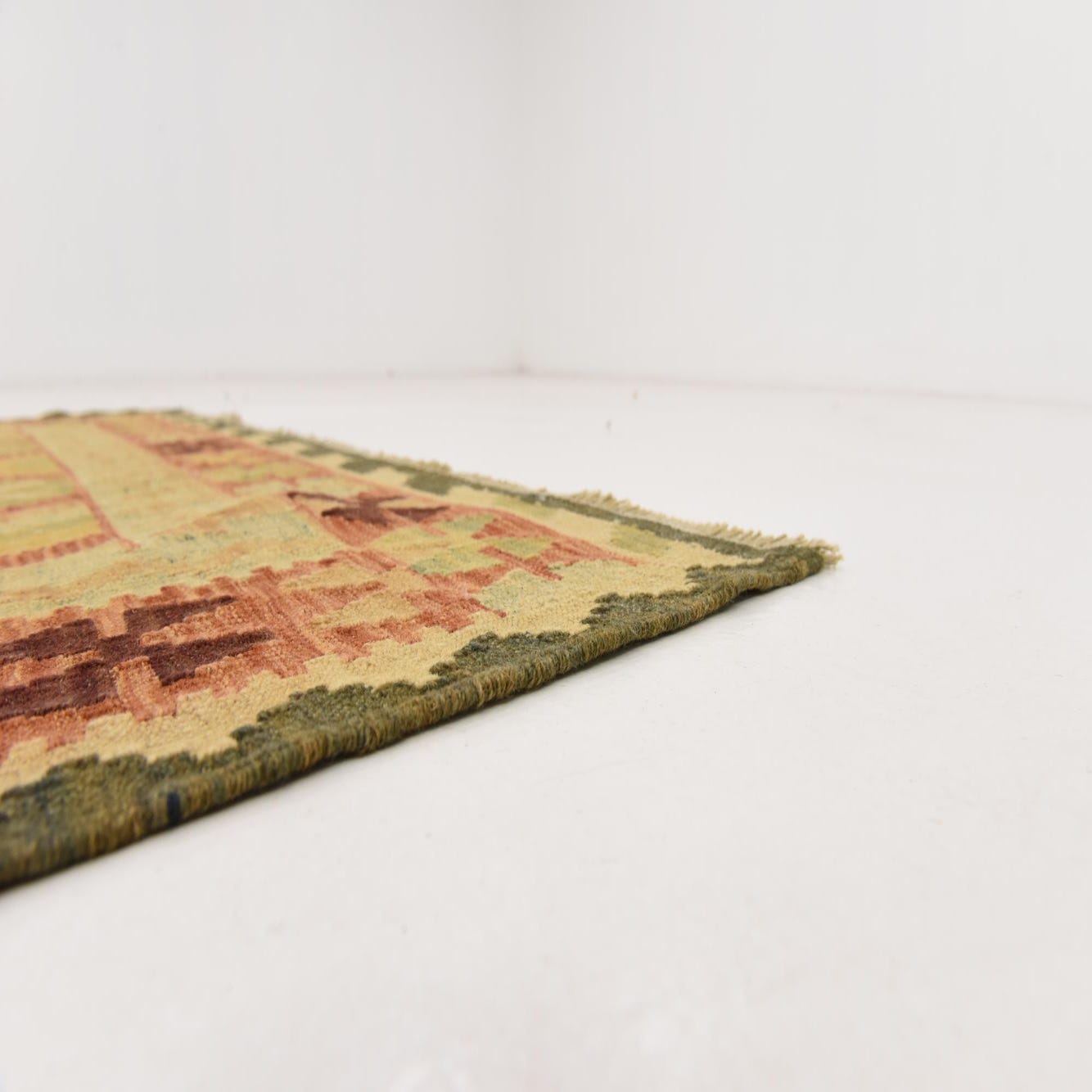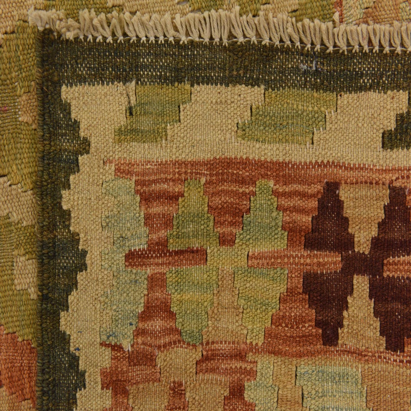 The rug's edges are finished with fringe, adding a traditional touch reminiscent of its cultural heritage. This piece's flatweave construction is in keeping with the classic Kilim style, characterized by a lightweight and low-profile texture.