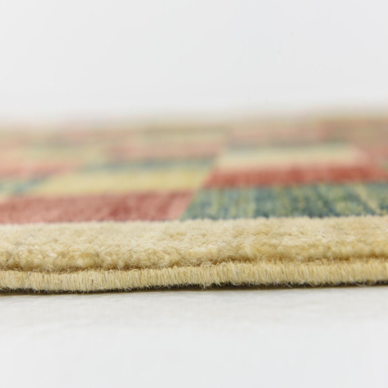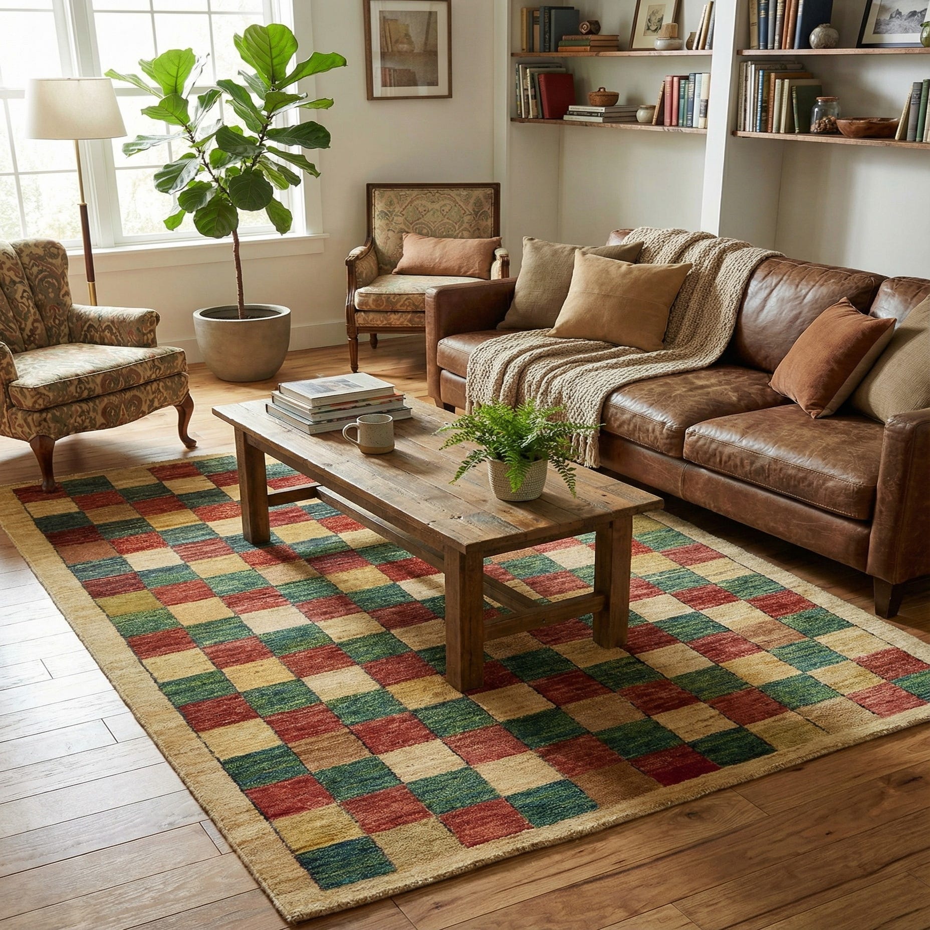 The Modern Ziegler rug, measuring 4x6, presents a bold checkered pattern, creatively adapting a classic design with a contemporary twist. Hand-knotted from 100% hand-spun wool, this rug offers a combination of durability and tactile pleasure, indicative of meticulous craftsmanship. The color palette includes warm and rustic tones of beige, red, green, brown, tan, and black, with the beige background providing a versatile base for the vivid squares.