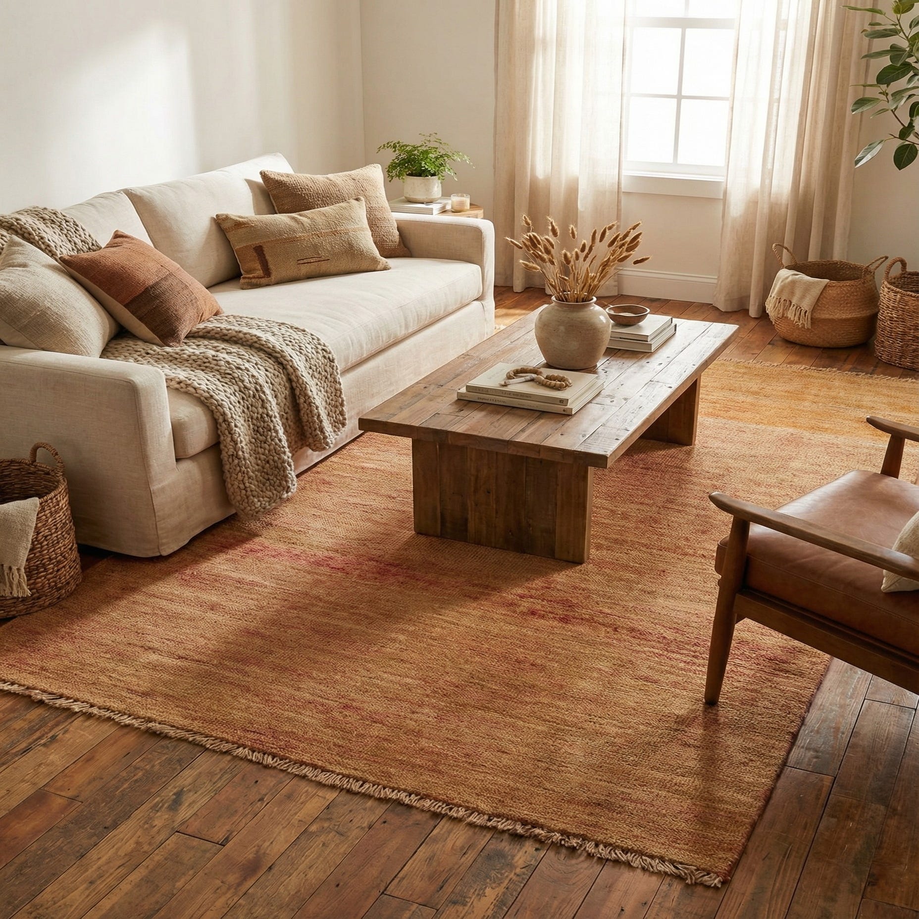 The soft beige base serves as a versatile foundation, making the rug suitable for a variety of interior design settings. The delicate orange and violet hues add a modest pop of color, enriching the space without overwhelming it. This rug would seamlessly integrate into contemporary spaces, enhance neutral-toned minimalist decor, or add a touch of understated elegance to a transitional living room.