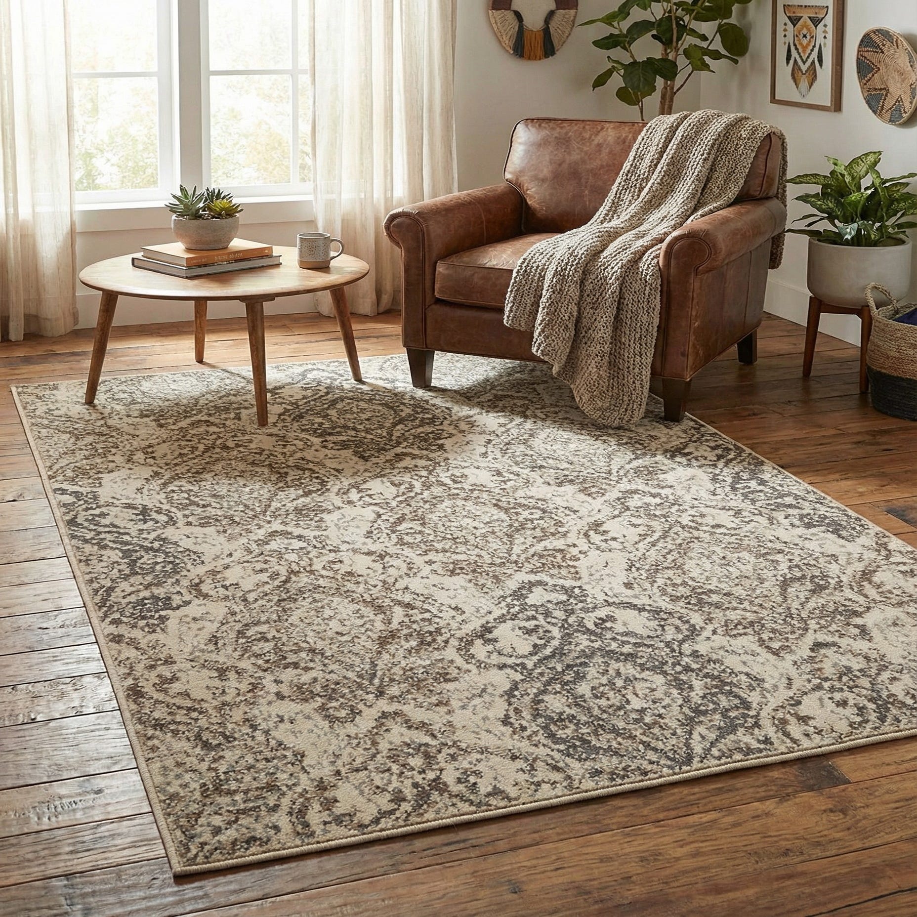 This rug works well under a small seating group or coffee table, as an anchor in a cozy living room, tucked under a bistro dining set, or beside the bed for a soft landing in the morning. Pair it with natural wood tones, leather or linen upholstery, and matte metal accents for a balanced, layered look that leans transitional — ideal for modern farmhouse, casual traditional, or neutral contemporary schemes.