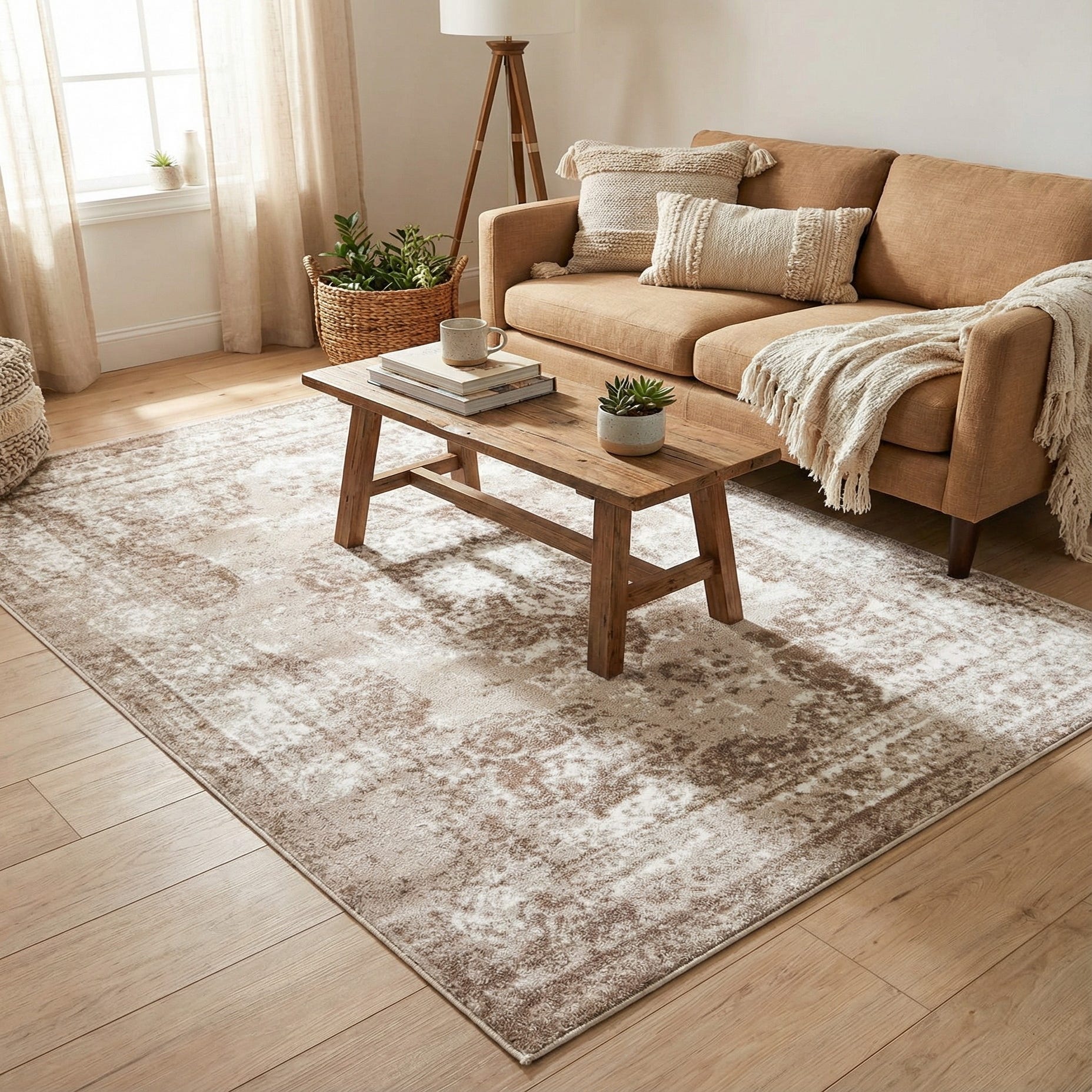 This rug pairs well with neutral, calming palettes—think light wood tables, linen upholstery, or leather seating—and works equally well in contemporary, modern farmhouse, or transitional interiors. Place it under a coffee table to anchor a living room seating area, layer it in a bedroom for added texture, or use it in an entryway to introduce warmth without overwhelming the space.