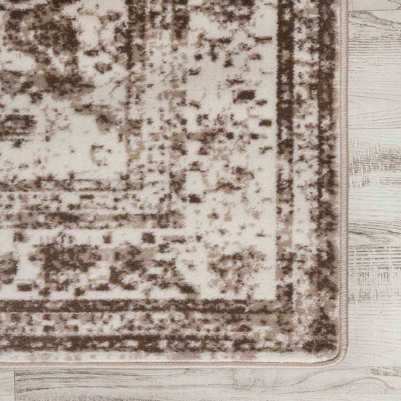 A softly distressed medallion pattern rests on a warm beige field, with ivory highlights and brown accents that create a lived-in, layered look. The vintage-inspired motif and subtle border read as gently worn rather than sharply defined, giving the rug a relaxed, transitional character. Machine made from 100% polypropylene, it has a low-profile pile with a smooth, slightly lustrous surface that feels soft underfoot while maintaining a structured weave.