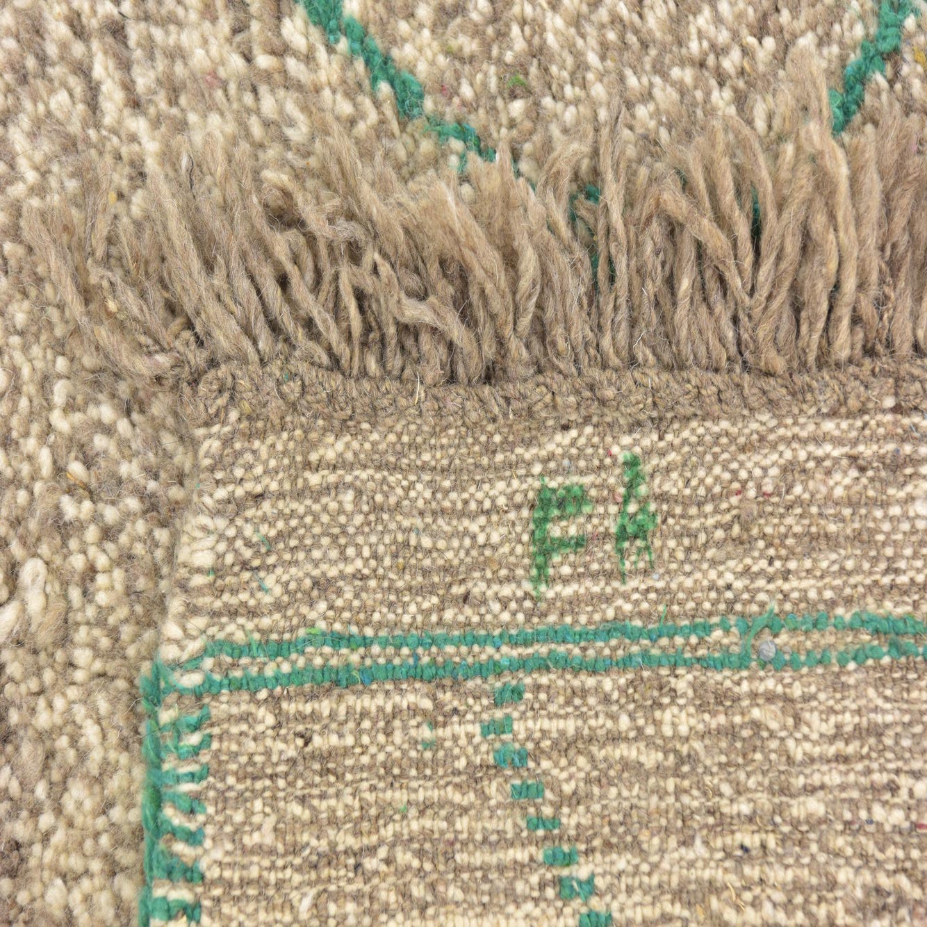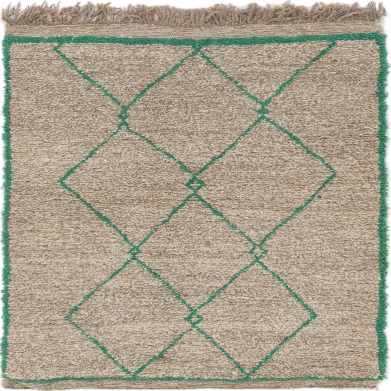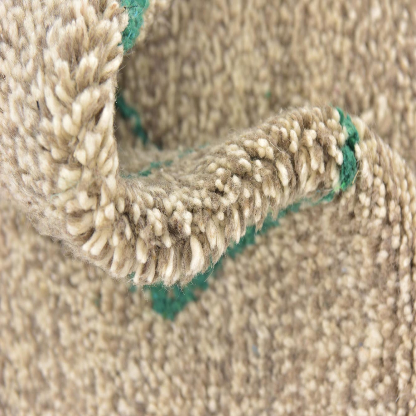 This Moroccan Collection rug offers a timeless charm with its hand-knotted construction of 100% pure wool, providing a durable and plush feel underfoot. The rug measures 4x6 feet and features a beige background, which brings warmth and versatility to any space it inhabits. Highlighting a simple yet captivating design, geometric shapes are outlined in a vibrant green against the ivory details, creating a visual focal point that is both inviting and calming. The texture of the wool pile adds a tactile element to the design, while the fringe edges contribute a traditional touch, enhancing the rug’s authentic appearance.