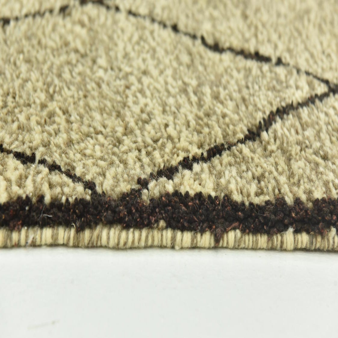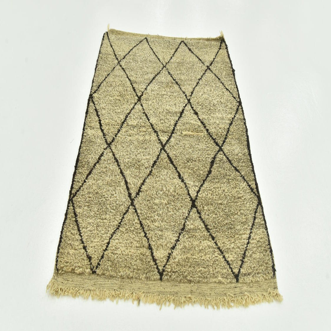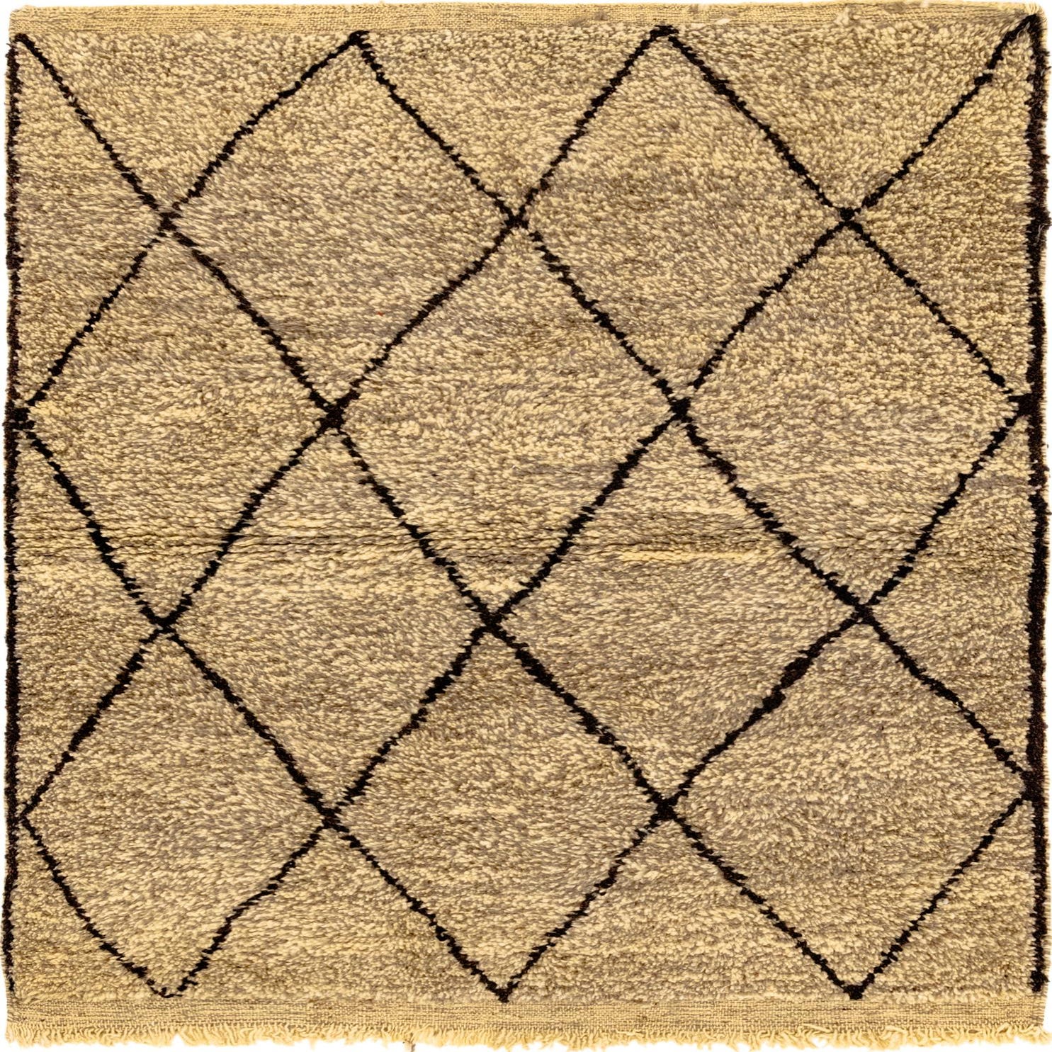 A 4x6 rectangular Moroccan shag rug in warm brown and ivory with a bold tribal diamond pattern.
