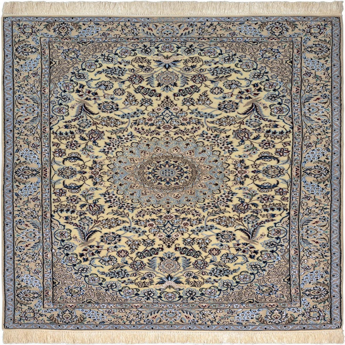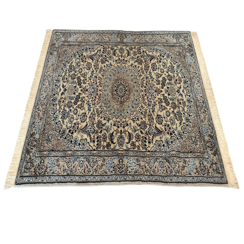 The Nain Collection wool and silk rug is handcrafted in a 4x6 size, providing a sense of timeless sophistication with its ornate design. The rug features a beige background, which serves as a neutral canvas for the intricate detailing that spans across its surface. A medley of navy, blue, and subtle accents of gray form a traditional floral and scrolling vine pattern that commands attention while maintaining an air of elegance.