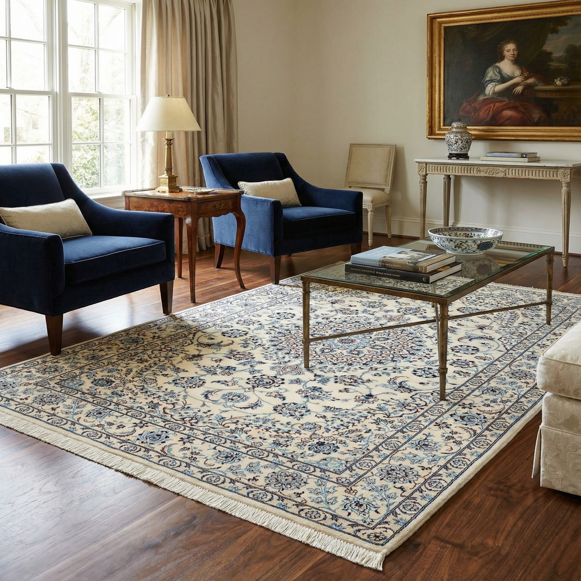 The rug's design showcases a central medallion surrounded by an array of floral motifs and intricate vine scrolls. Subtle accents of blue and brown add depth and character to the beige background, while the prominent border echoes the central pattern and creates a well-defined frame for the piece. The craftsmanship is evident in the clarity of the design and the precision of the weave.
