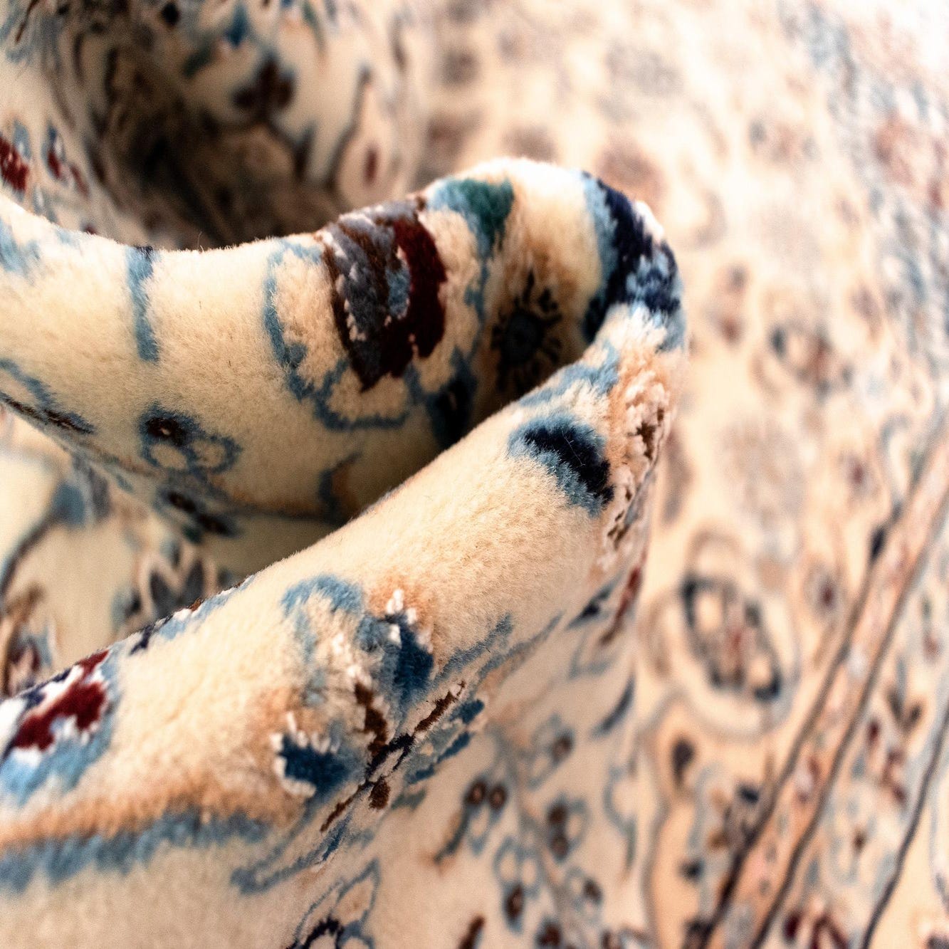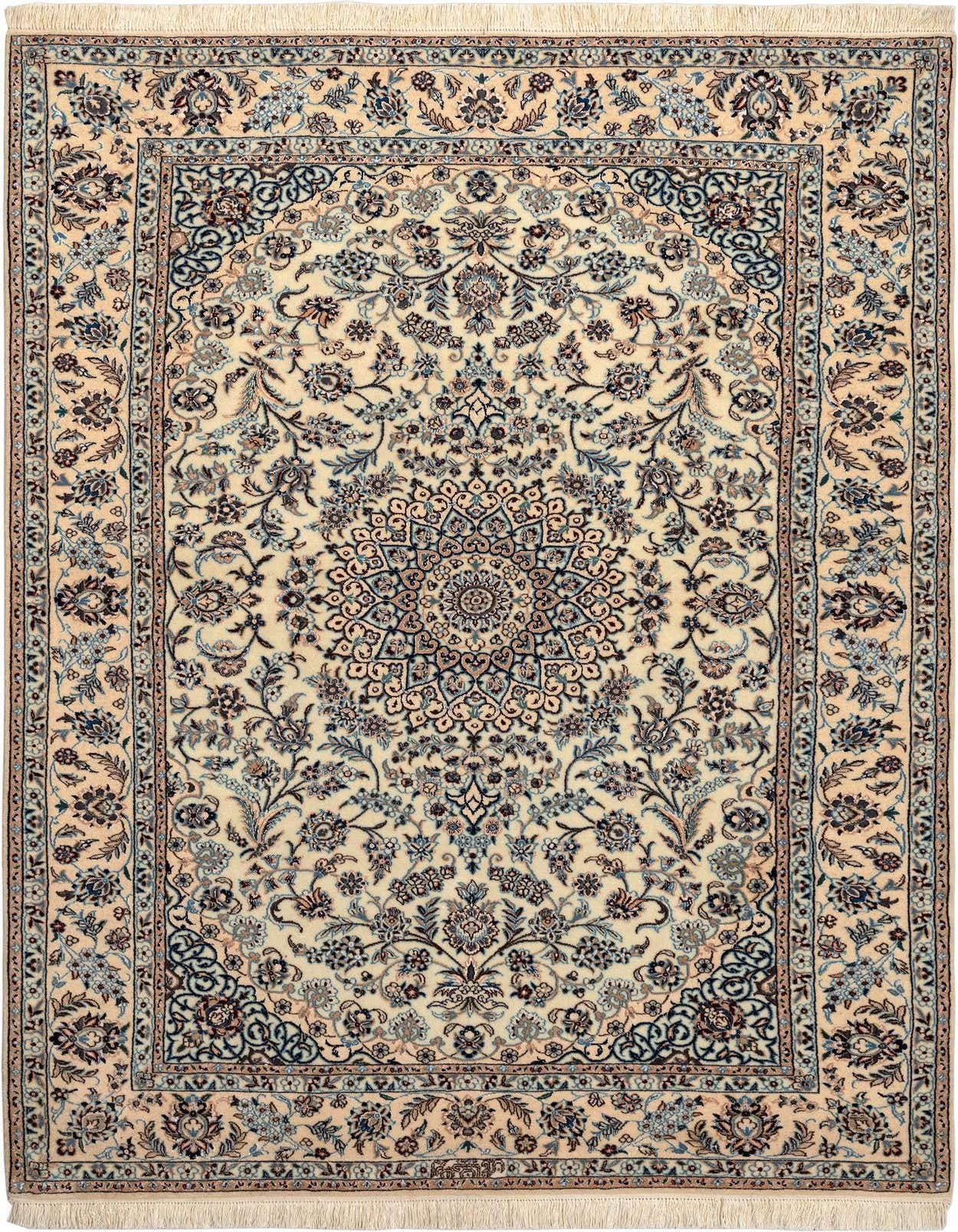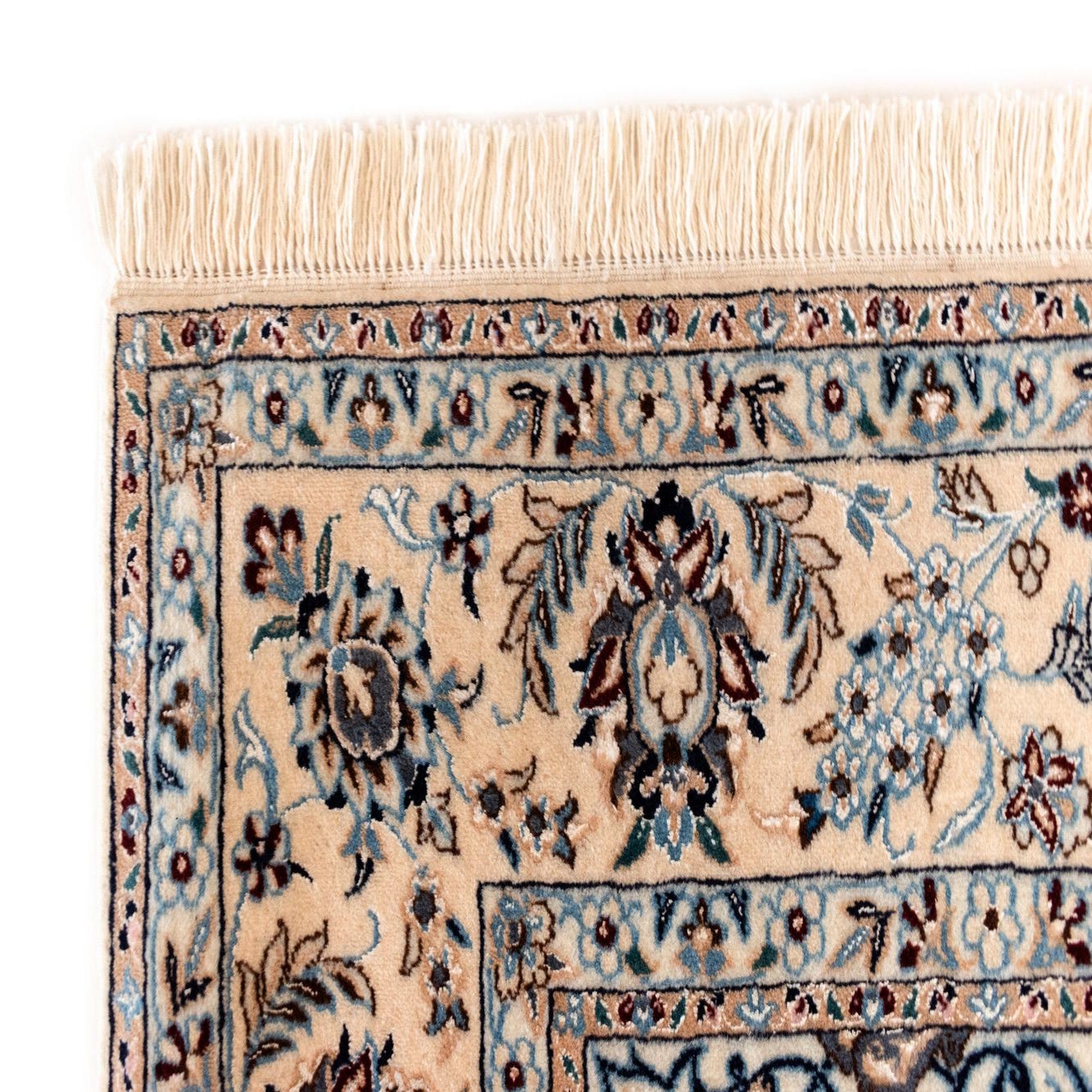 The Nain collection 4x6 rug, handcrafted with wool and silk, boasts a sophisticated beige background, elegantly highlighted by an intricate pattern of ornamental details. The detailed design showcases a harmonious blend of floral motifs centered around a refined medallion, with complementary borders framing the central tableau. The color palette is carefully balanced, incorporating shades of blue, brown, and subtle hints of ivory, which add depth and contrast to the overall design.