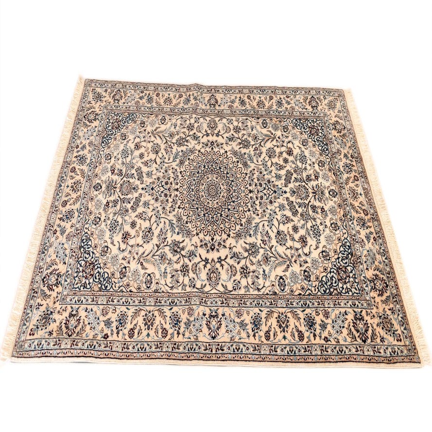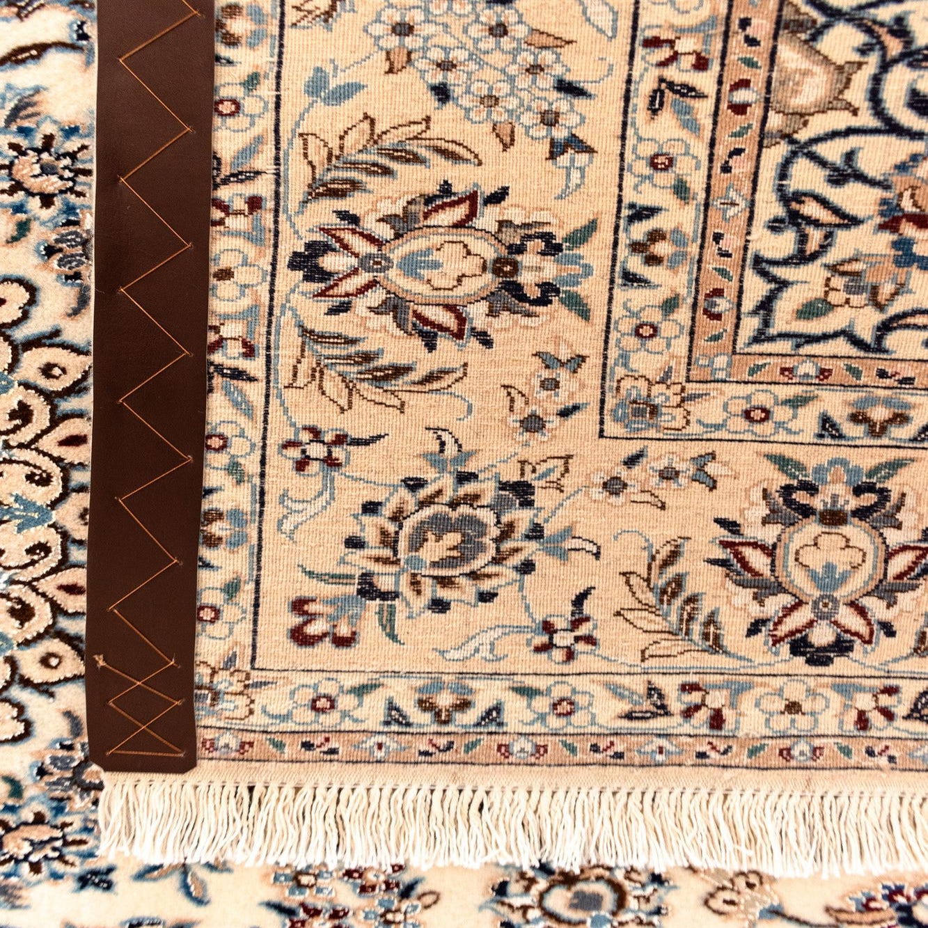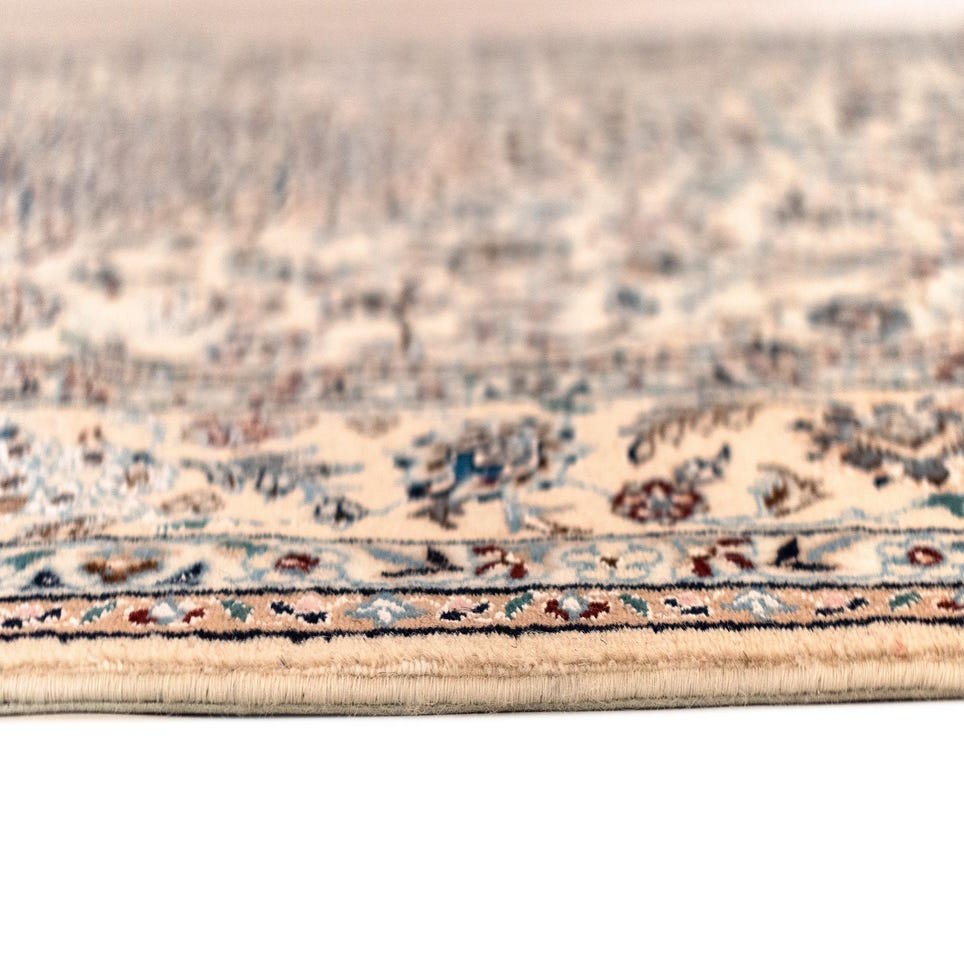 The Nain collection 4x6 rug, handcrafted with wool and silk, boasts a sophisticated beige background, elegantly highlighted by an intricate pattern of ornamental details. The detailed design showcases a harmonious blend of floral motifs centered around a refined medallion, with complementary borders framing the central tableau. The color palette is carefully balanced, incorporating shades of blue, brown, and subtle hints of ivory, which add depth and contrast to the overall design.