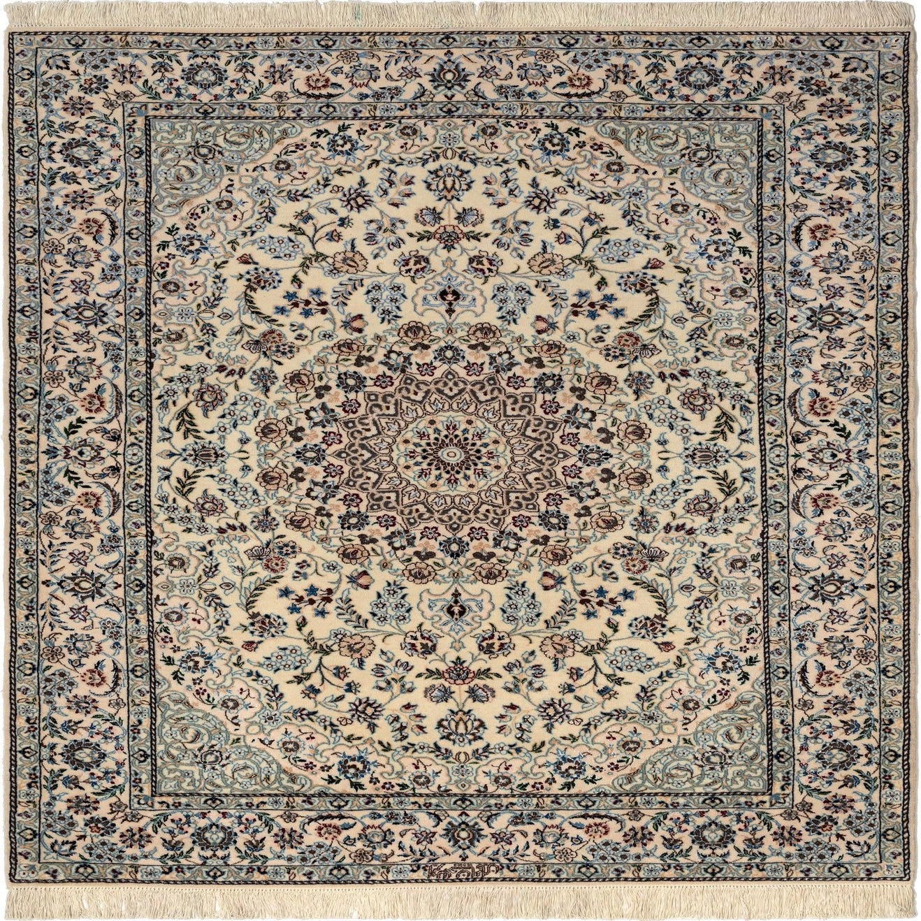 A 4x6 rectangular Persian rug featuring a detailed medallion and floral pattern in ivory, cream, brown, and blue tones.