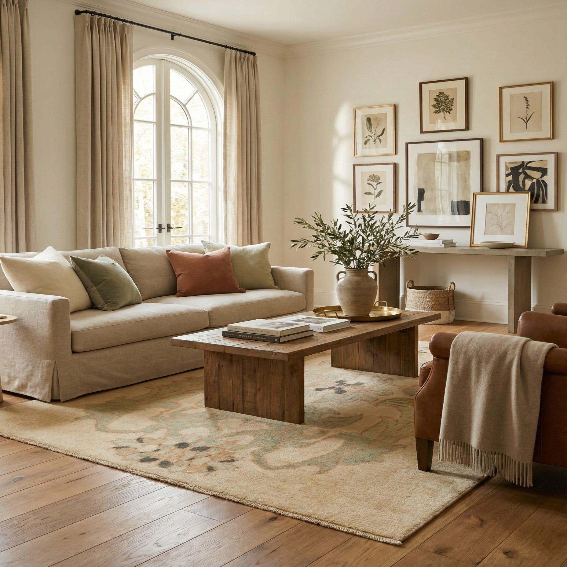 Primary color is Beige. Colors in this rug include: Beige, Blue, Light Green, Olive, Peach.