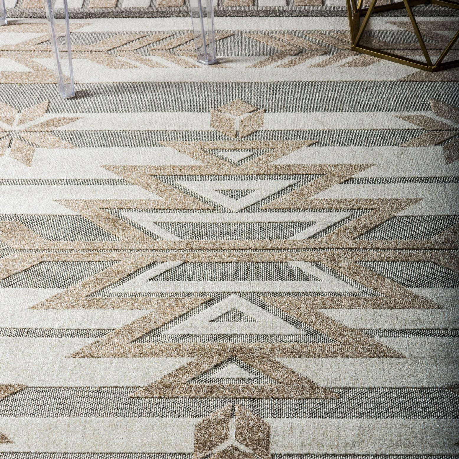 A grounded, geometric pattern gives this rug a clean, modern look with a nod to Southwestern motifs. A beige field provides a soft, neutral backdrop for bold light-brown and brown accents: a stepped central medallion, directional arrow bands, and star-like motifs sit within subtle horizontal striping and a checked border. The machine-made construction from 100% polypropylene produces a low-pile, tightly woven surface that feels smooth and firm underfoot while preserving the crisp definition of each design element.