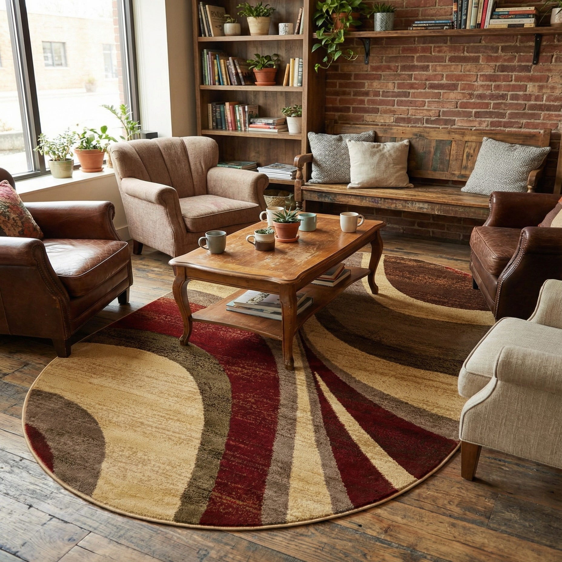 This oval piece is well-suited to small seating areas, entryways, or tucked beneath a round dining table to reinforce curved lines in the room. Pair it with warm wood finishes, leather seating or neutral upholstery to let the rich burgundy and earthy olive stand out, or use charcoal and navy accents to bring out the cooler grays and blue. The rounded shape and directional pattern add visual flow that helps unify contemporary or transitional interiors.